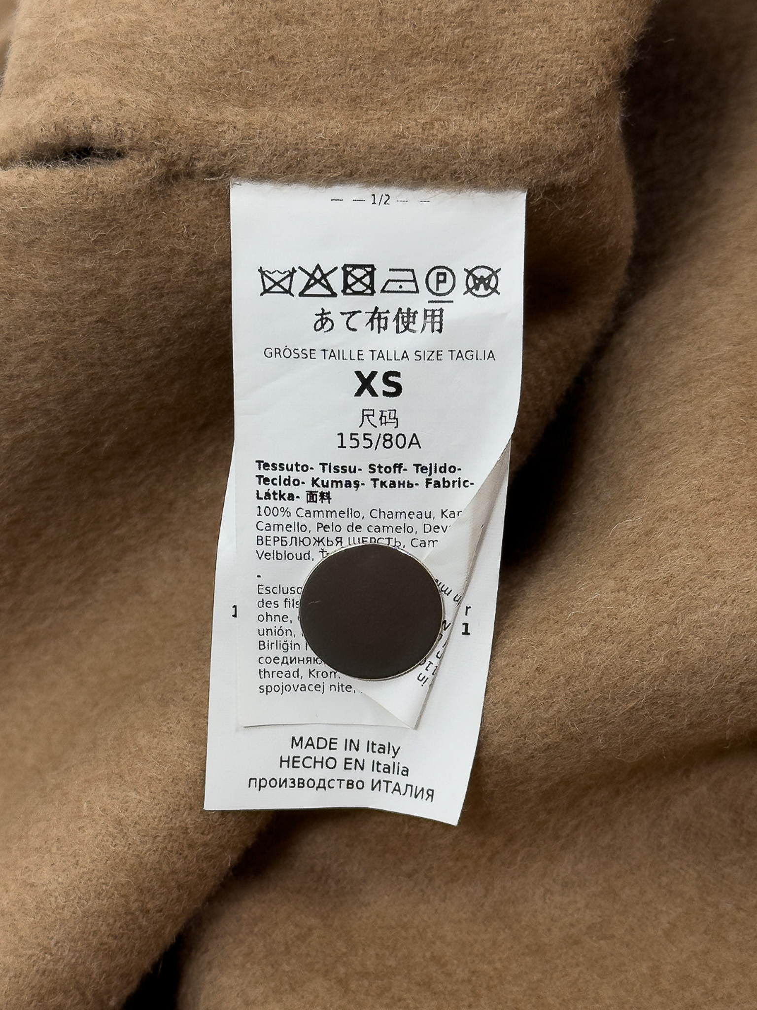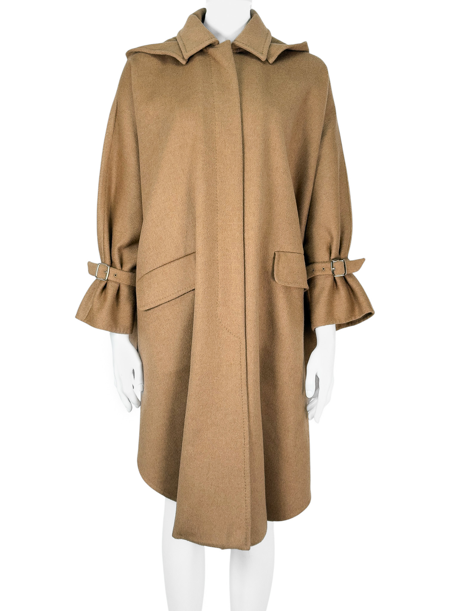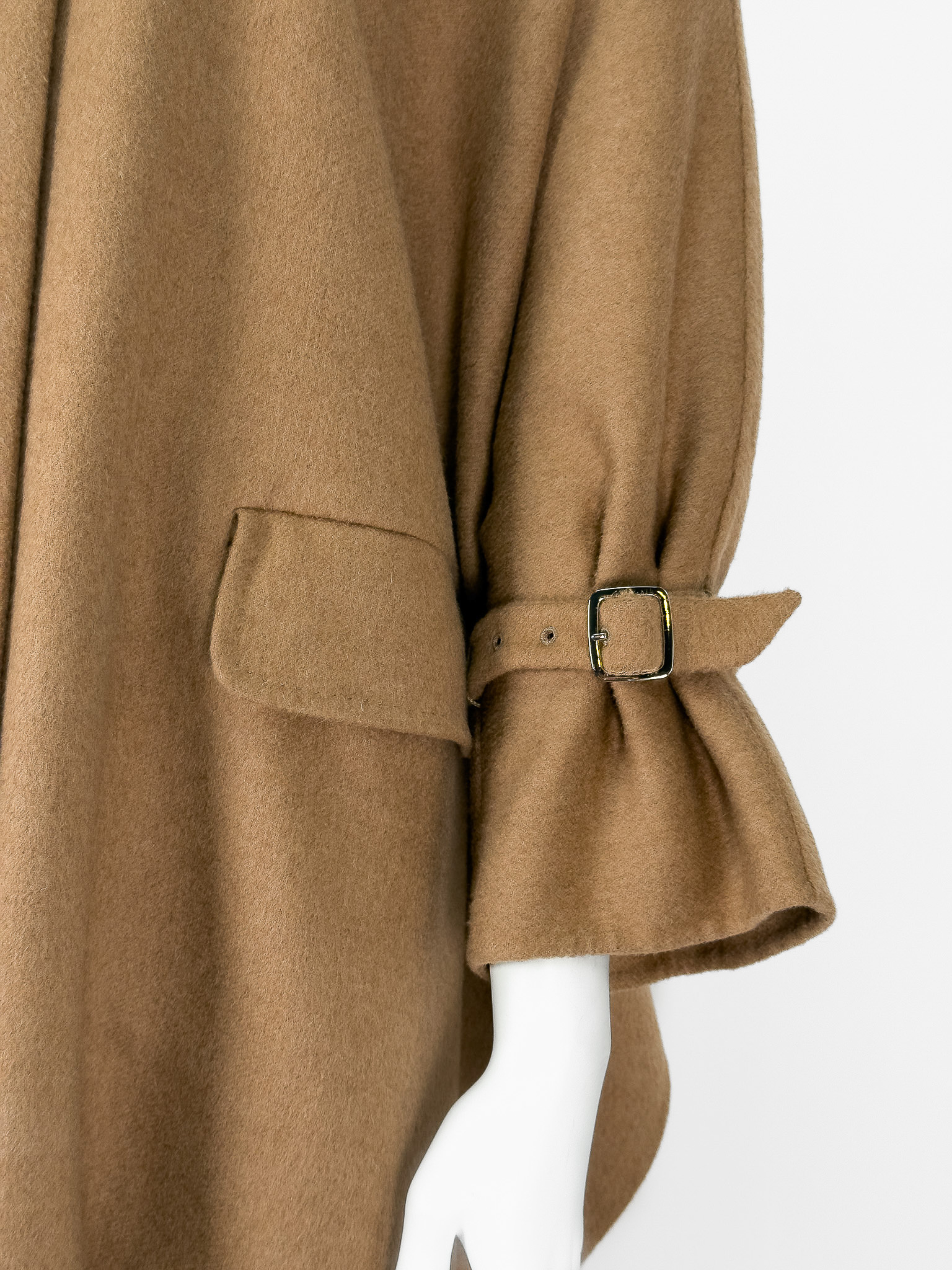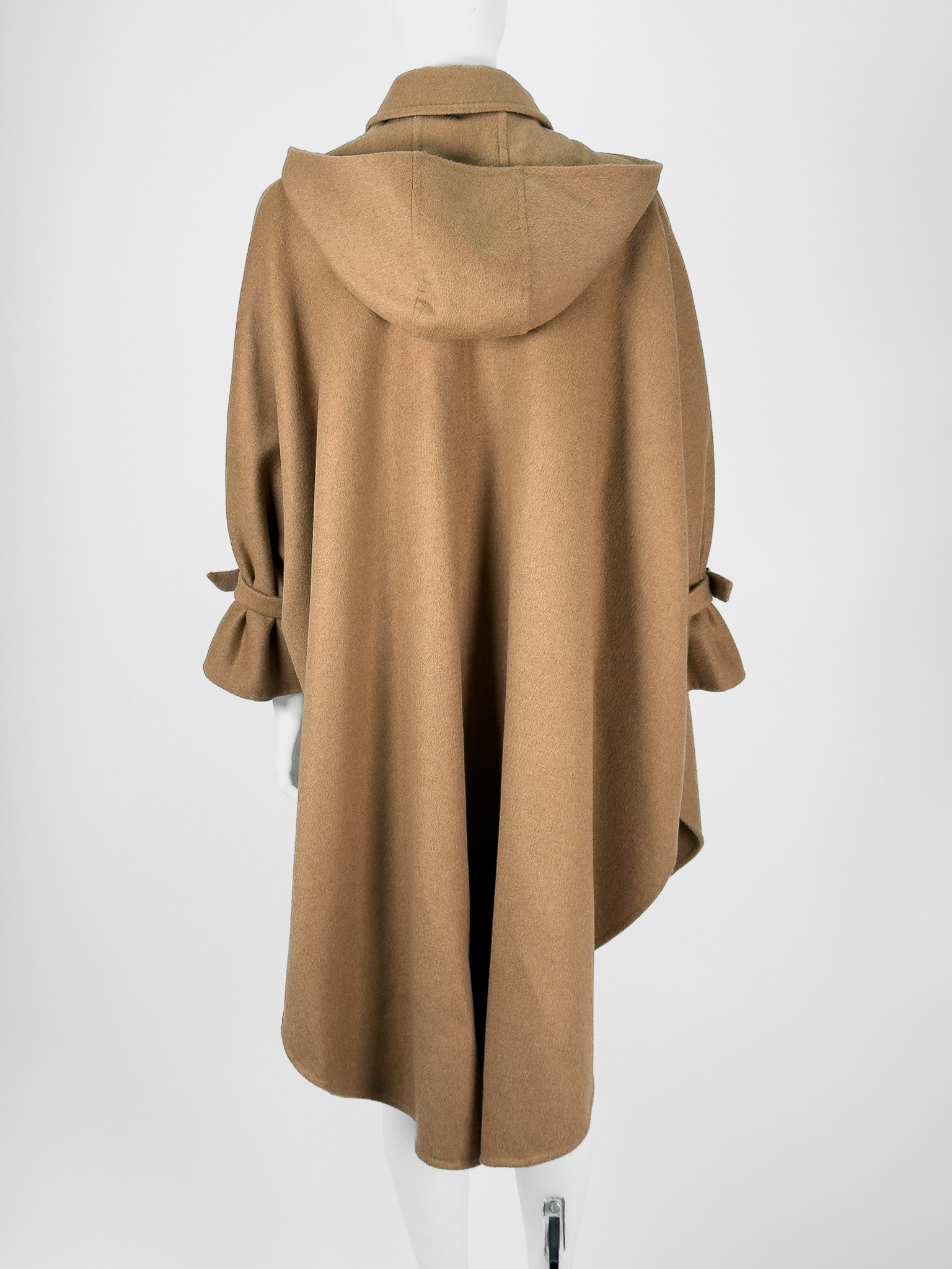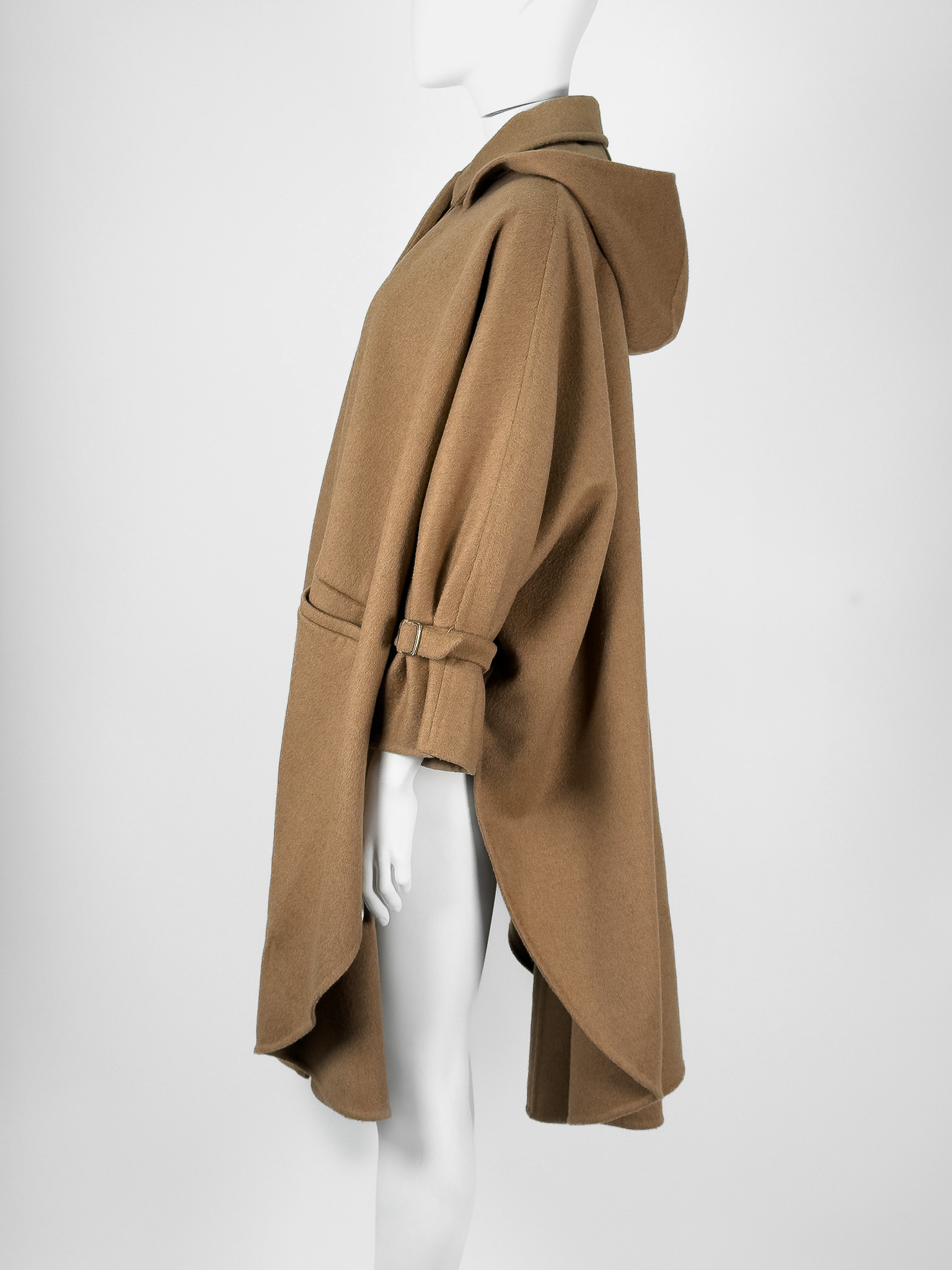 "Camelowy płaszcz w formie poncha z odpinanym kapturem, długi, szeroki luźny krój, zapinany na kryte guziki oraz sprzączkę, kołnierzyk, dwie kryte kieszenie z klapami po bokach, rozcięcia po bokach, brak podszewki, regulowane paski przy mankietach wykończone złotą sprzączką. Rozmiar z metki XS. Skład: 100% wielbłąd. Wymiary: szerokość mierzona od pachy do pachy 105cm, długość całkowita 106cm."