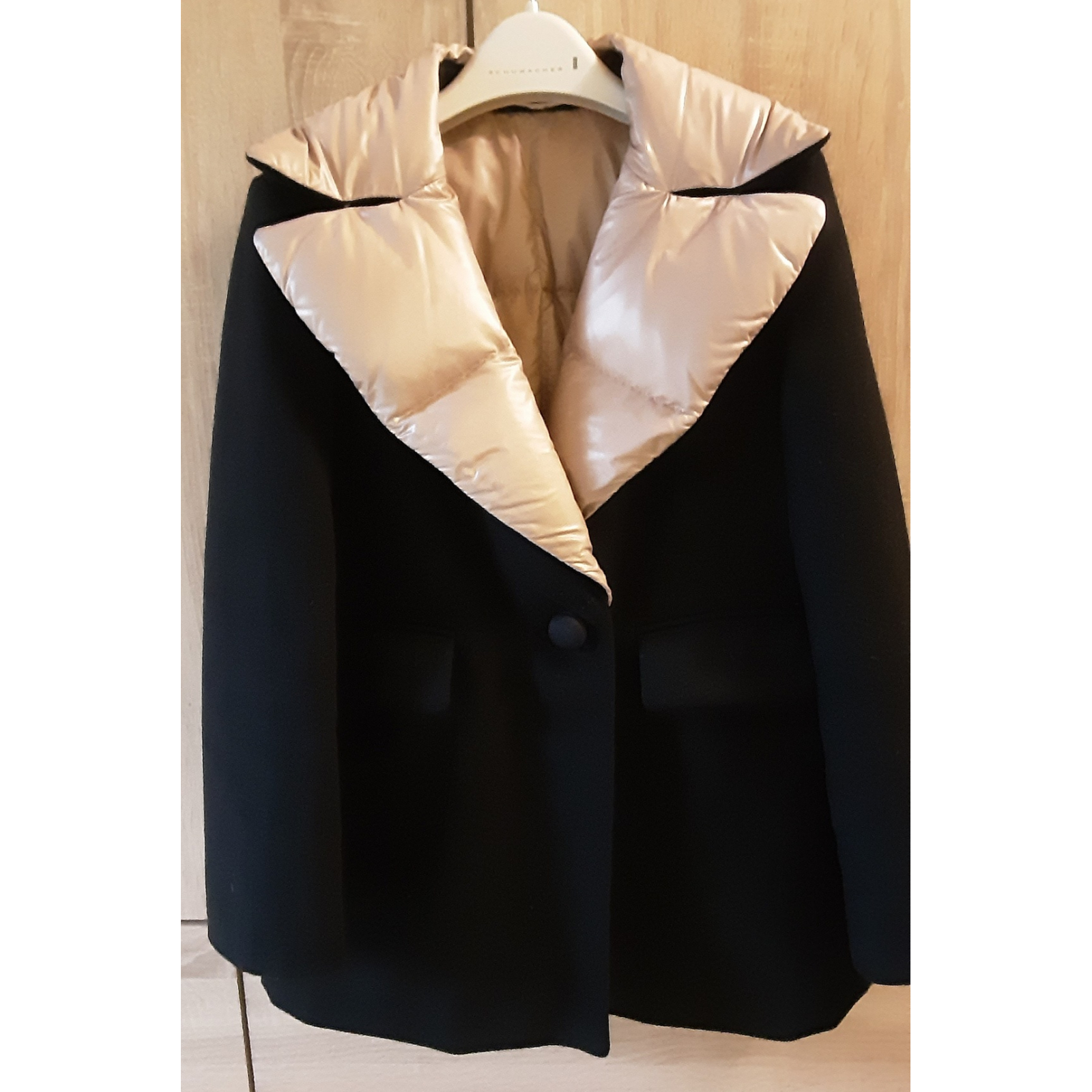 "krótki czarny płaszcz z jasno różową puchową podszewką oraz kołnierzem, zapinany na ozdobny guzik, z przodu kieszenie z klapami. Rozmiar S. Wymiary: szer. ramion 40cm, szer. biustu 45 cm, dł. całkowita 68 cm , dł. rękawa 56 cm."