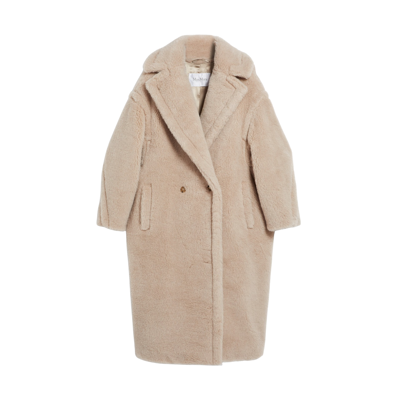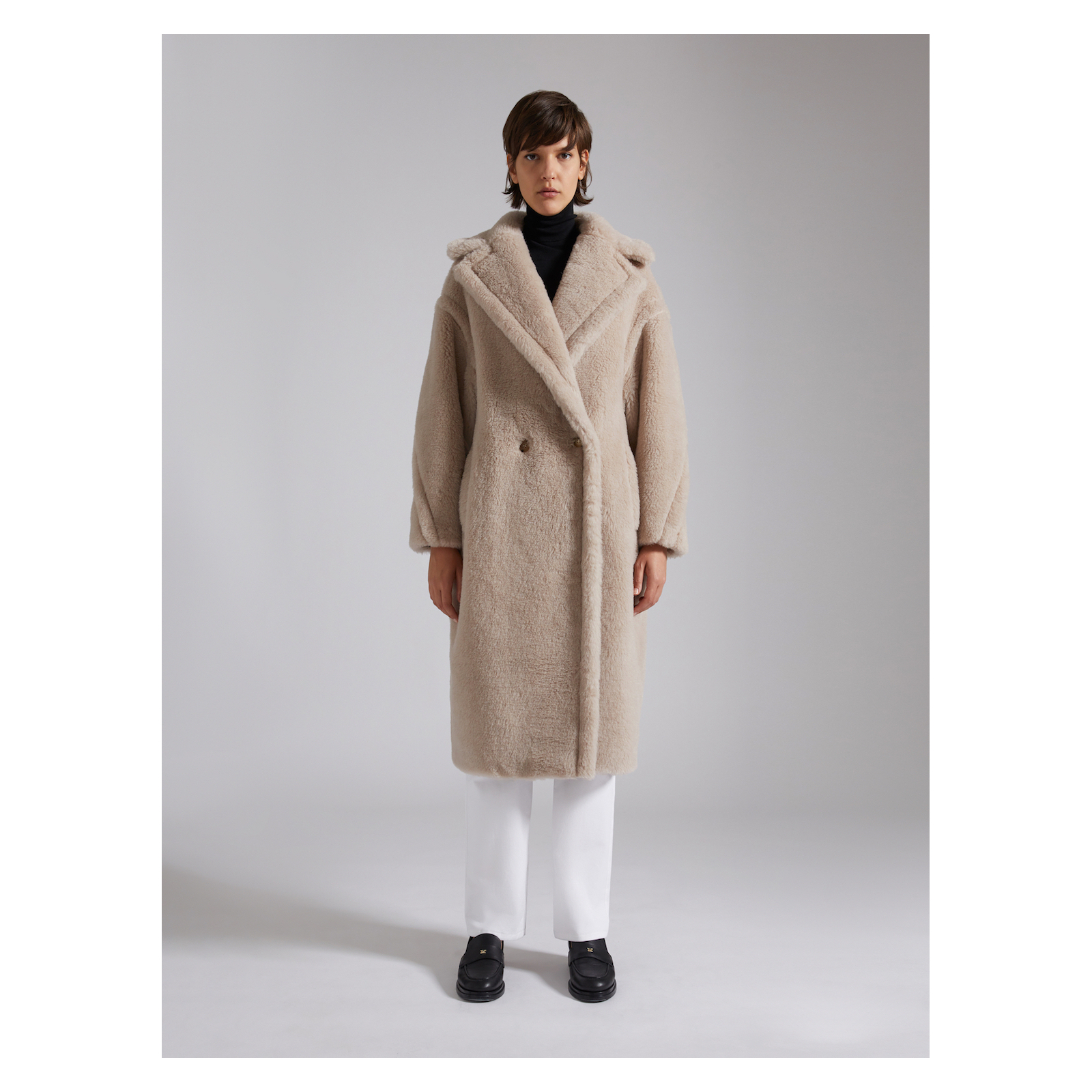 "długi beżowy płaszcz model Teddy, zapinany na jeden guzik, boczne kieszenie, podszewka. Rozmiar S. Skład: 62% alpaka, 26% virgin wool, 12% jedwab. Wymiary: szer. ramion 50 cm, szer. biustu 59 cm, szer. talii 56 cm, dł. całkowita 111 cm, dł. rękawa 46 cm."