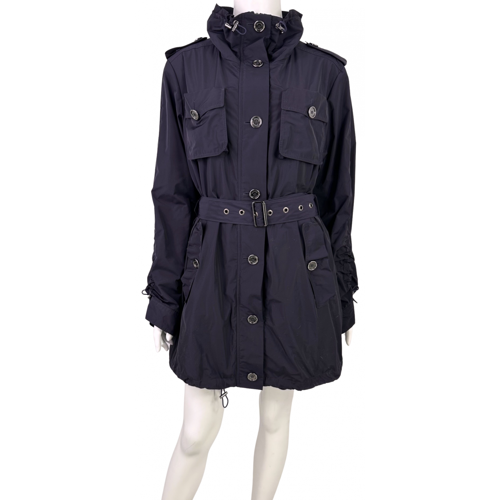 "fioletowa kurtka w formie płaszcza, zapinana na kryty suwak i logowane guziki, kieszenie z klapami na piersiach i z boku, ściągacz przy rękawie i na dole, pasek w talii, patki na ramionach, podszewka. Rozmiar IT 42. Skład: 100% poliester. Wymiary: szer. ramion 44 cm, szer. biustu 52 cm, szer. talii 45 cm, dł. całkowita 83 cm, dł. rękawa 60 cm."
