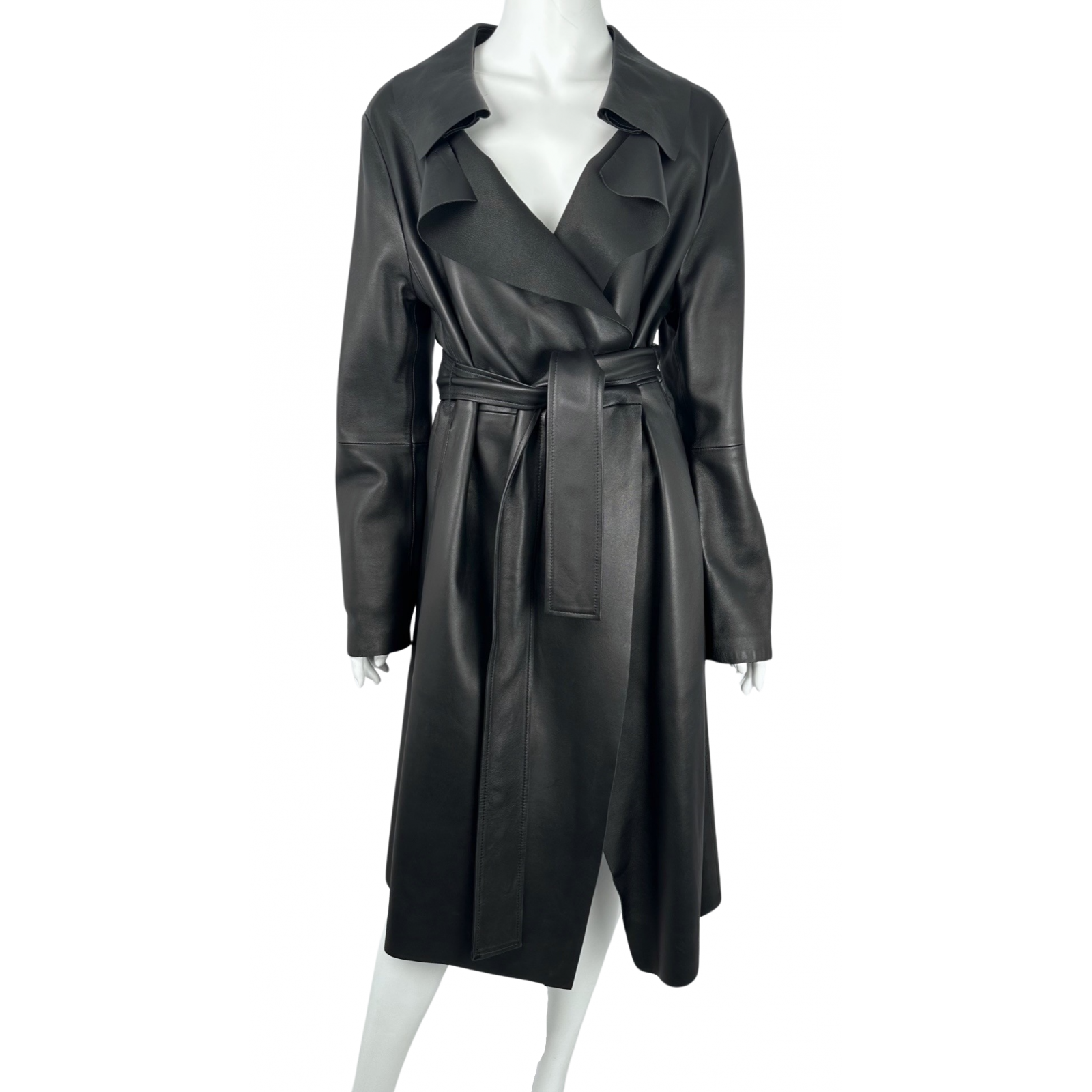 "Czarny skórzany płaszcz za kolano. Model leather volumes coat. Ma surowy, a zarazem i elegancki fason. Dodatkowe przeszycia na całej długości i na rękawach nie tylko korzystnie wpływają na prezentację sylwetki, ale są doskonałym wzmocnieniem i dodatkowym elementem ozdobnym. Ma swobodnie opadający kołnierz. Zapinany jest na dwa guziki. Z tyłu ma długie rozcięcie ułatwiające chodzenie i dodające mu stylu. W zestawie z paskiem, uszytym z podwójnej warstwy skóry, który zawiązany w talii nadaje mu fason trencza. Rozmiar: 38 (3). Skład: 100% skóra jagnięca. Dł. (mierzona od karku): 100 cm, szer. (mierzona w pasie): 54 cm, szer. (mierzona od pachy do pachy): 59 cm, dł. rękawa (mierzona od pachy): 54 cm, szer. rękawa (mierzona u dołu): 14 cm, szer. rękawa (mierzona na linii pachy): 16 cm, dł. paska: 174 cm, szer. paska: 6 cm."