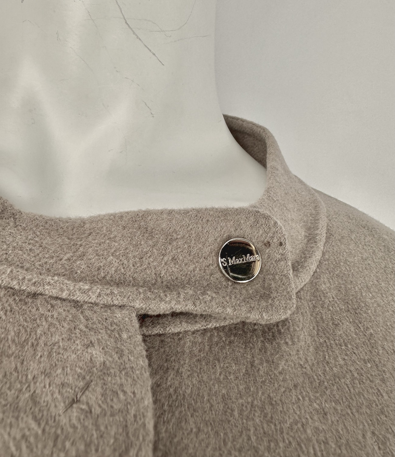 "beżowy wełniany płaszcz, zapinany na zatrzaski, długi rękaw, przy dekolcie mały logowany guzik. Rozmiar 38. Skład: 82% virgin wool, 18% angora. Wymiary: dł całkowita 87cm, szer ramiona 40cm, szer biust 50cm, dł rękawa 62cm.