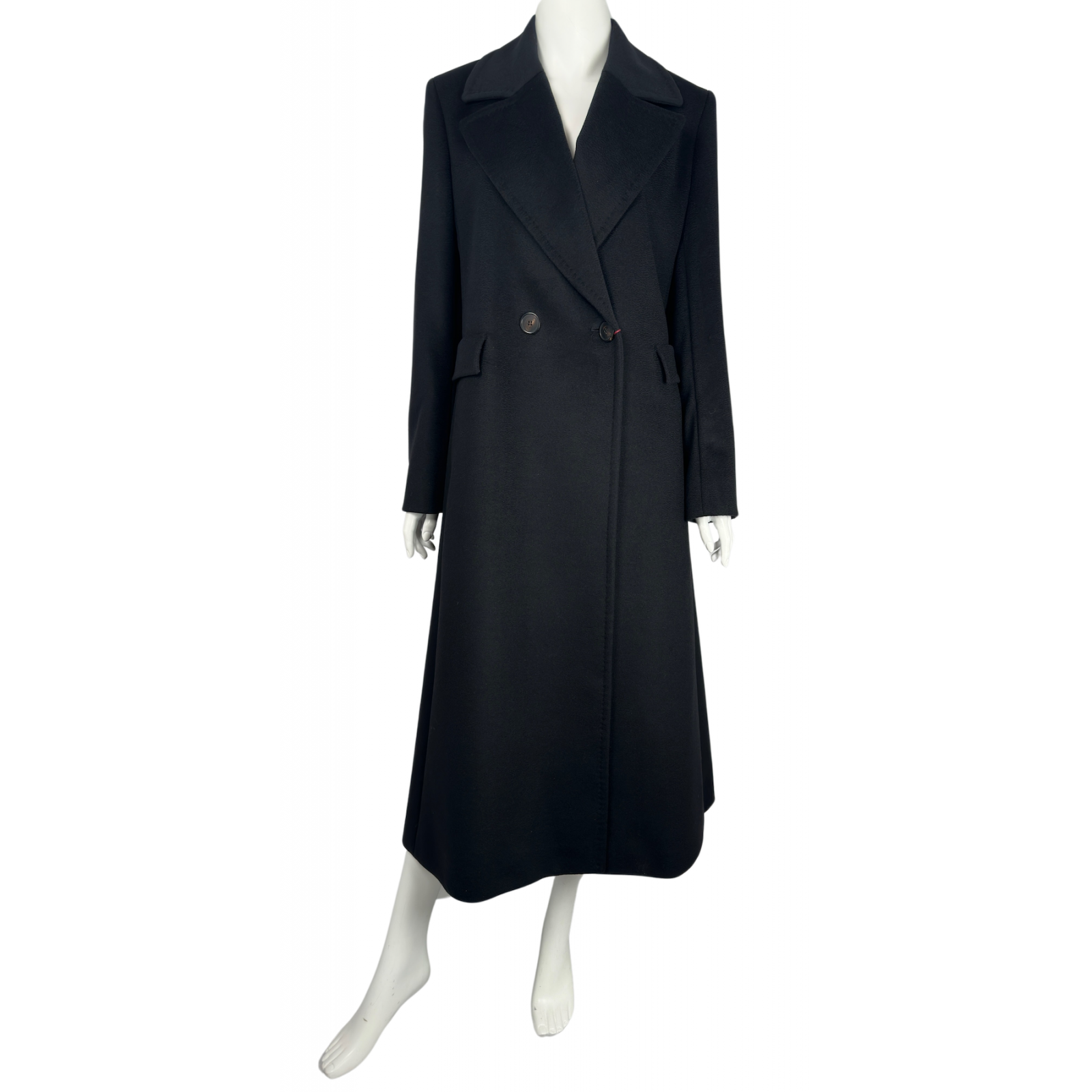 "Wełniany, długi płaszcz na dwa guziki w kolorze czarnym. Z przodu ma dwie ozdobne klapy, pod którymi (po skosie) wszyte są kieszenie. Ma liczne, modelujące sylwetkę przeszycia, które przy kołnierzu oraz wzdłuż kręgosłupa podkreślone są wyraźnym stębnowaniem. Dekolt w kształcie litery "V" wykańcza kołnierz o ostrych brzegach, układających się w karo. Nowy z metką. Rozmiar: 40. Skład: 100% wełna, podszewka: 100% wiskoza. MaxMara Studio. Wymiary: dł. całkowita 124 cm, szer. ramiona 40 cm, szer. talia 48 cm"