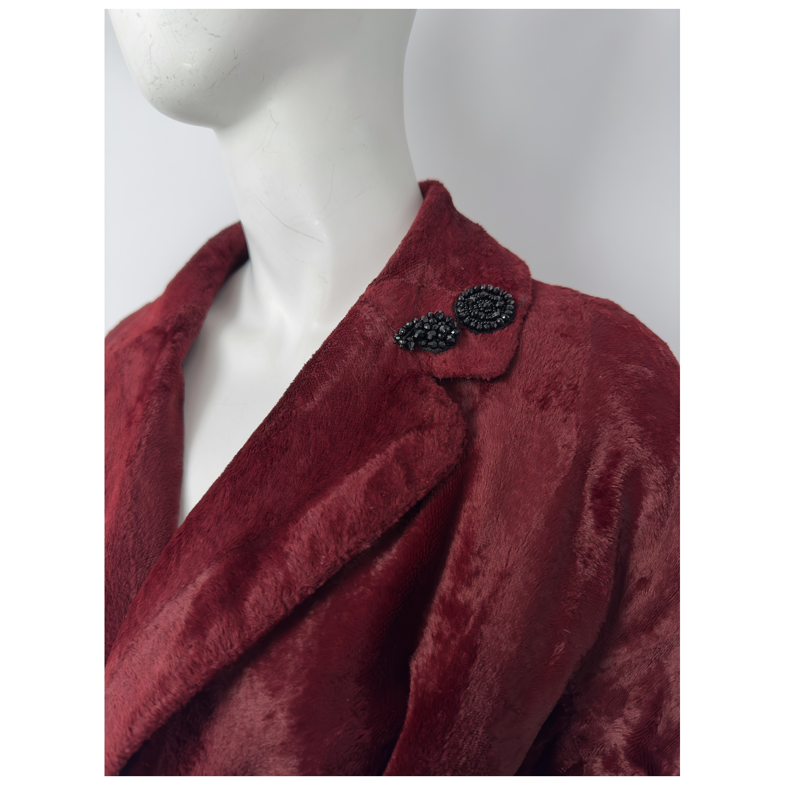 "Bordowy płaszcz z czarną błyszczącą broszką przy kołnierzu, wiązany w pasie paskiem, proste rękawy, kryte kieszenie po bokach, przyszyte logo marki z tyłu przy szyi. Rozmiar z metki IT 44. Skład: 64% bawełna, 36% wiskoza; podszewka: 100% poliester. Wymiary: długość rękawa 51cm, linia ramion 44cm, długość całkowita 104cm."