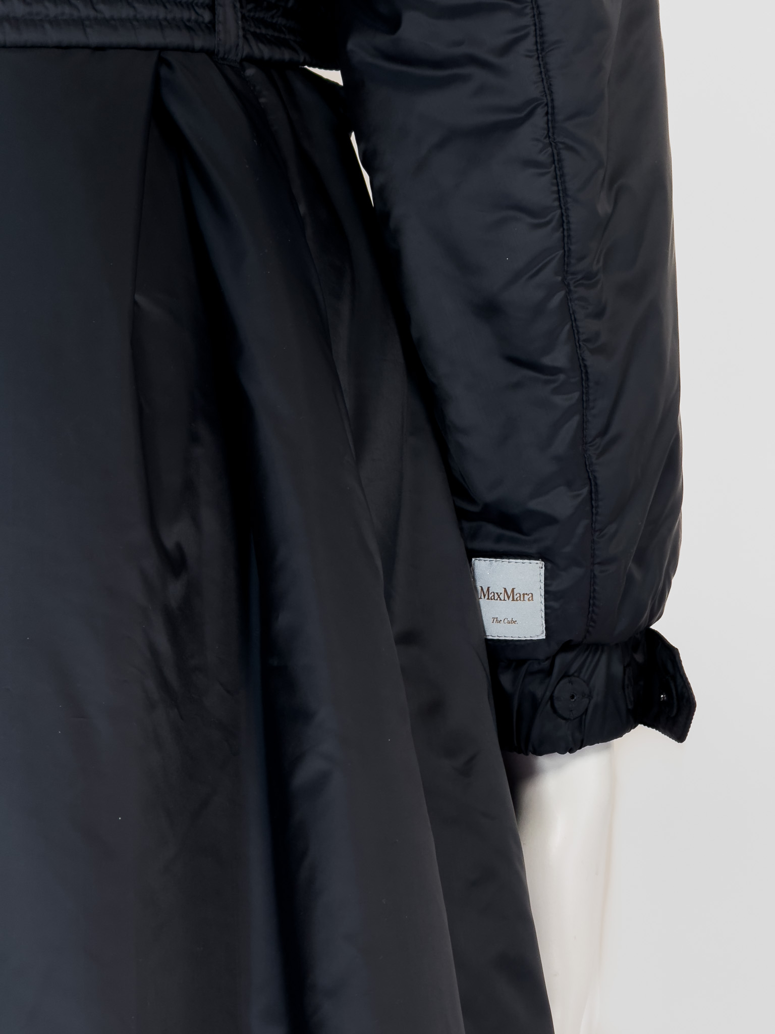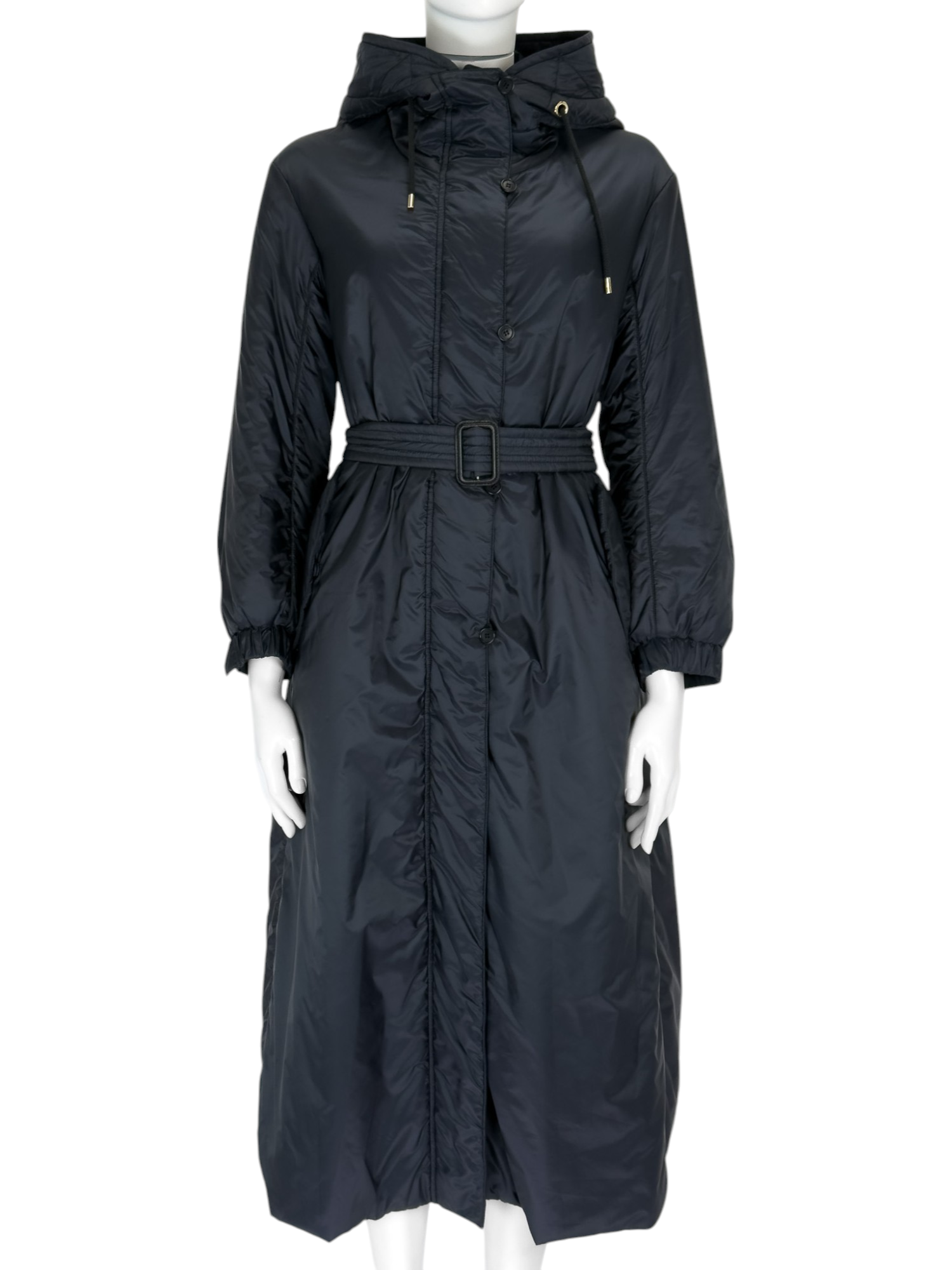 "Granatowy płaszcz z kapturem, długość maxi, ortalionowy, ozdobiony przeszyciami, wiązany w pasie, zapinany na dwa złote logowane suwaki oraz guziki, dwie kryte kieszenie po bokach, regulowane mankiety wykończone naszywką z logo marki. Stan bardzo dobry, posiada delikatne zaciągnięcie. Rozmiar z metki IT 36. Skład: 100% poliester; wnętrze: 52% wielbłąd, 48% poliester. Wymiary: szerokość: 48cm długość: 121cm"