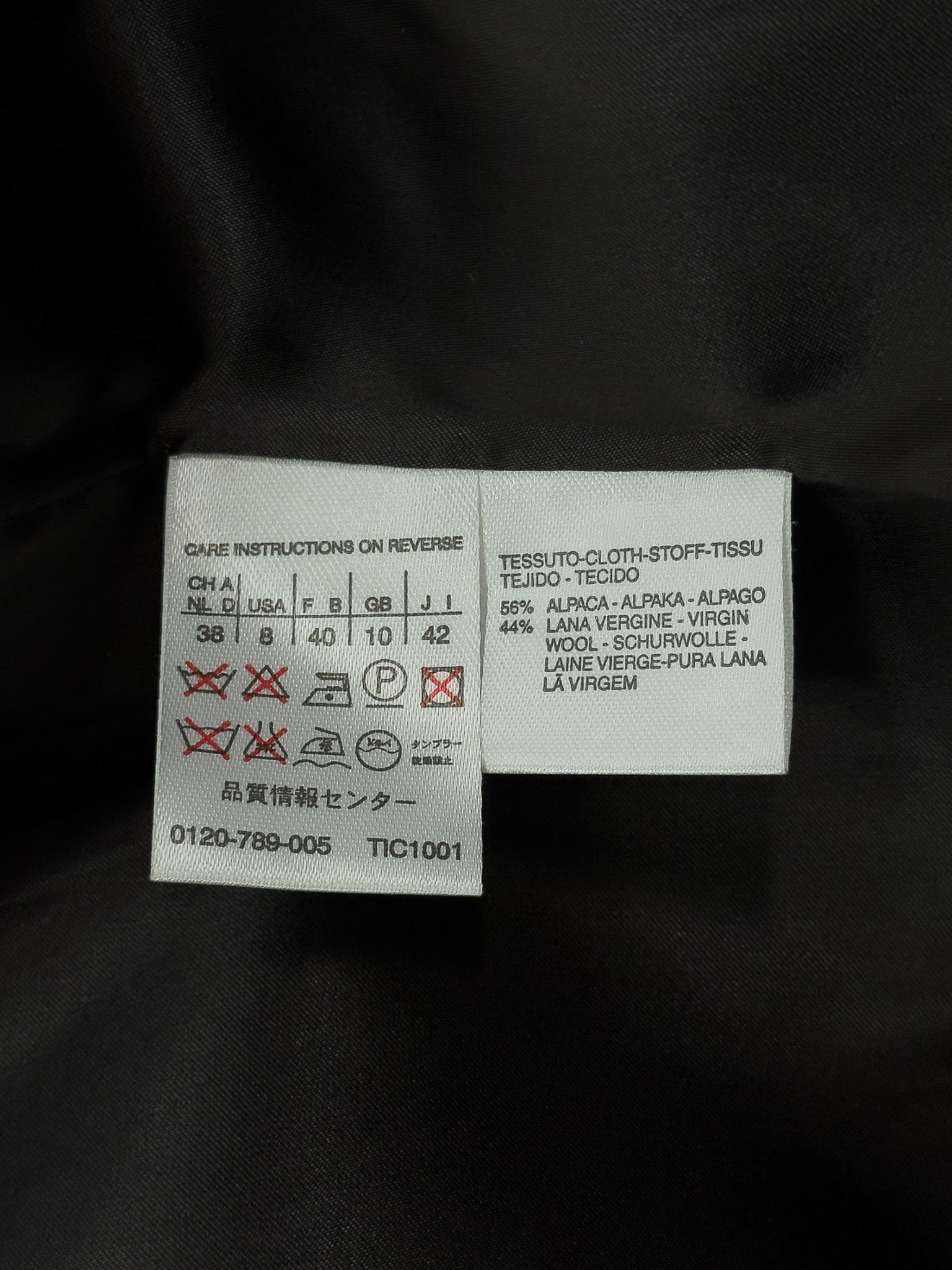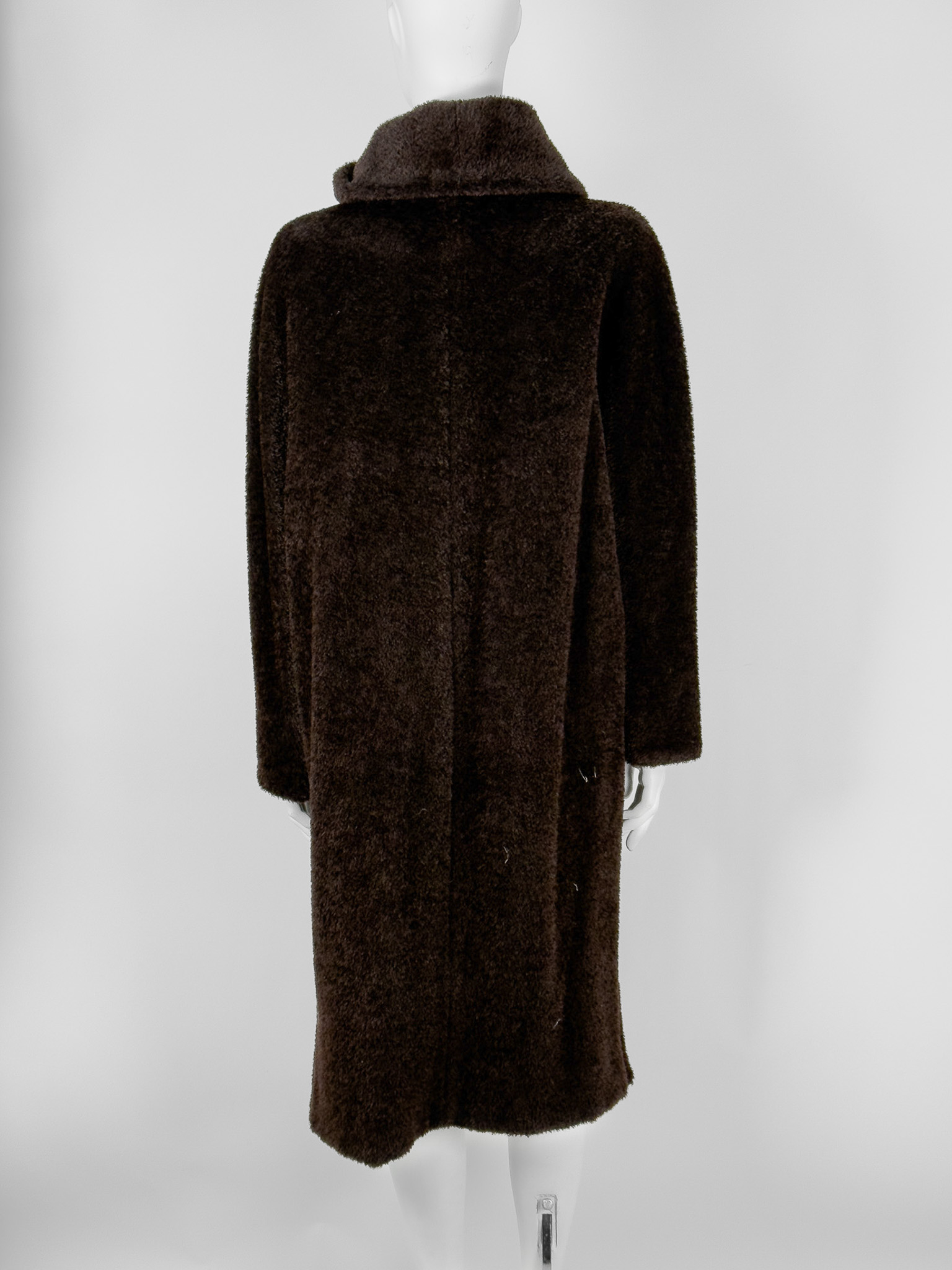 "Brązowy płaszcz zapinany na brązowe drewniane guziki, kołeczki zapinane na haftki. Skórzane wykończenie przy kieszeniach. Skład: 56% alpaka, 44% wełna. Rozmiar z metki IT 42."