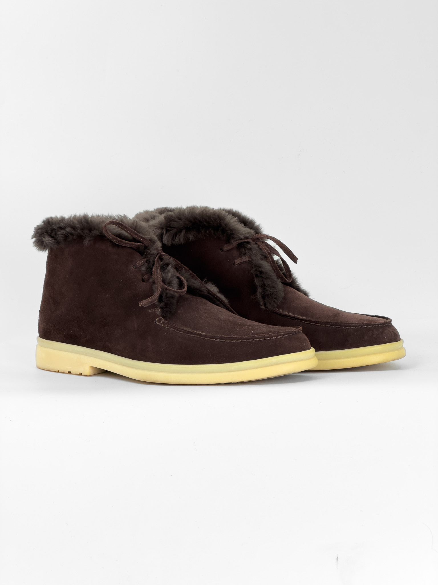"Brązowo-bordowe buty za kostkę , wykonane ze skóry zamszowej, wewnątrz miękkie futro wystające na zewnątrz, sznurówki wykonane z zamszowej skóry, podeszwy w odcieniach żółci. Rozmiar 39,5. W zestawie z workiem przeciwkurzowym."