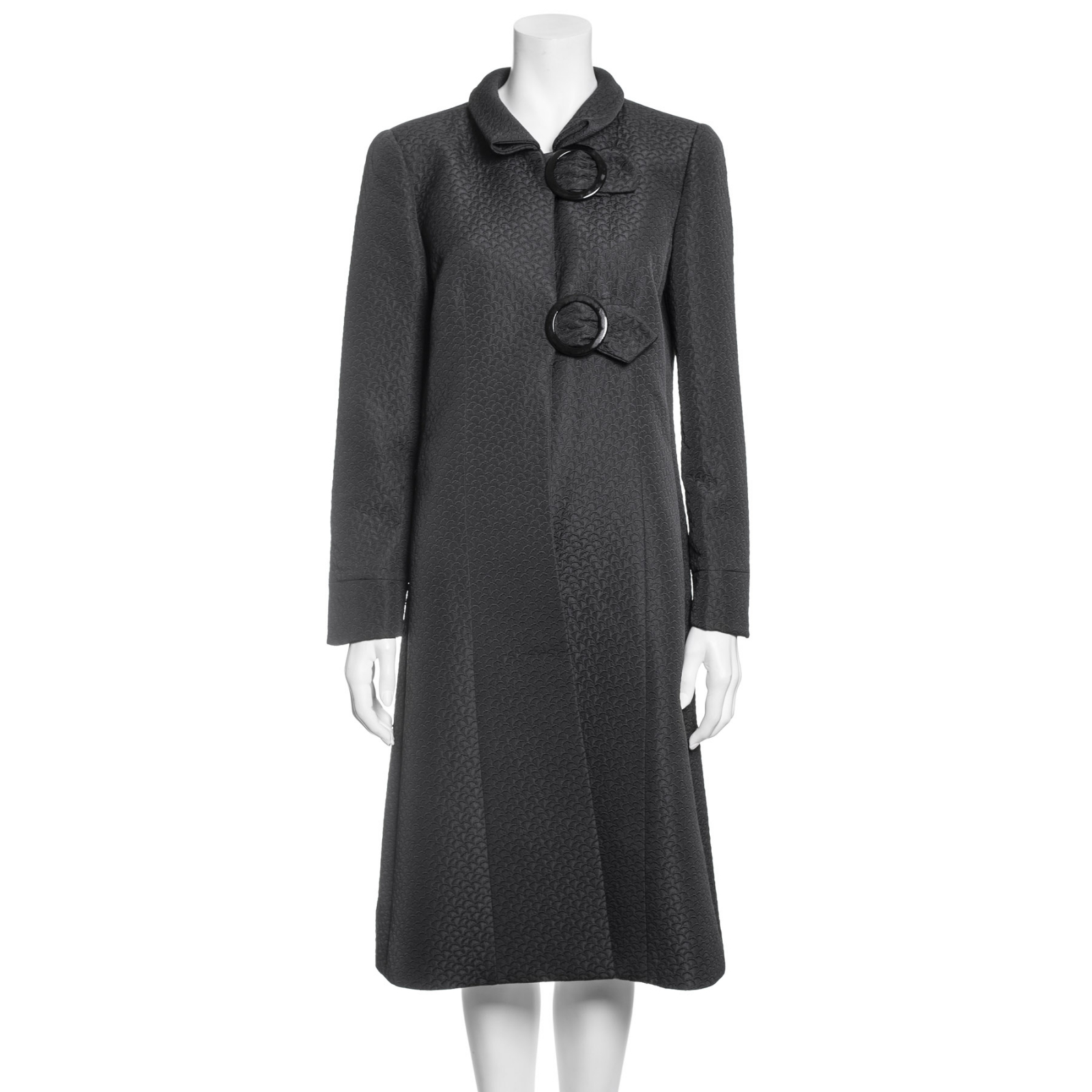 "czarny wytłaczany płaszcz z zapięciem na zatrzaski i dwa duże guziki, rozmiar 46"
