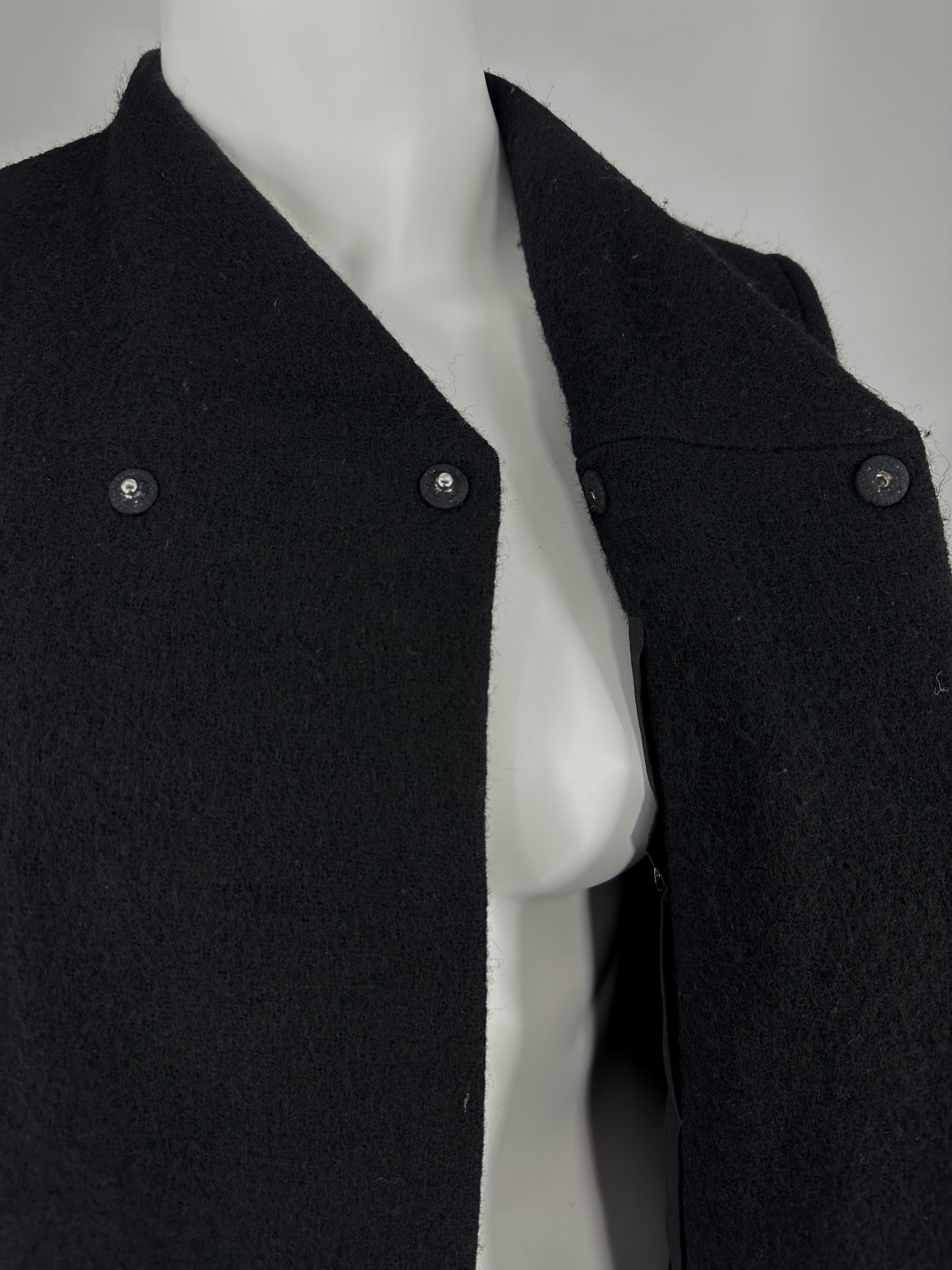 "czarny długi płaszcz, zapinany na zatrzaski, długość za kolana, wysokie rozcięcie z tyłu. Brak metek z rozmiarem i składem. Wymiary: szer. ramion 36 cm, szer. biustu 47 cm, szer. talii 48 cm, dł. całkowita 127 cm, dł. rękawa 69 cm."
