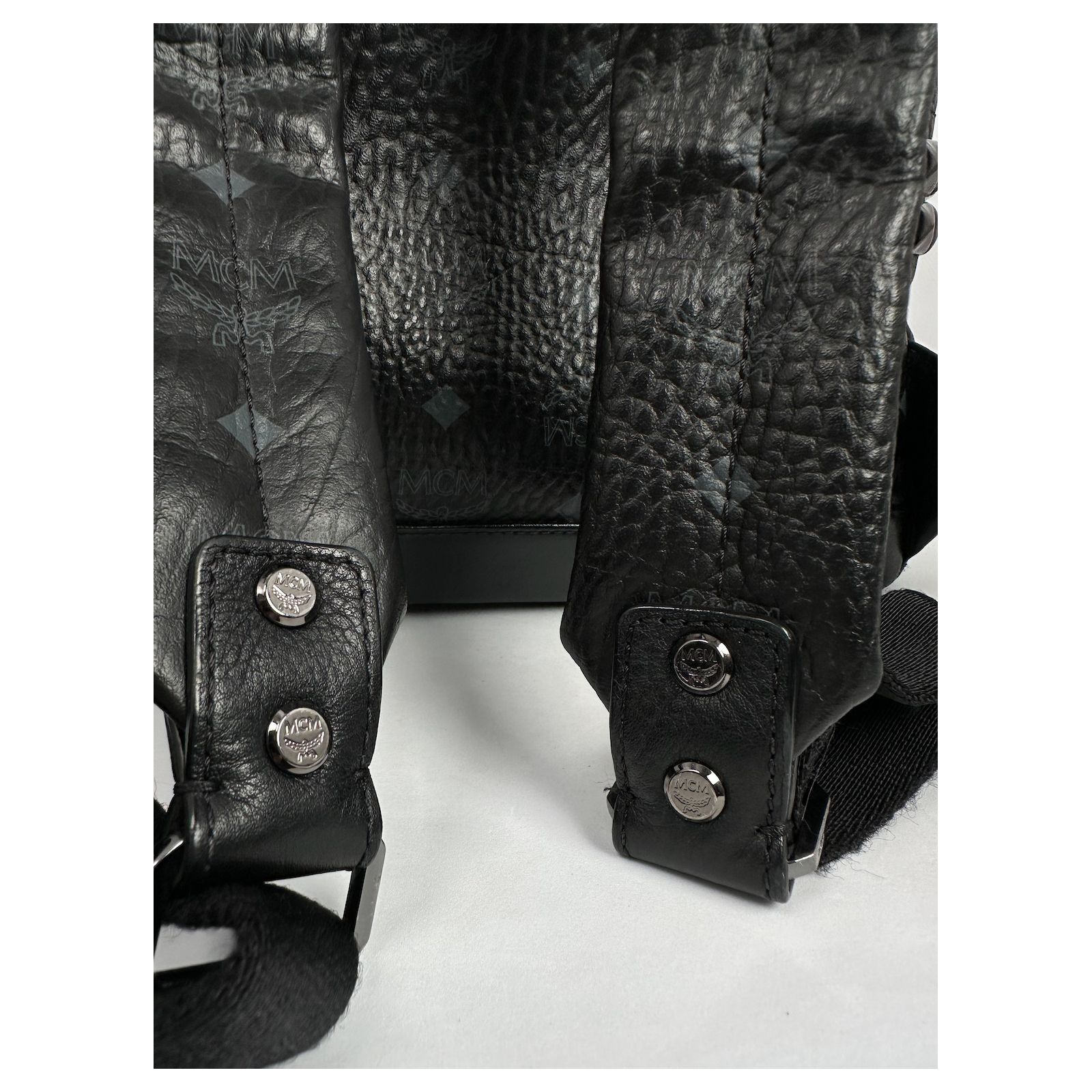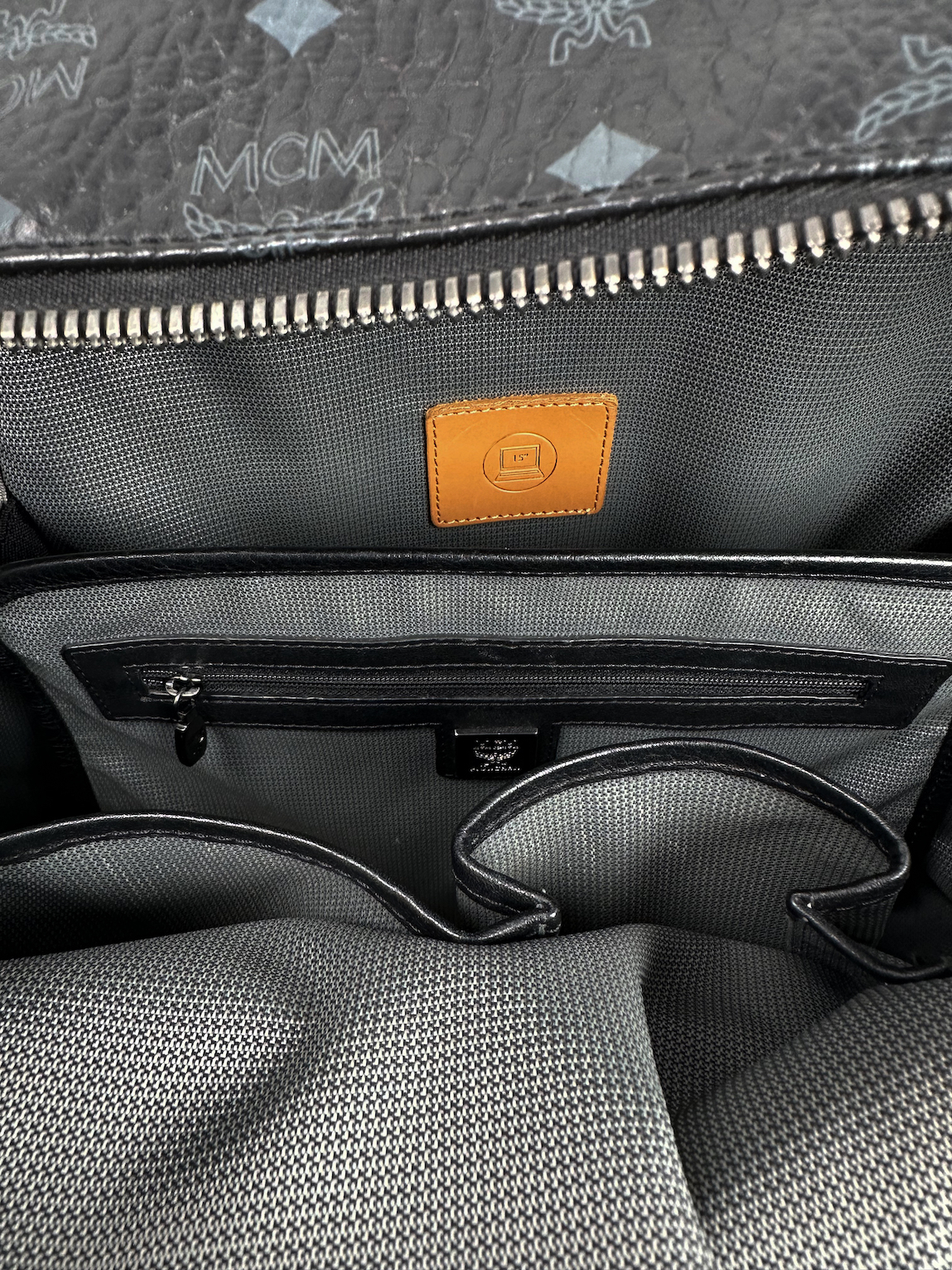 "Czarny skórzany logowany plecak, ozdobiony srebrnymi ćwiekami po bokach, jedna duża kieszeń na przodzie, srebrne metalowe logo w górnej części, regulowane paski, zaokrąglona góra, dwie mniejsze kieszenie po bokach, usztywniony dół, uchwyt na górze, szare wnętrze z dwoma komorami i trzy kieszenie, używany. Stan bardzo dobry, lekko zabrudzone wnętrze. Wymiary: głębokość 16cm, wysokość 37cm, szerokość 29cm."