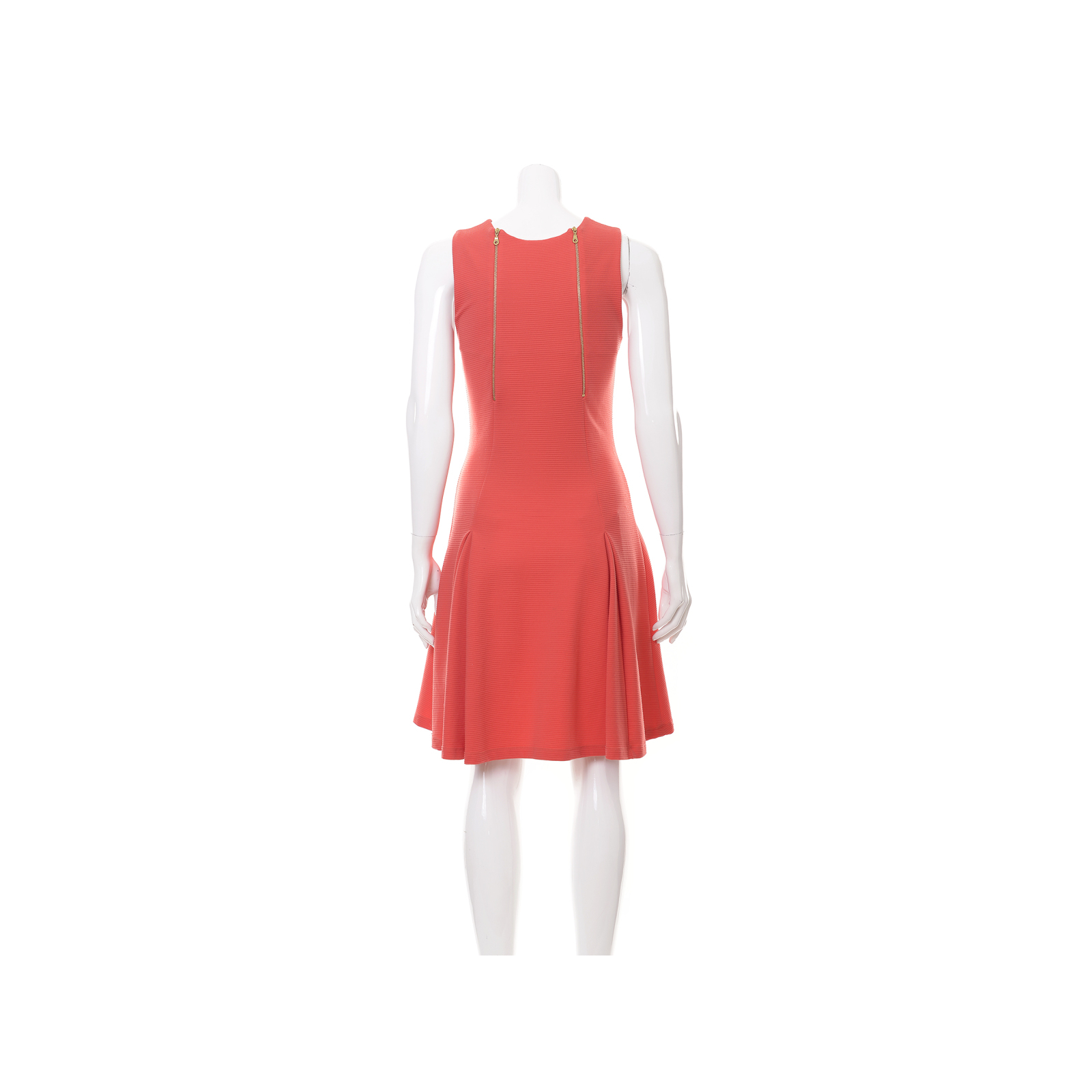 "Pomarańczowa prążkowana sukienka bez rękawów , z tyłu zapinana na dwa złote suwaczki , lekko rozkloszowana. Rozmiar S , wykonana z połączenia poliamidu i elastanu"