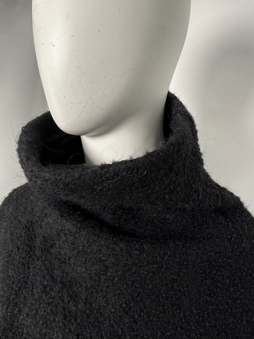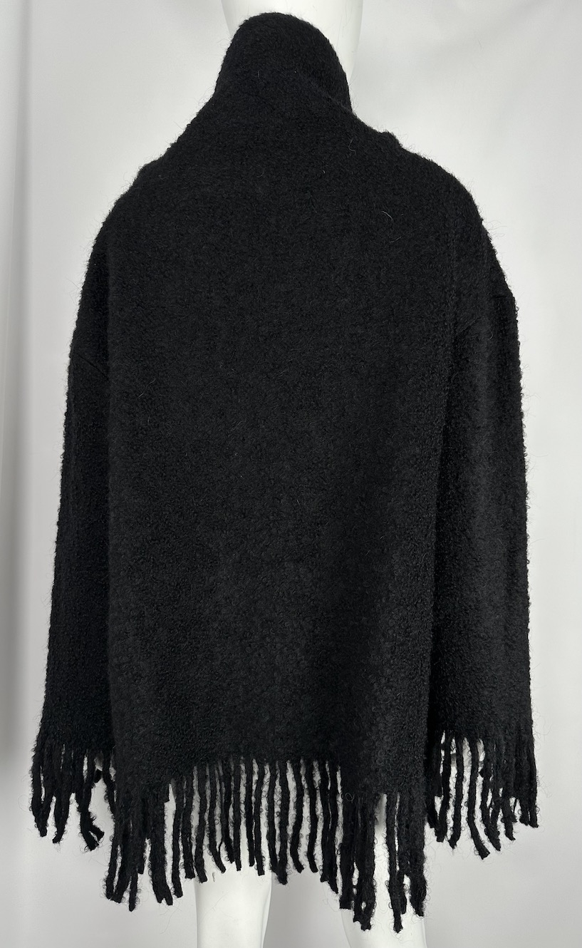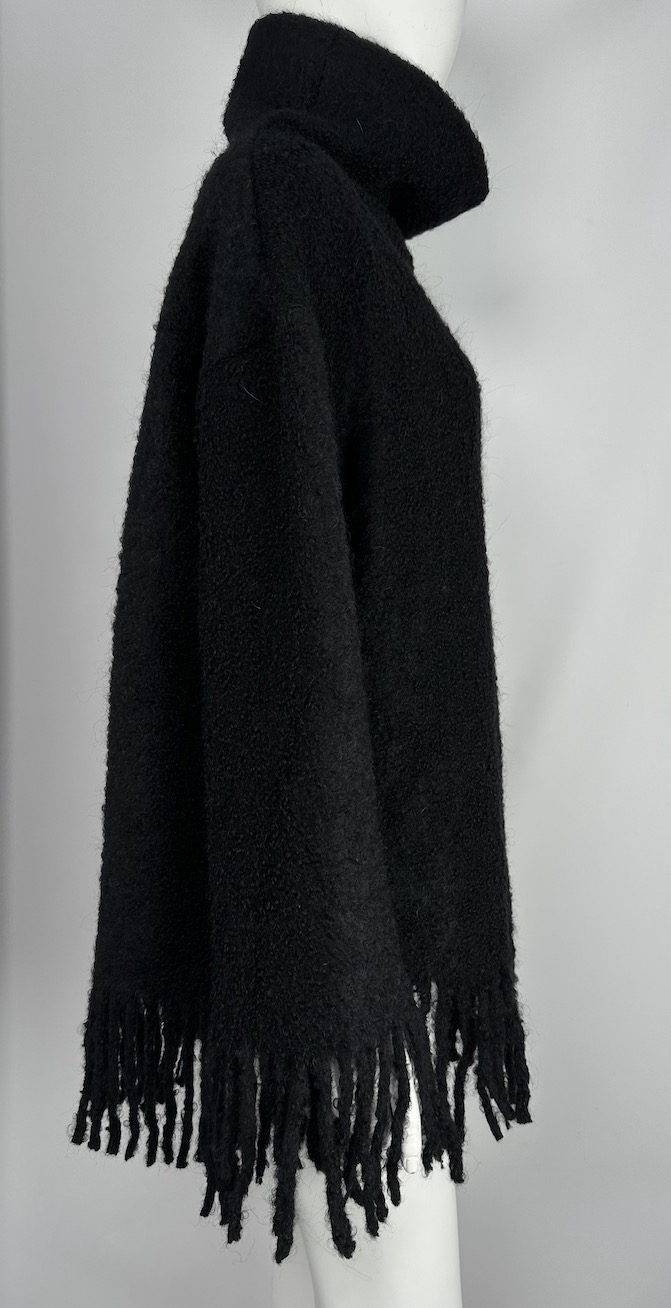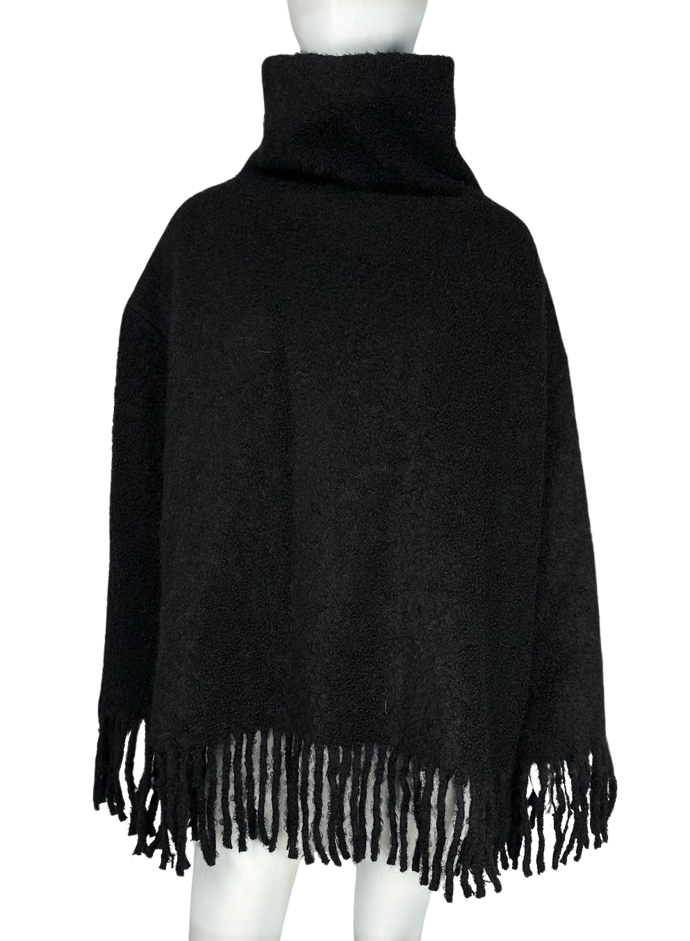 "Czarne poncho z długim rękawem zakończone aplikacją z frędzlami. Onesize, Skład: 60% wełna, 40% poliester. Wymiary: długość całkowita 76cm."