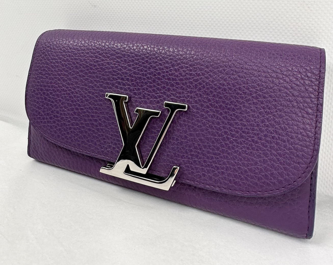"Fioletowy skórzany duży portfel, zapinany na klamrę ze srebrnym logo na przodzie, wyciągany card holder, osiem kieszeni na karty oraz cztery większe, w tym jedna w tylnej części, w zestawie z workiem przeciwkurzowym. Model: Vivienne LV Wallet Taurillon Leather. Wymiary: szerokość 19cm, wysokość 11cm."