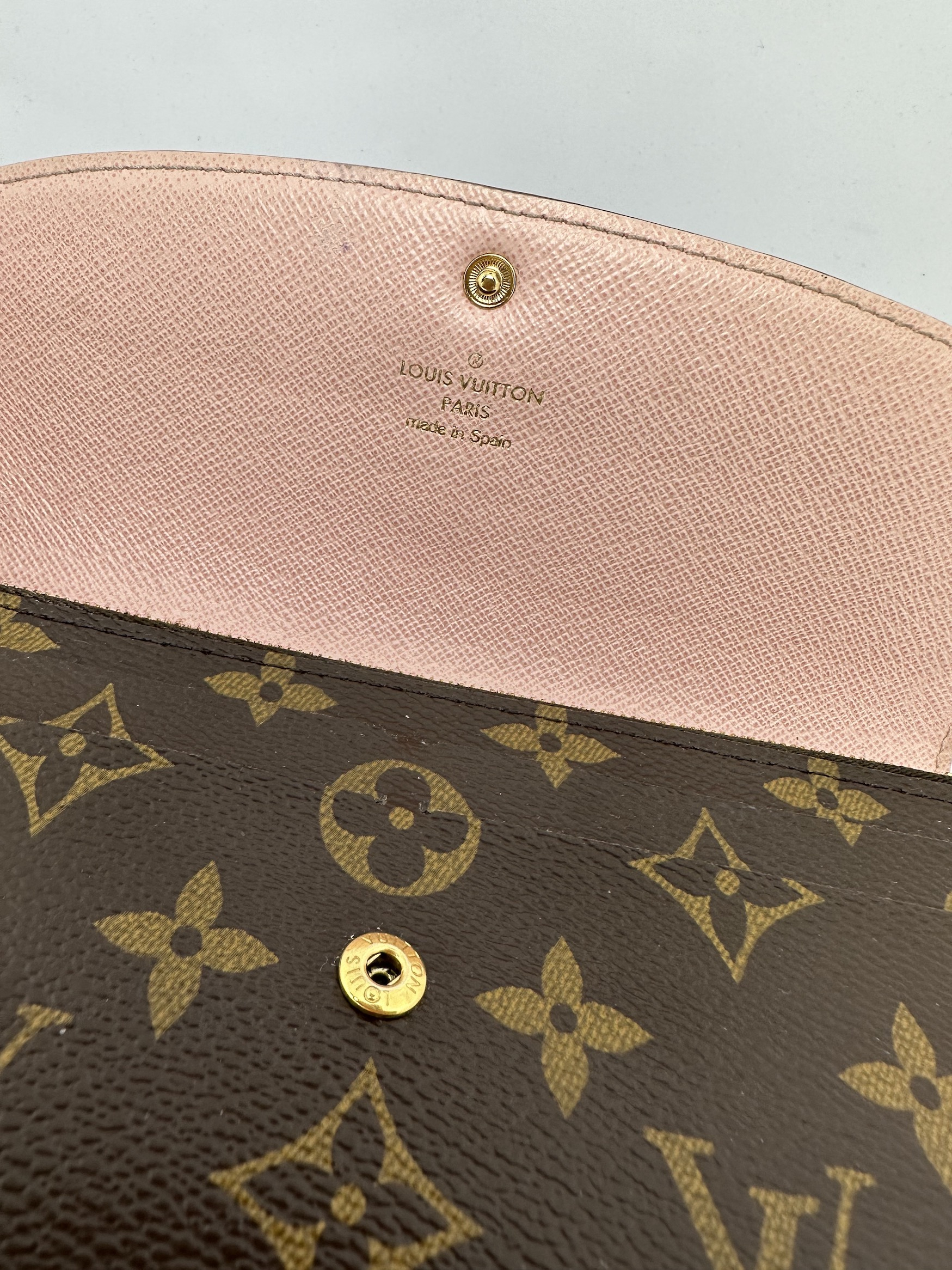 "portfel model Emily, monogram. Pudrowo różowy środek. Stan bardzo dobry. Przetarte zewnętrzne zapięcie.Pudełko w komplecie oraz worek przeciwkurzowy"