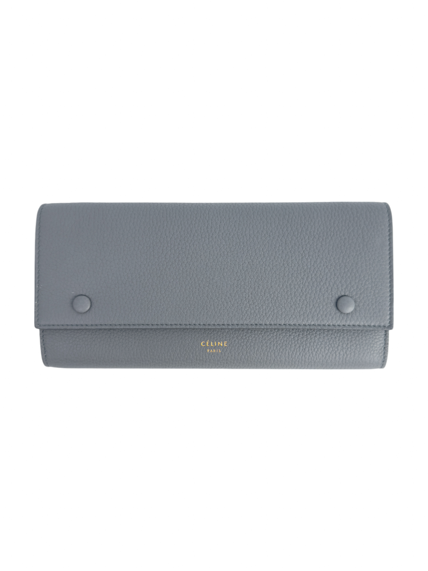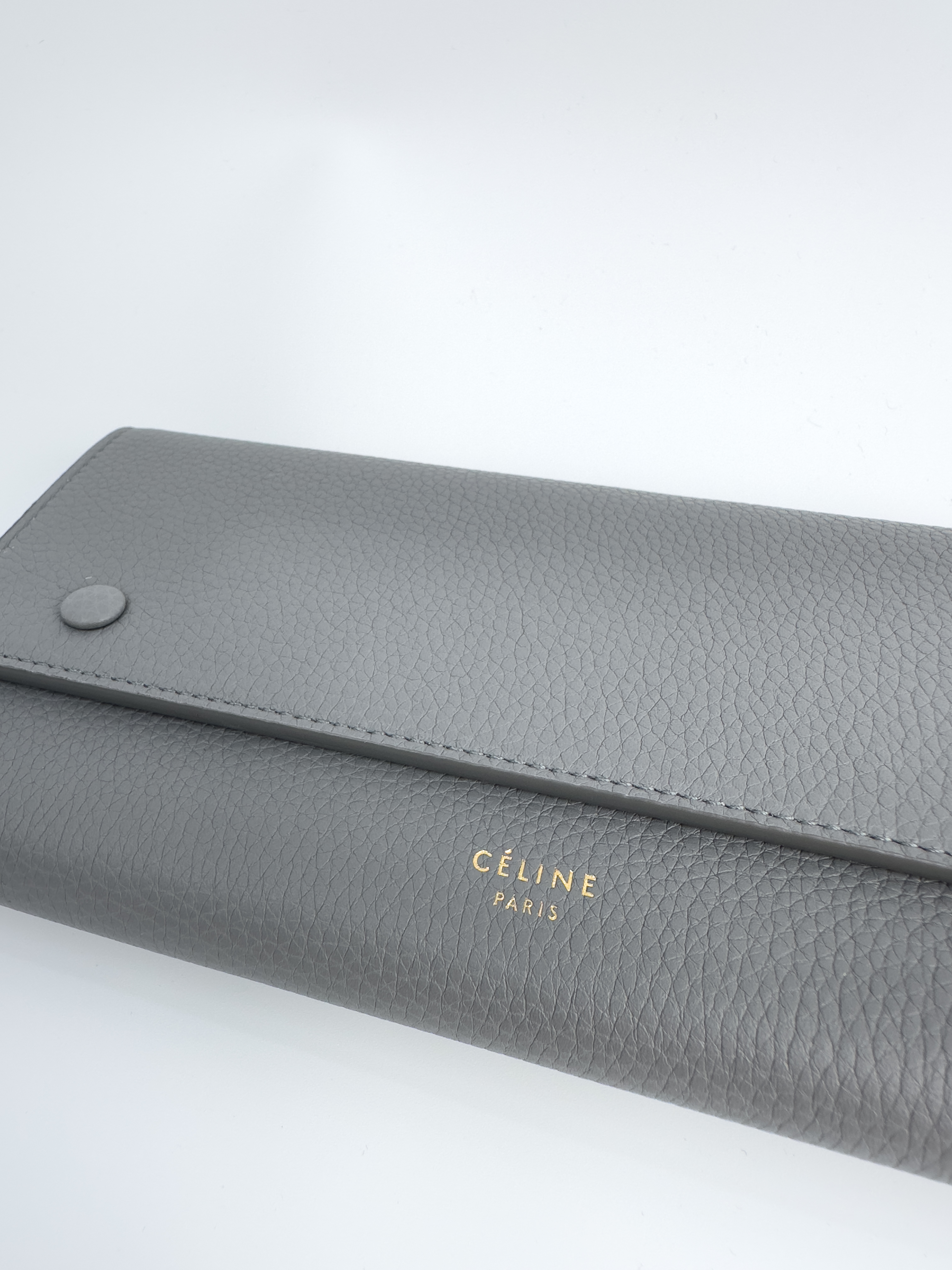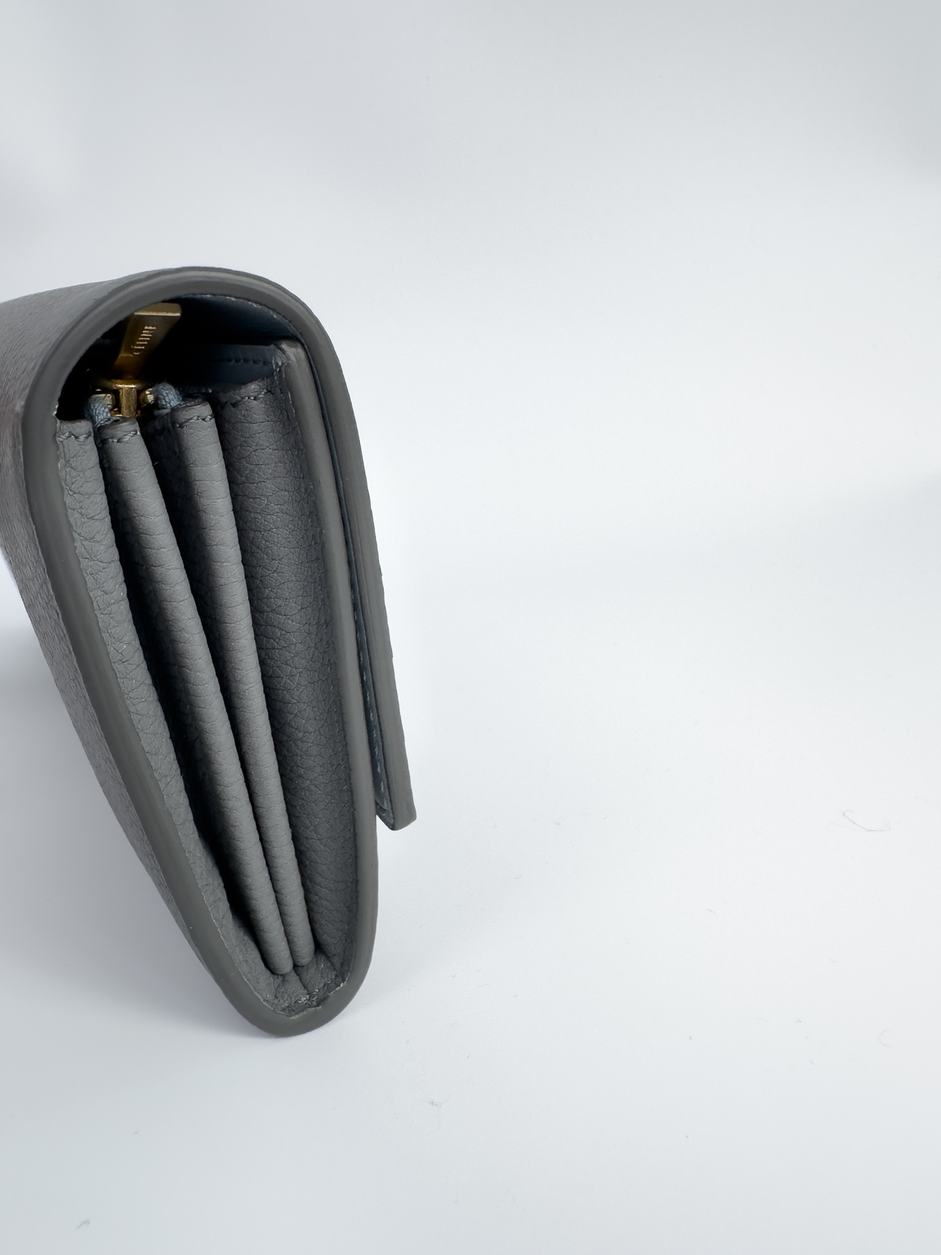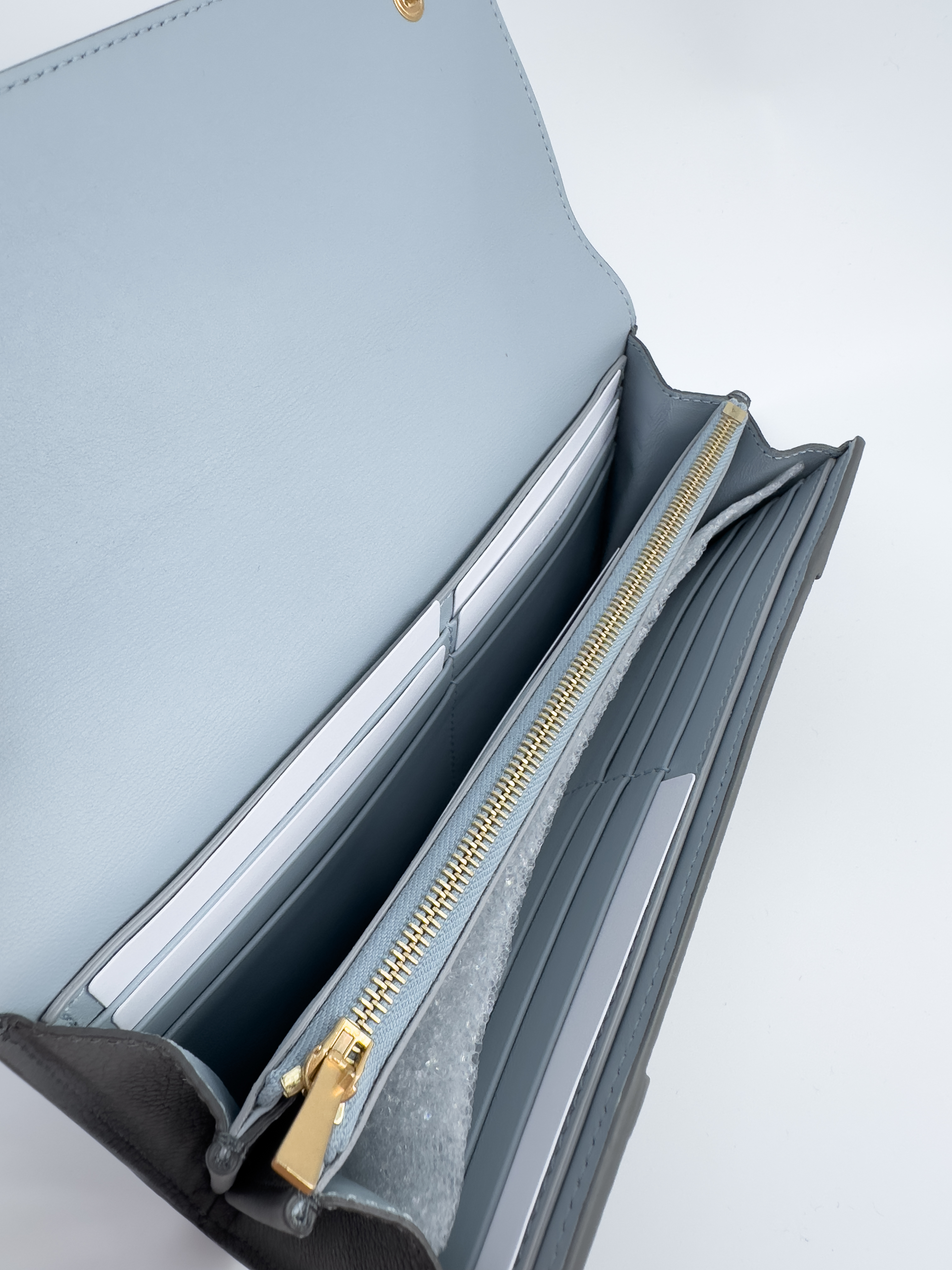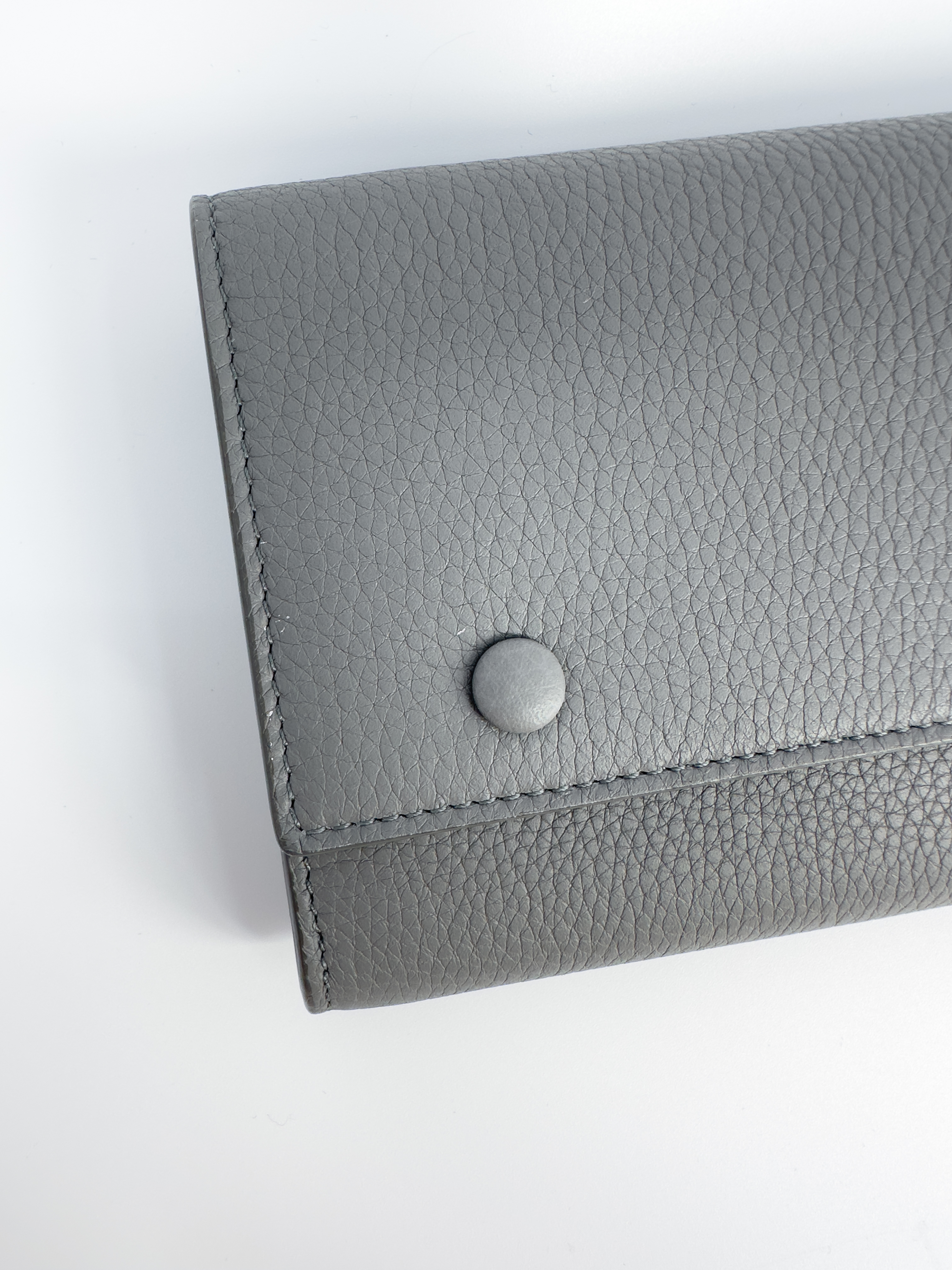 "Szary skórzany portfel, groszkowa skóra, złote logo marki, zapinany na dwa zatrzaski, duży, prostokątny kształt, trzy komory wewnątrz, w tym jedna zasuwana, przegrody na karty, worek przeciwkurzowy w komplecie. Stan nowy. Wymiary: szerokość 30cm, wysokość 10cm."