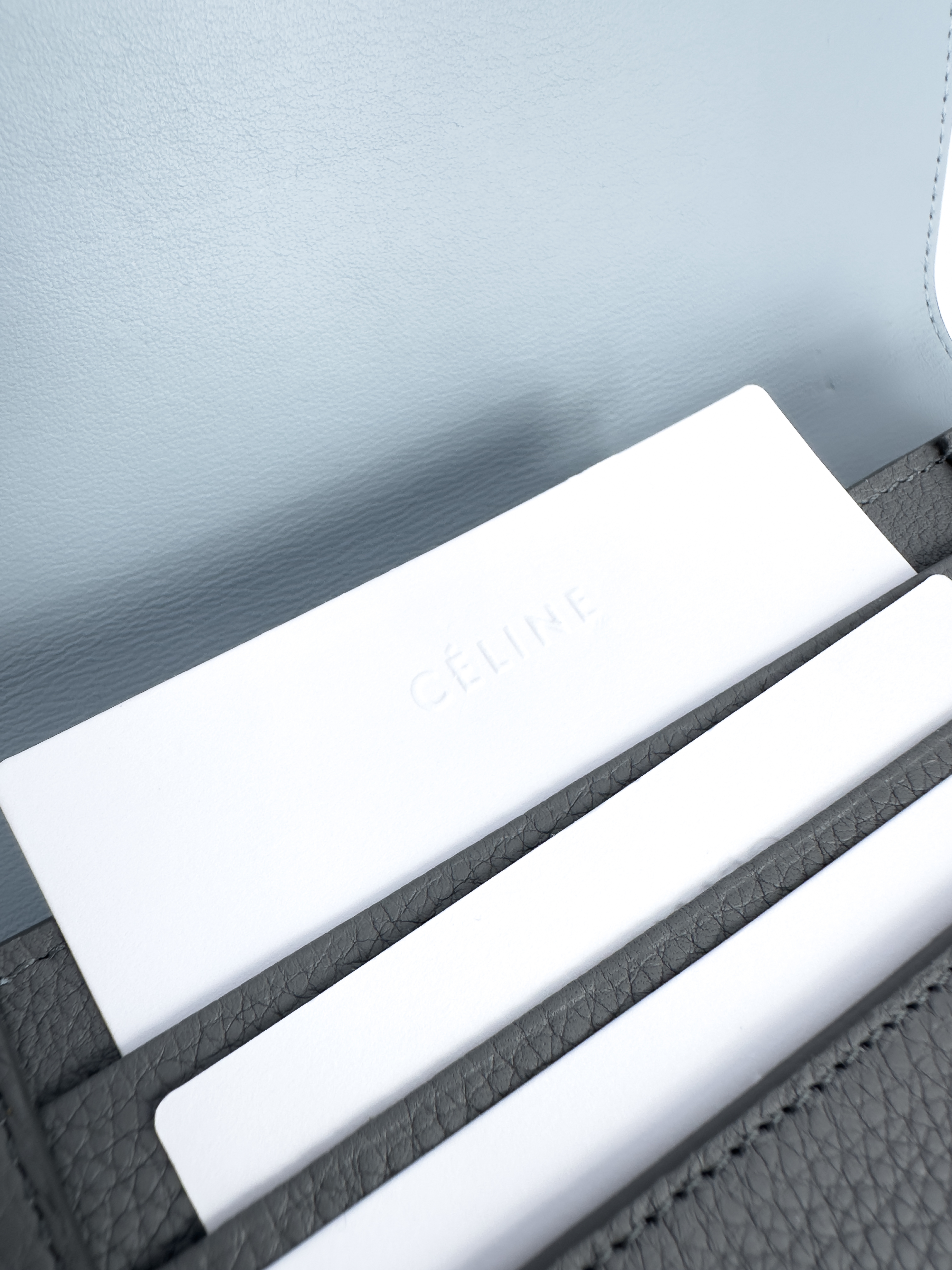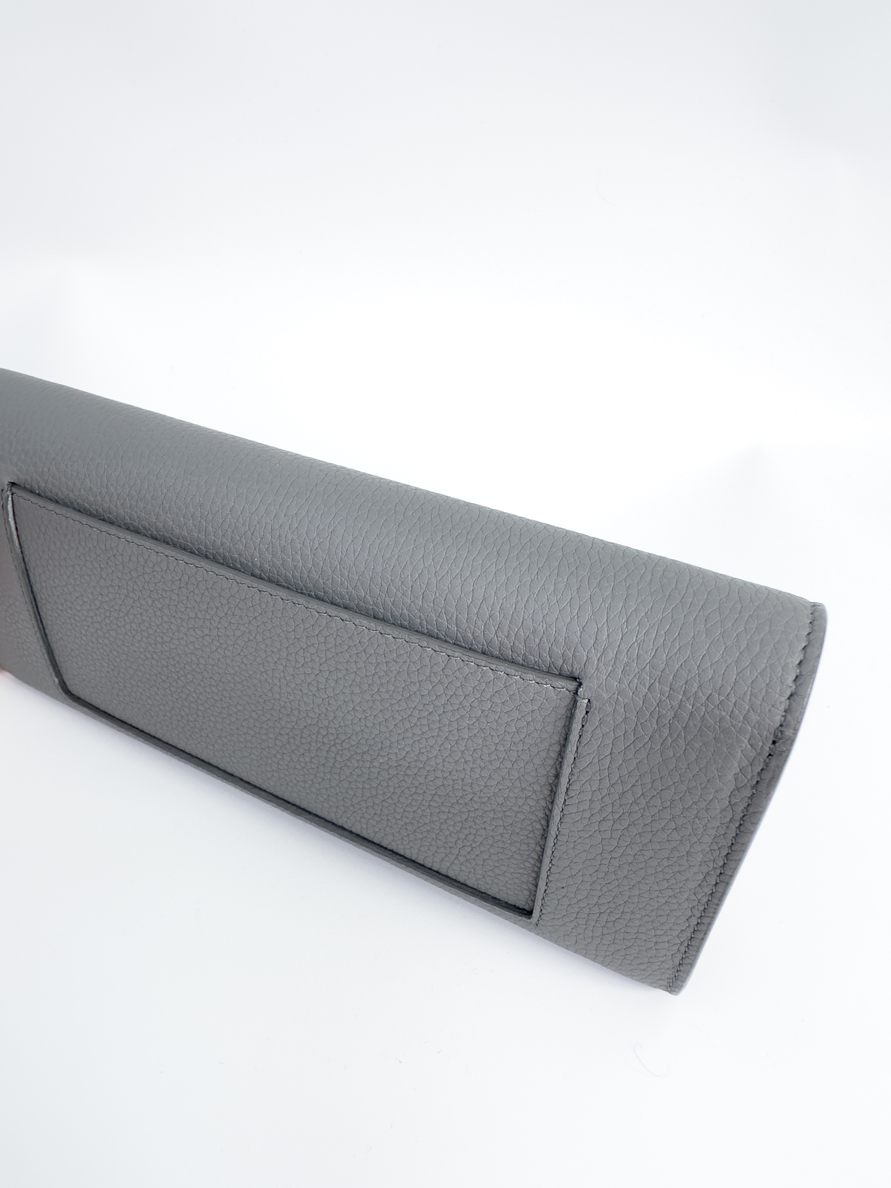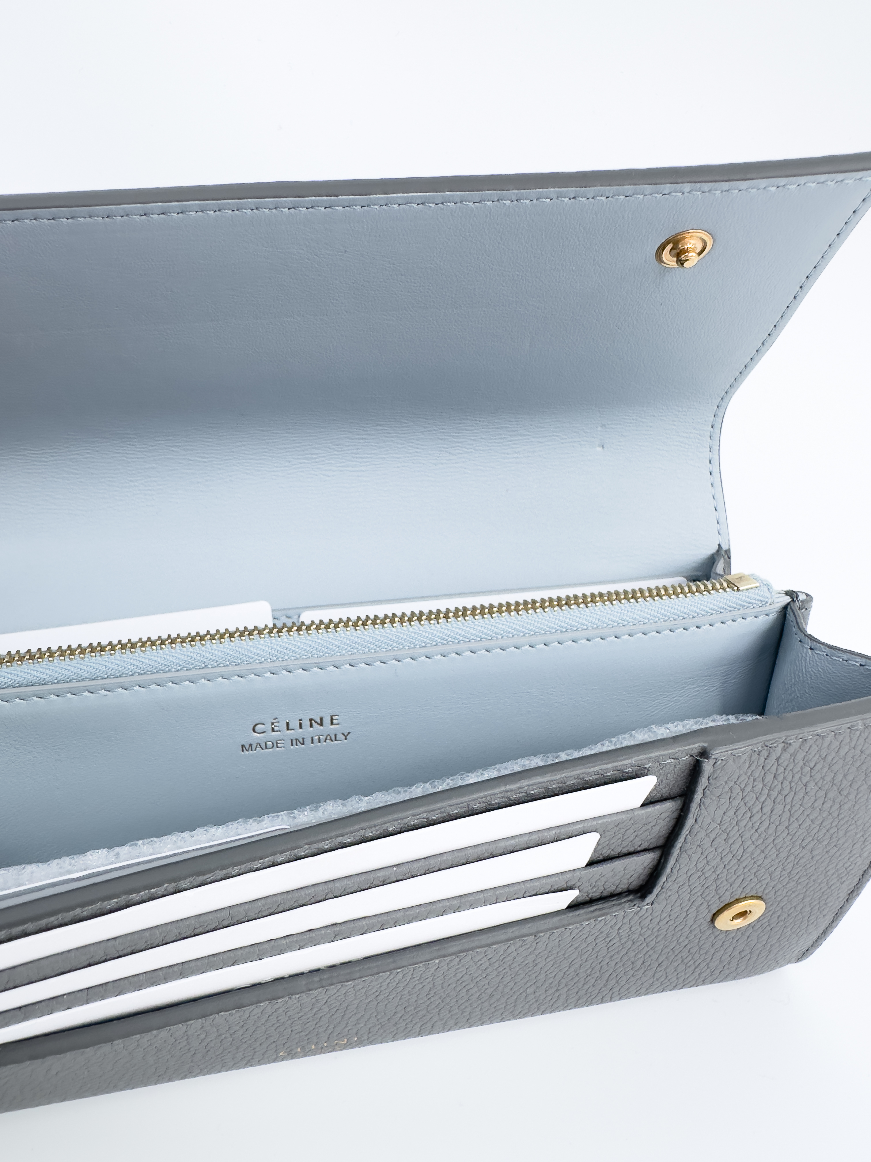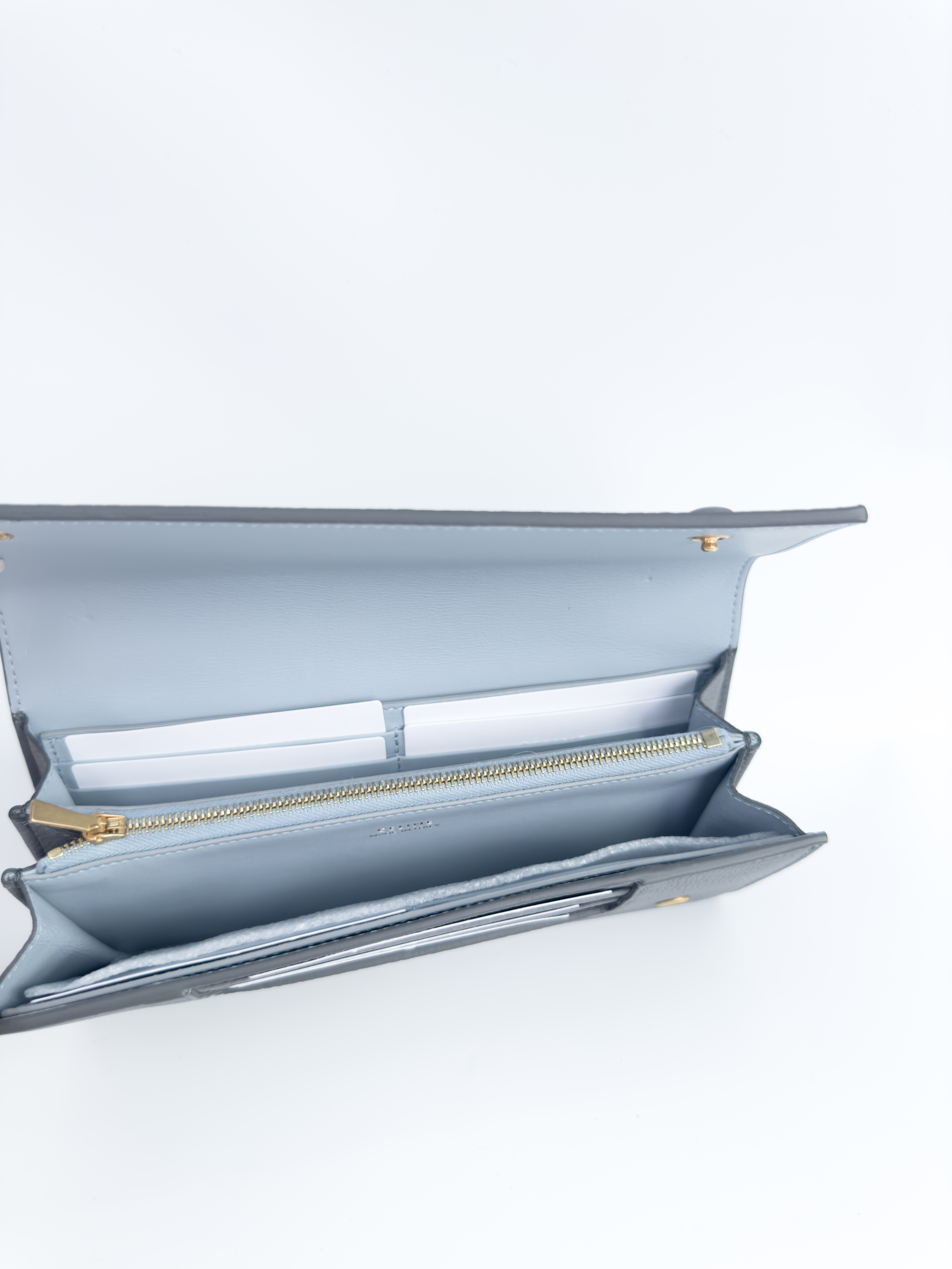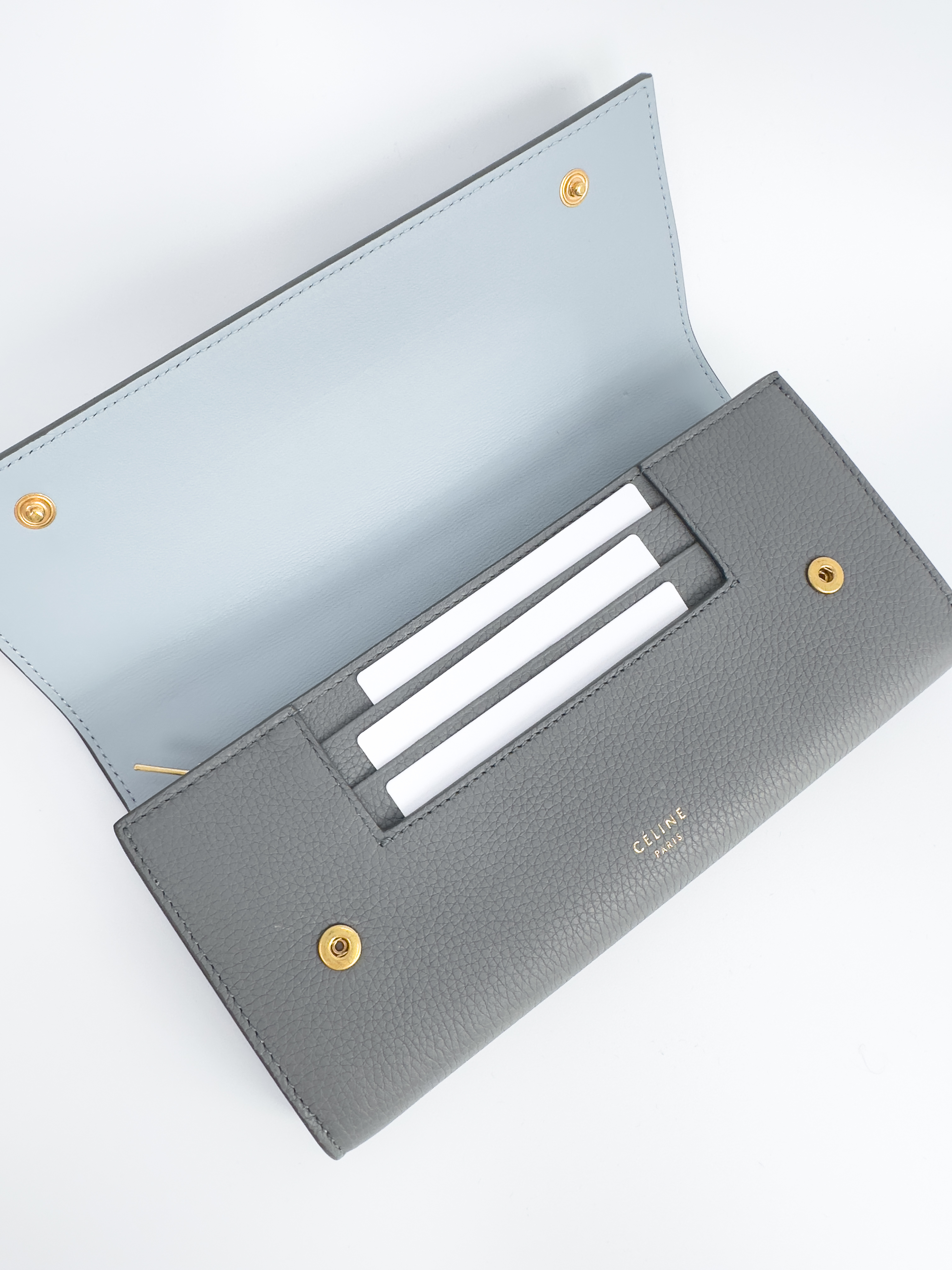 "Szary skórzany portfel, groszkowa skóra, złote logo marki, zapinany na dwa zatrzaski, duży, prostokątny kształt, trzy komory wewnątrz, w tym jedna zasuwana, przegrody na karty, worek przeciwkurzowy w komplecie. Stan nowy. Wymiary: szerokość 30cm, wysokość 10cm."