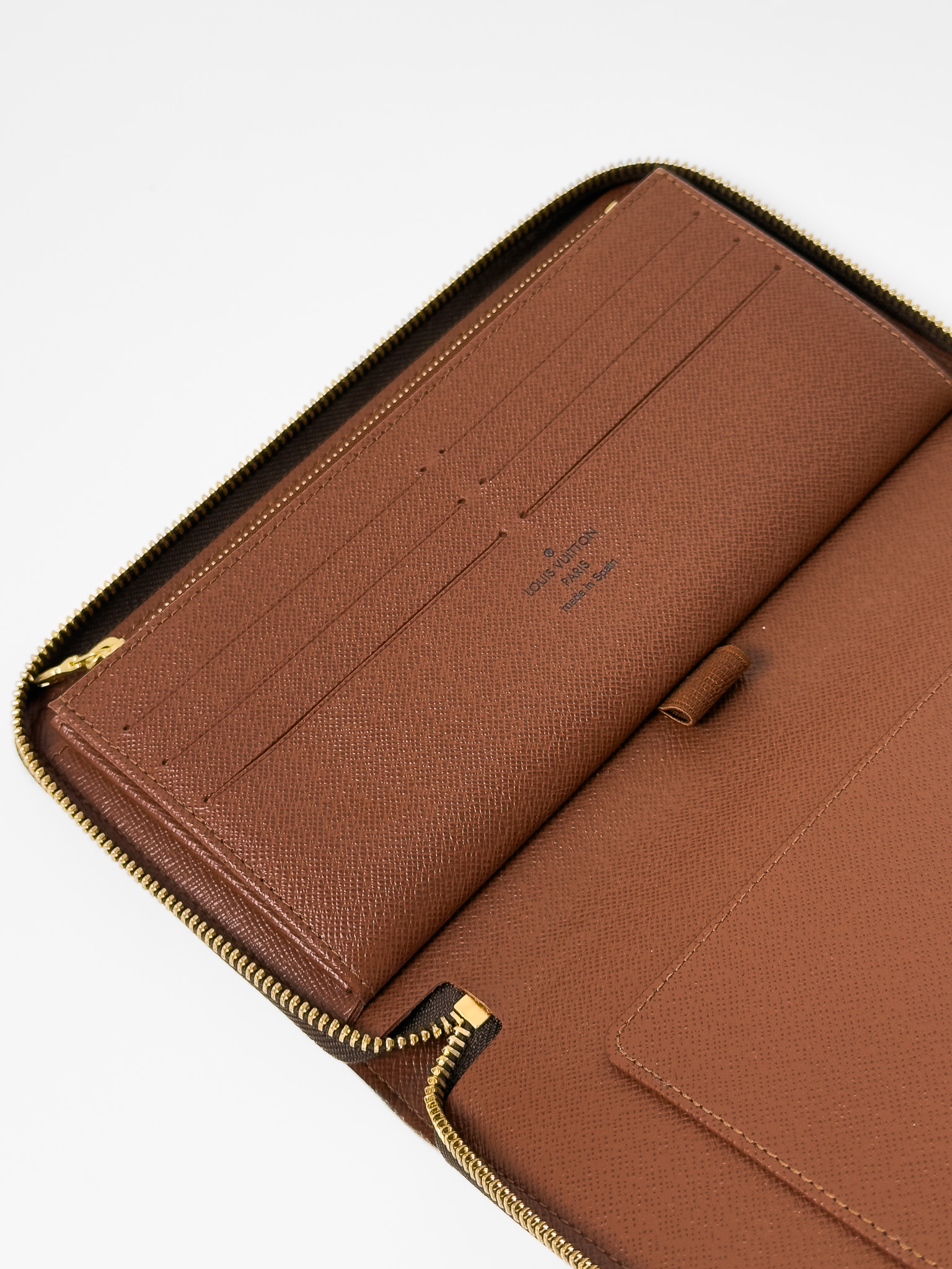 "Duży portfel w kolorze brązowym w monogram marki, zapinany na złoty logowany suwak, w środku przegrody na karty, dokumenty oraz banknoty, zapinana kieszeń na monety, inicjały " DR SGH". Stan dobry, posiada delikatne plamy, przetarcia na rogach oraz rysy na metalowych elementach. Wymiary: szerokość 20,5cm, wysokość 11,5cm."
