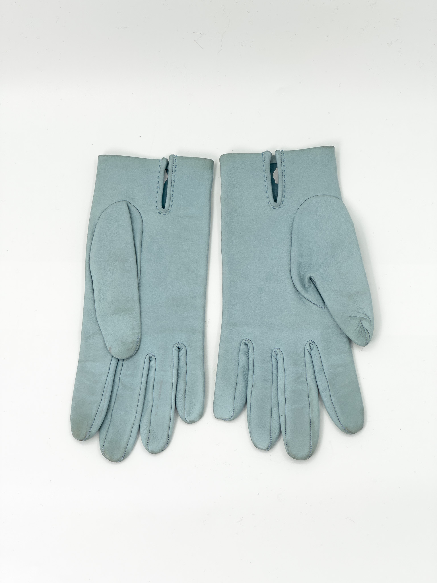 "Błękitne skórzane rękawiczki ozdobione ażurowym logo marki w centralnej części, miękka skóra, wycięcie od wewnętrznej strony, pięciopalczaste, używane. Stan dobry, delikatne przetarcia oraz zabrudzenia od wewnętrznej strony. Skład: 100% skóra jagnięca."
