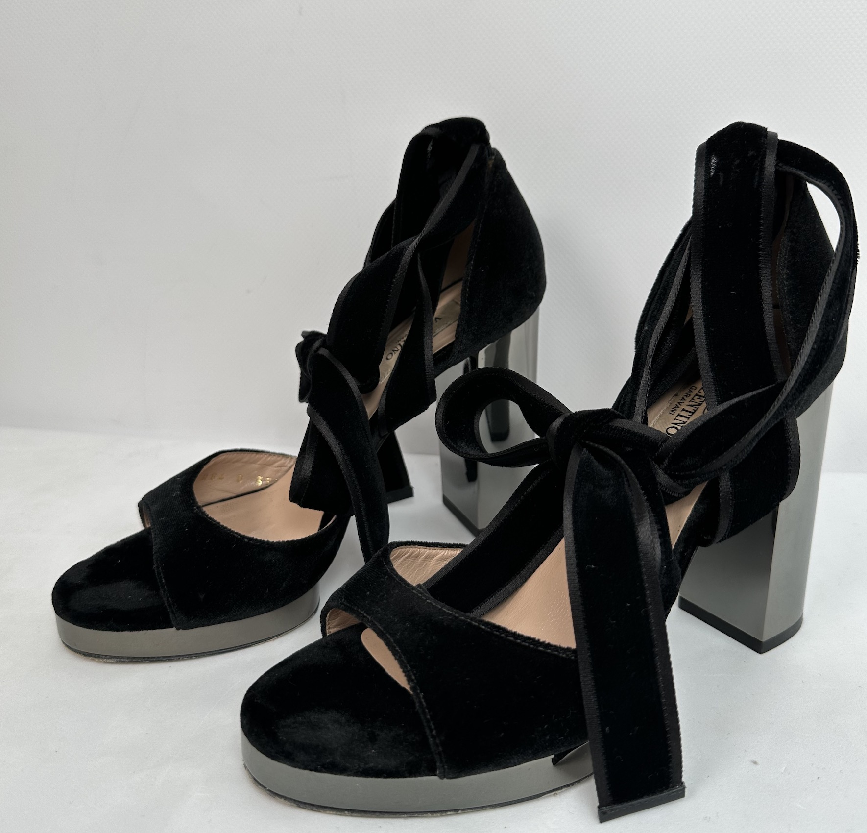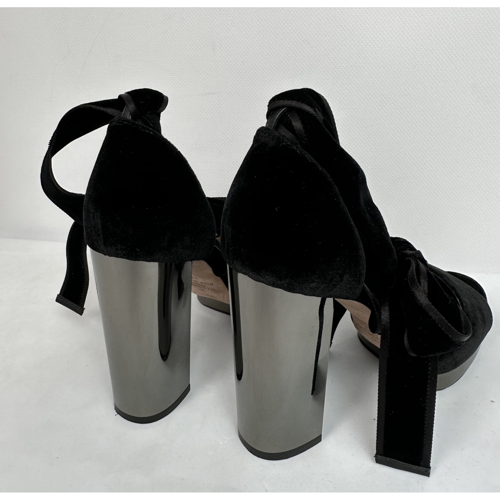 "Czarne welurowe sandały na obcasie. Srebrny metaliczny obcas oraz platforma. Stan bardzo dobry, użyte raz. Zawiązania wokół kostki, zaokrąglony nosek i odkryty przód. Rozmiar 37,5."