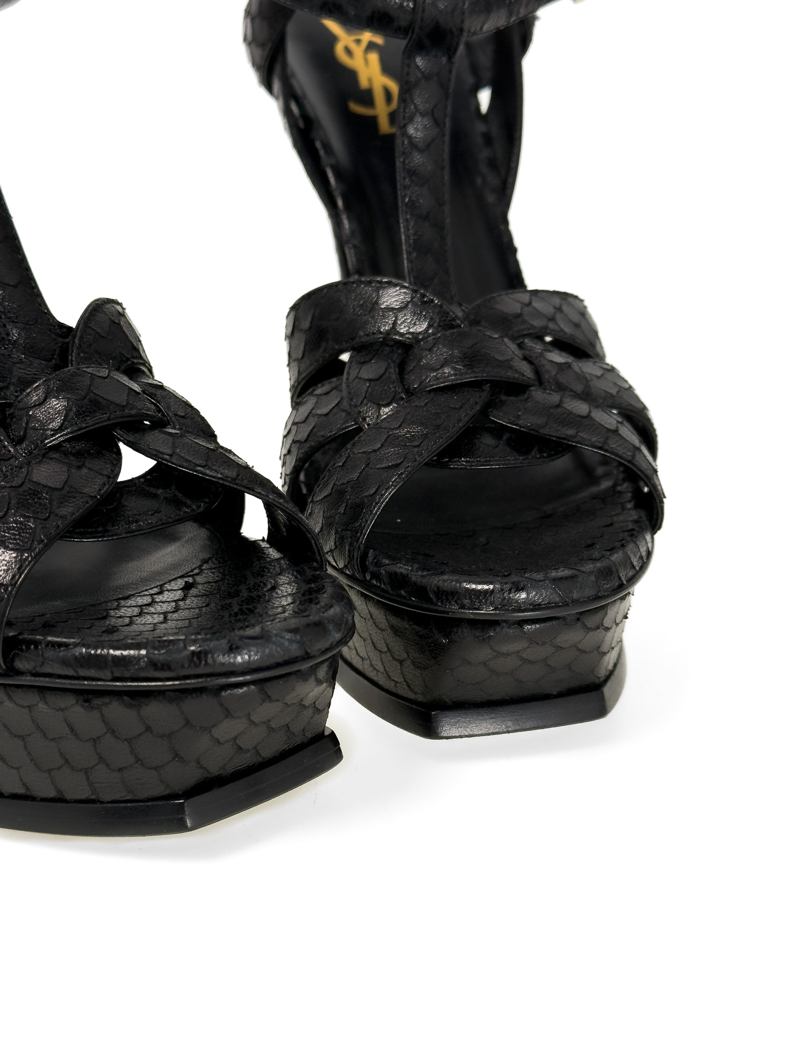 "Czarne sandały model tribute, efekt skóry węża, złote zapięcie. Rozmiar 39. W świetnym stanie. Pudełko w komplecie."