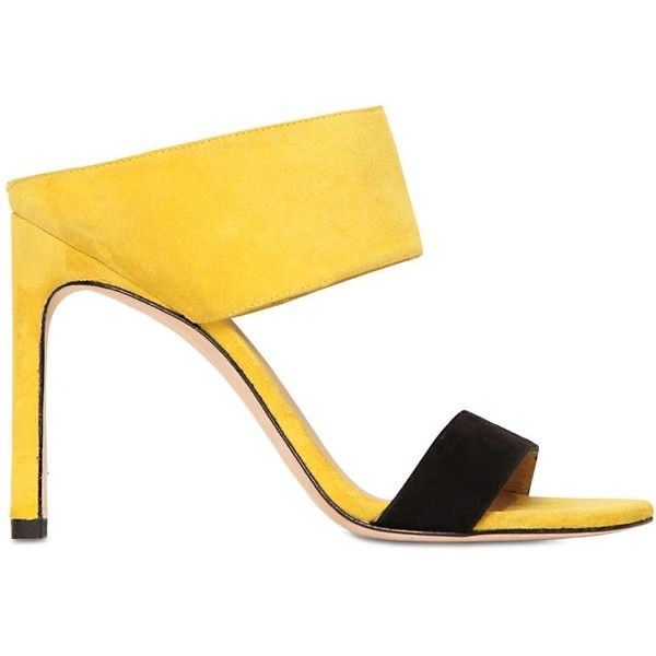 "Sandałki zamszowe na wysokim obcasie w modnym kolorze żółto-czarnym, okrągły palec, odkryta pięta i palce. Obcas prosty wys.10 cm. Skóra wewnątrz oraz skórzana podeszwa. Ładnie prezentują się. Używane, nieznaczne ślady używania, pod palcami i małe przybrudzenie na dole na prawym obcasie, stan dobry. Oryginalne pudełko, dwa worki z logo. Rozmiar producenta 37, pasuje na 37,5."