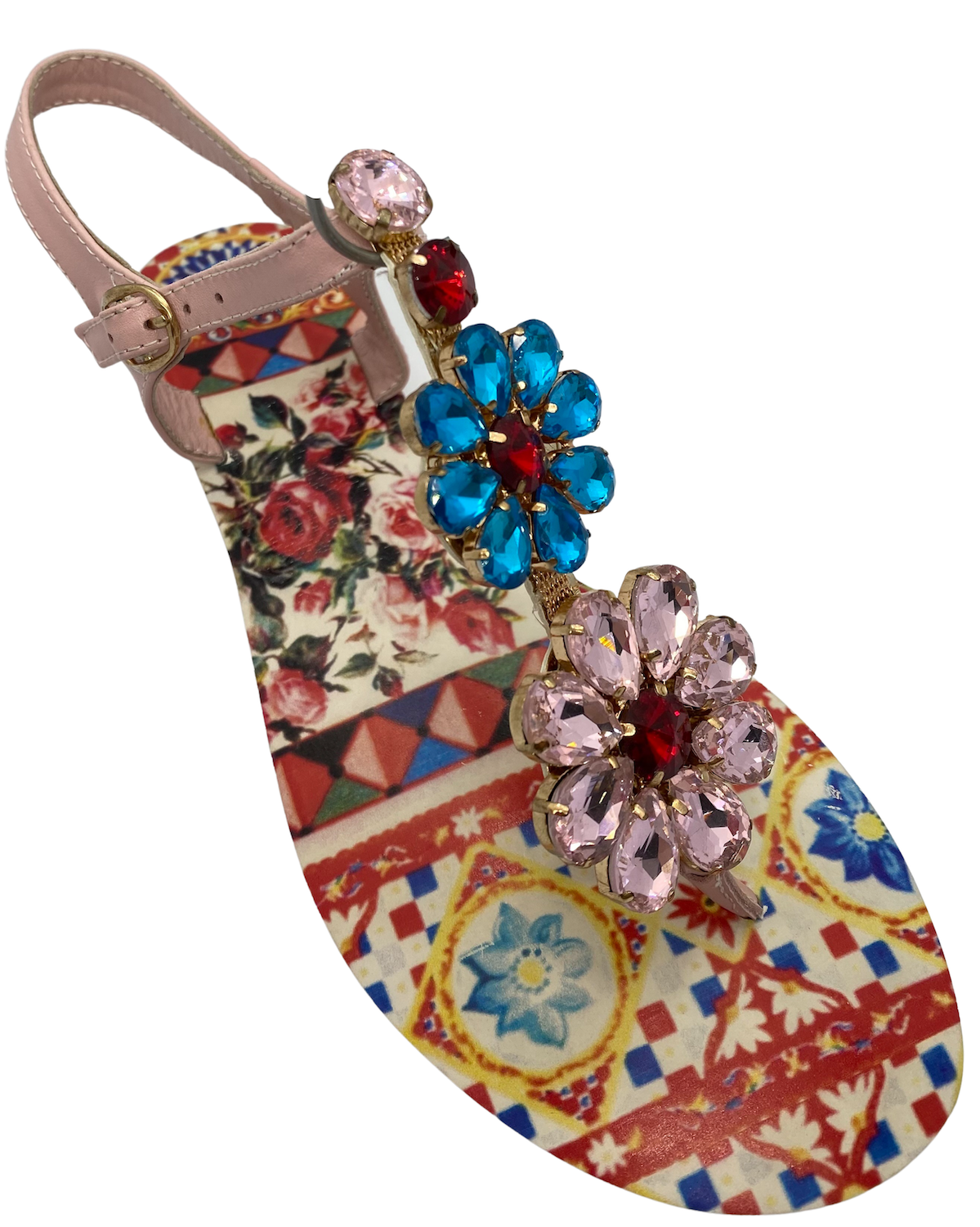 "kolorowe sandałki na białej podeszwie, zapinane na różowe skórzane paski, przód ozdobiony dwoma kwiatkami z kryształków ( różowo-turkusowych), roz. 40, nowe"