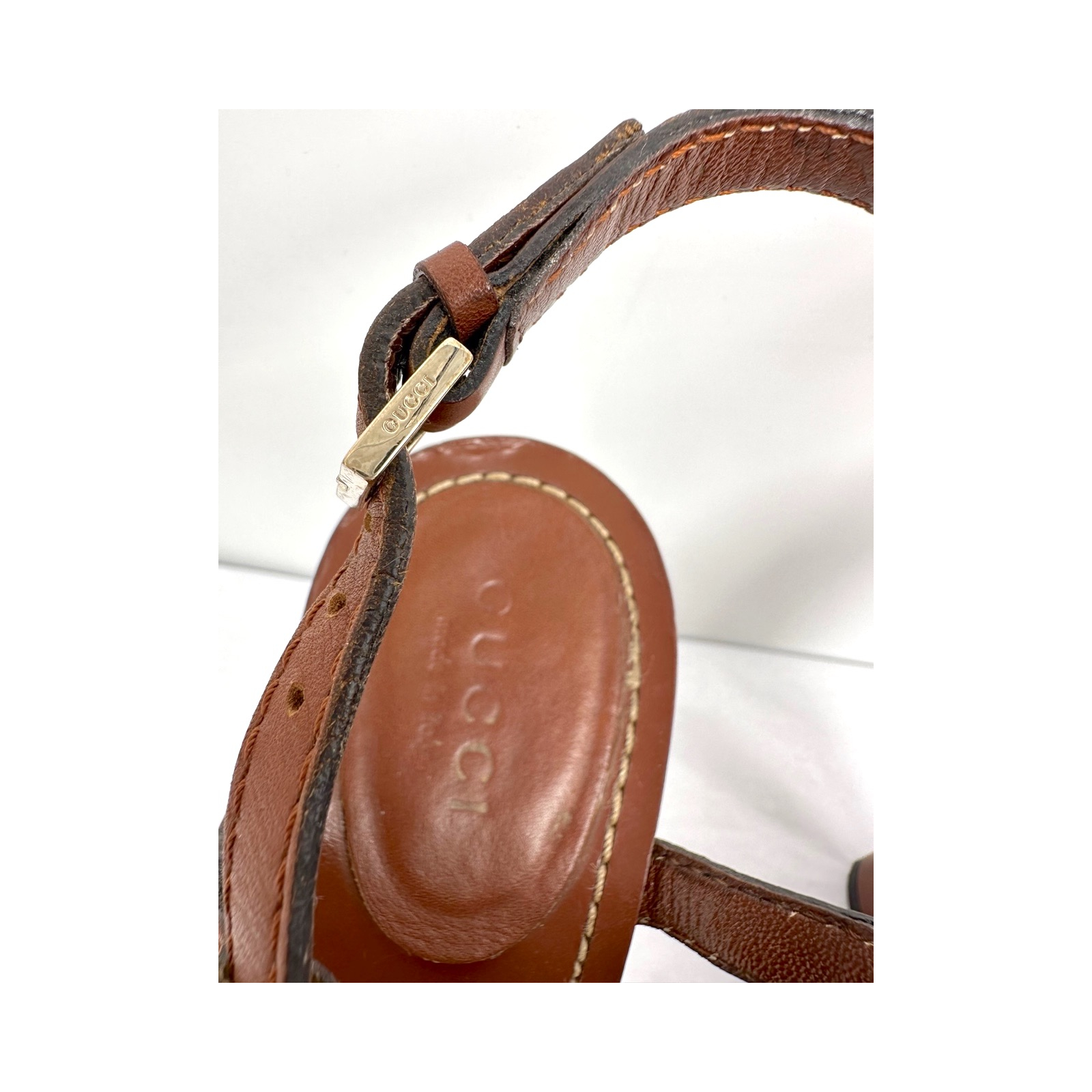 "brązowe skórzane sandałki na koturnie z skórzanym logo na przodzie, rozmiar 36c (pudełko)"