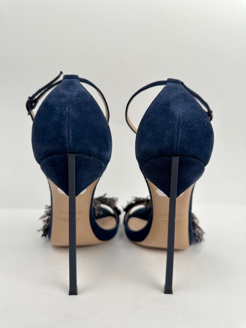 "granatowe zamszowe sandały na wysokim obcasie, zapinane wokół kostki, z przodu zdobienia w postaci szaro-granatowych kwiatków z cekinami. Rozmiar 39"
