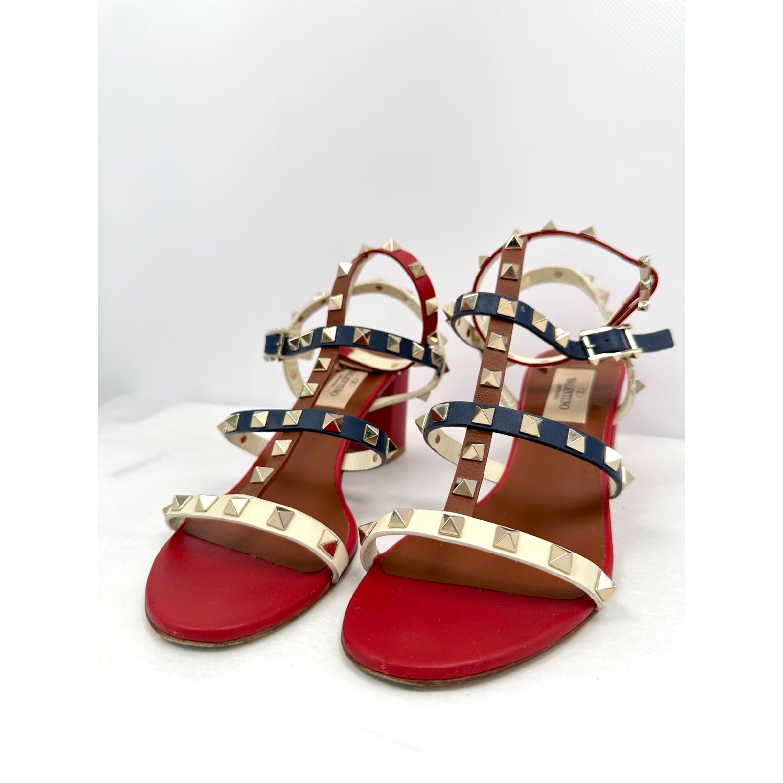 "sandałki z paskami w kolorach czerwono-biało-różowo-granatowym ozdobione ćwiekami, na niskim słupkowym obcasie, zapięcie wokół kostki, widoczne ślady użytkowania, stan dobry, pudełko w zestawie. Rozmiar 37 wys. obcasa 6,5 cm, dł. wkładki 24 cm."