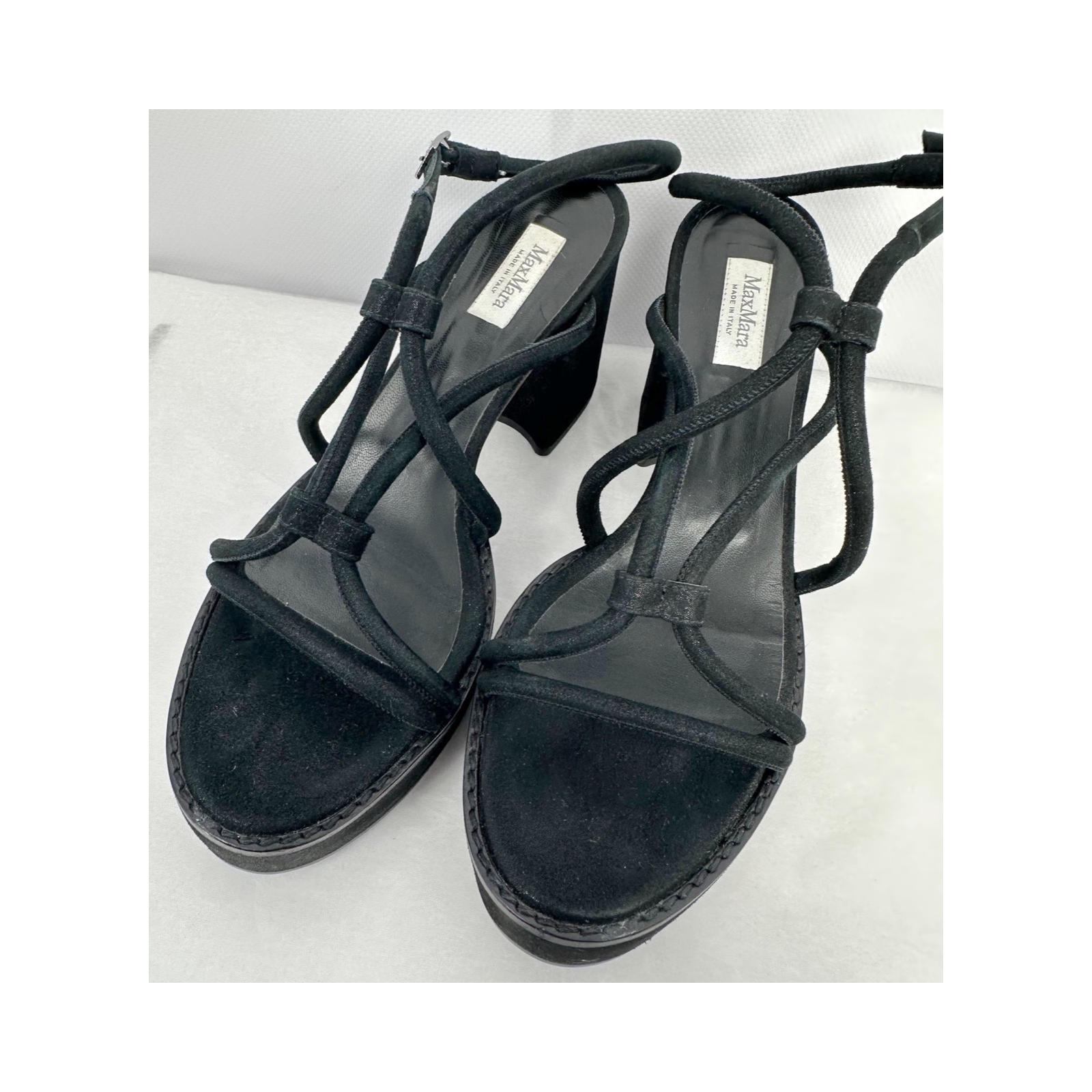"czarne sandały na platformie i słupku, rzemienie na przodzie, zapinane wokół kostki, rozmiar 37,5, wykonane ze skóry, dł. wkładki 25 cm."