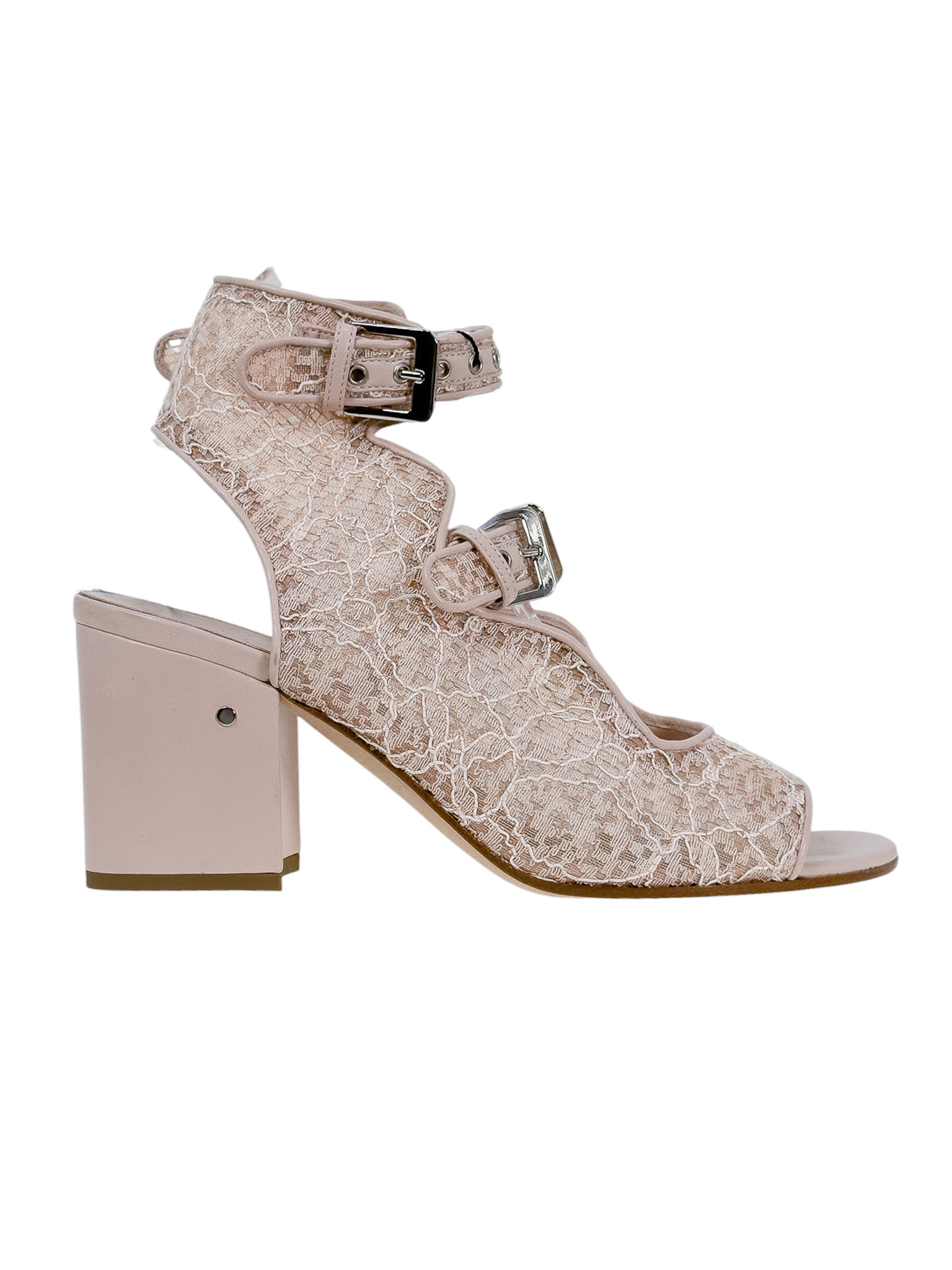 "Sandały na obcasie w kolorze pudrowego różu, ozdobione transparentną koronką, delikatnie zaokrąglone noski, wyższa cholewka, dwa regulowane paski wykończone srebrnymi sprzączkami na przodzie, odkryte palce oraz pięta, obcas klocek. Stan nowe z metką. Rozmiar 41, wysokość obcasa 7,5cm."