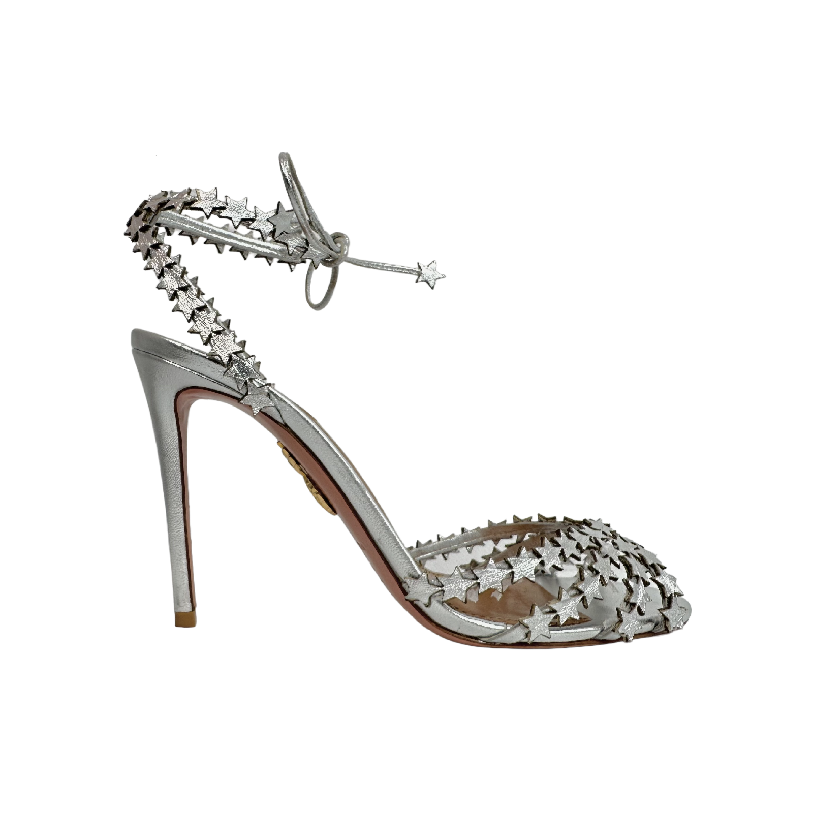 "Srebrne skórzane błyszczące sandały na obcasie, w motyw gwiazd, zaokrąglone noski, w zestawie z pudełkiem, rozmiar 37,5"