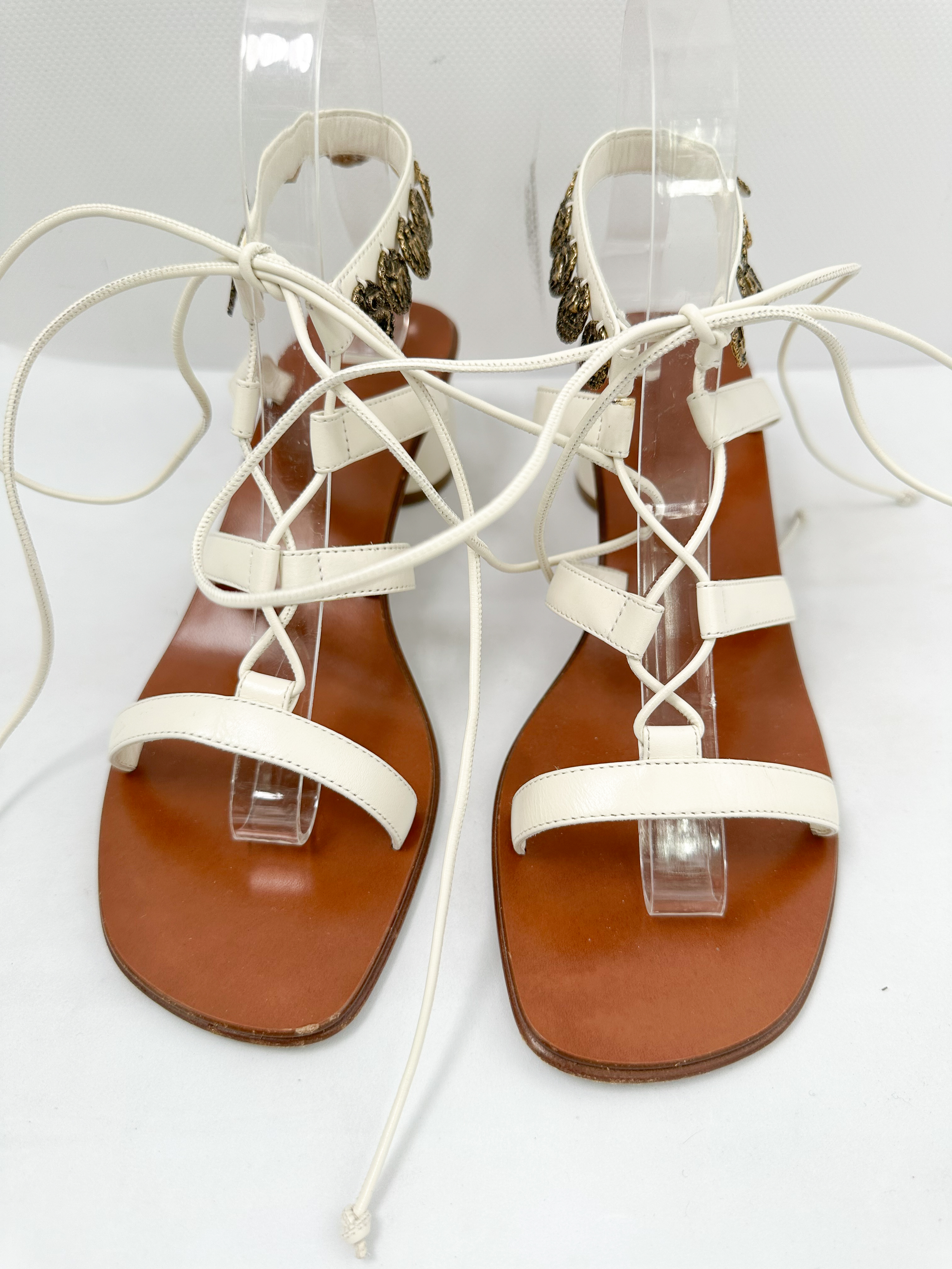 "Białe skórzane sandały na obcasie ozdobione w tylnej części złotymi medalikami z grafiką znaków zodiaku oraz liter tworzących logo marki, wiązane z przodu wokół kostki, ścięte noski, odkryte palce oraz pięta, paski w przedniej części, brązowa skórzana wkładka, delikatnie zaokrąglony biały obcas, używane. Stan bardzo dobry, noszą ślady użytkowania na podeszwie. Rozmiar 37,5."