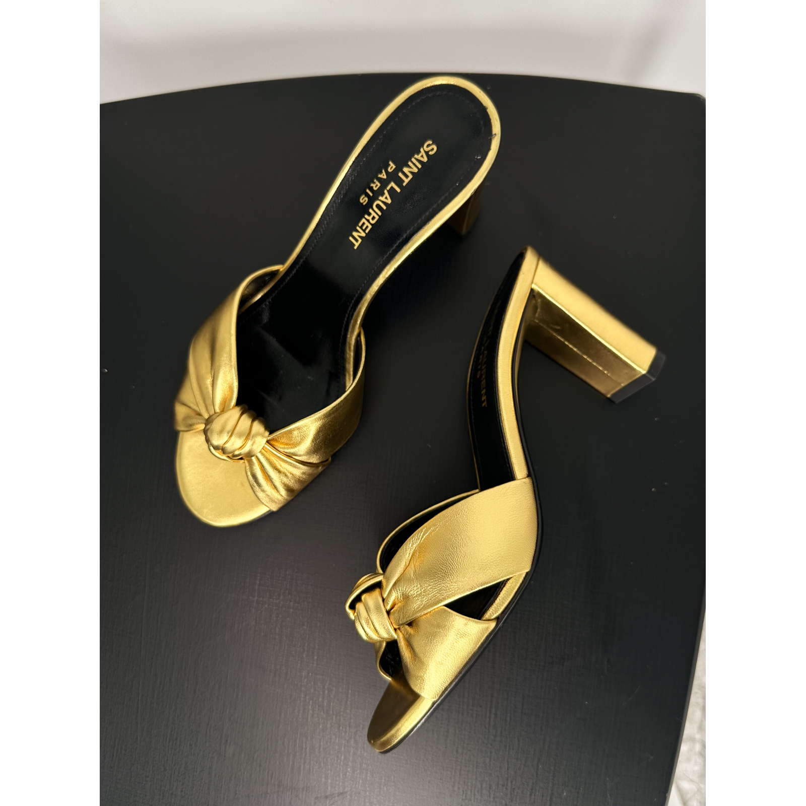 "Złote klapki na obcasie, ozdobny węzeł z przodu. Rozmiar 36. Używane, posiadają rysy. Stan bardzo dobry. Posiadają pudełko w zestawie. Model BIANCA."