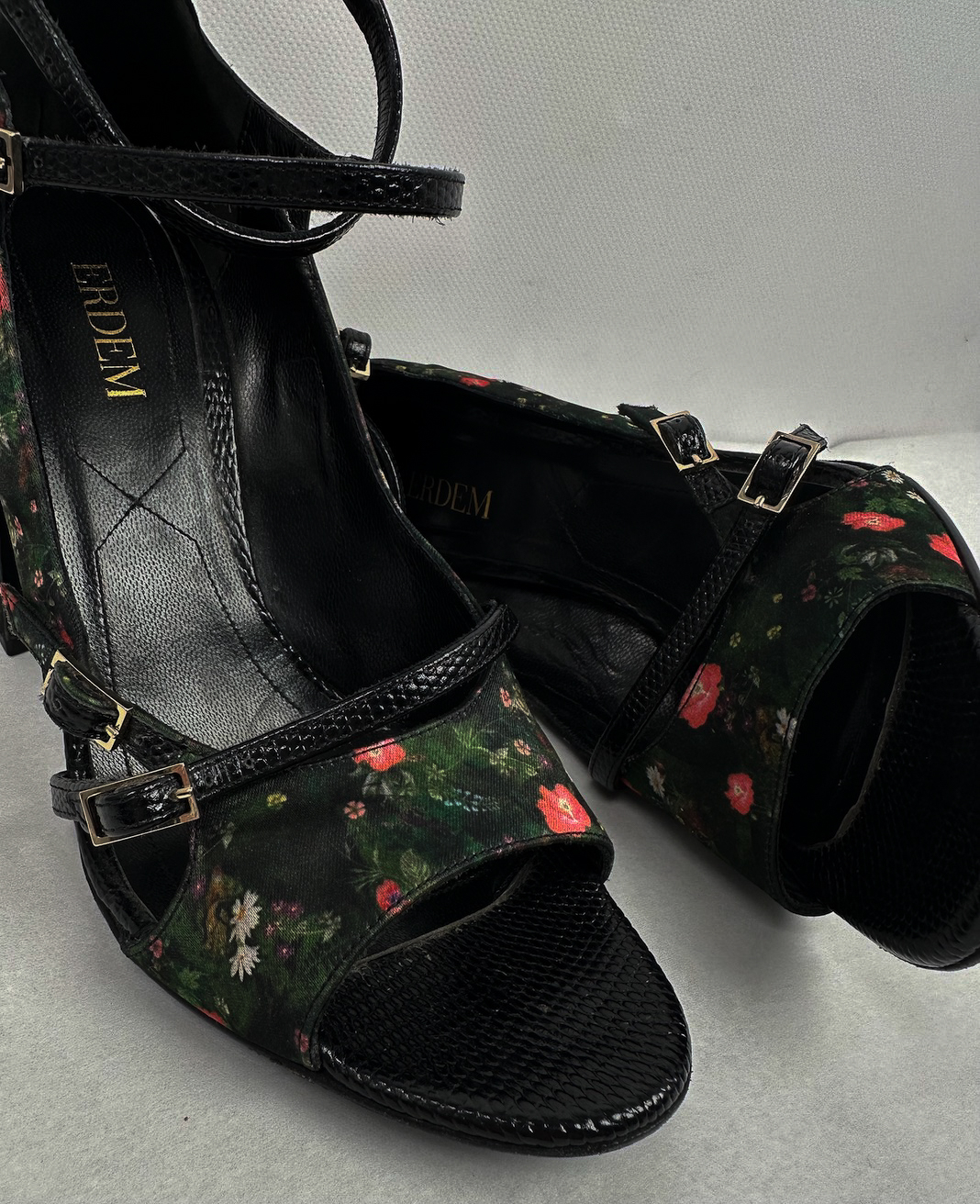 "Zielono-czarne sandały w motyw kolorowych kwiatów, wykonane z łączonych materiałów, delikatnie wygięty obcas, zaokrąglone noski, odkryte palce, wycięcia po bokach, trzy regulowane paski wykonane ze skóry wężą ze srebrną sprzączką, zakryta pięta, używane. Stan bardzo dobry, delikatnie przetarte noski. Rozmiar 37."