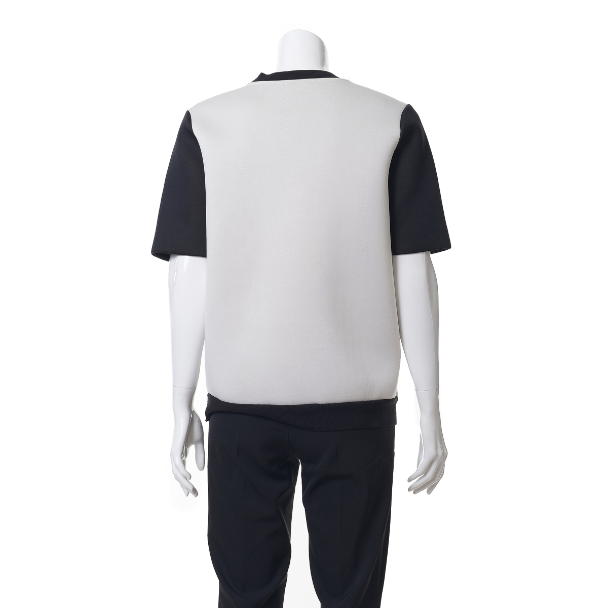 "Bluzka z krótkim rękawem wykonana ze 100% poliestru przypominającego piankę. Czarny przód z nadrukiem , biały tył."