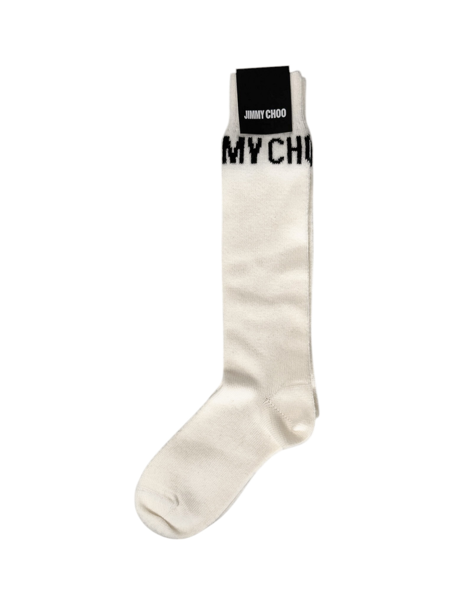 "Kremowe wełniane wysokie skarpety, ozdobione czarnym logo marki, wykończone ściągaczem. Stan nowe z metką."