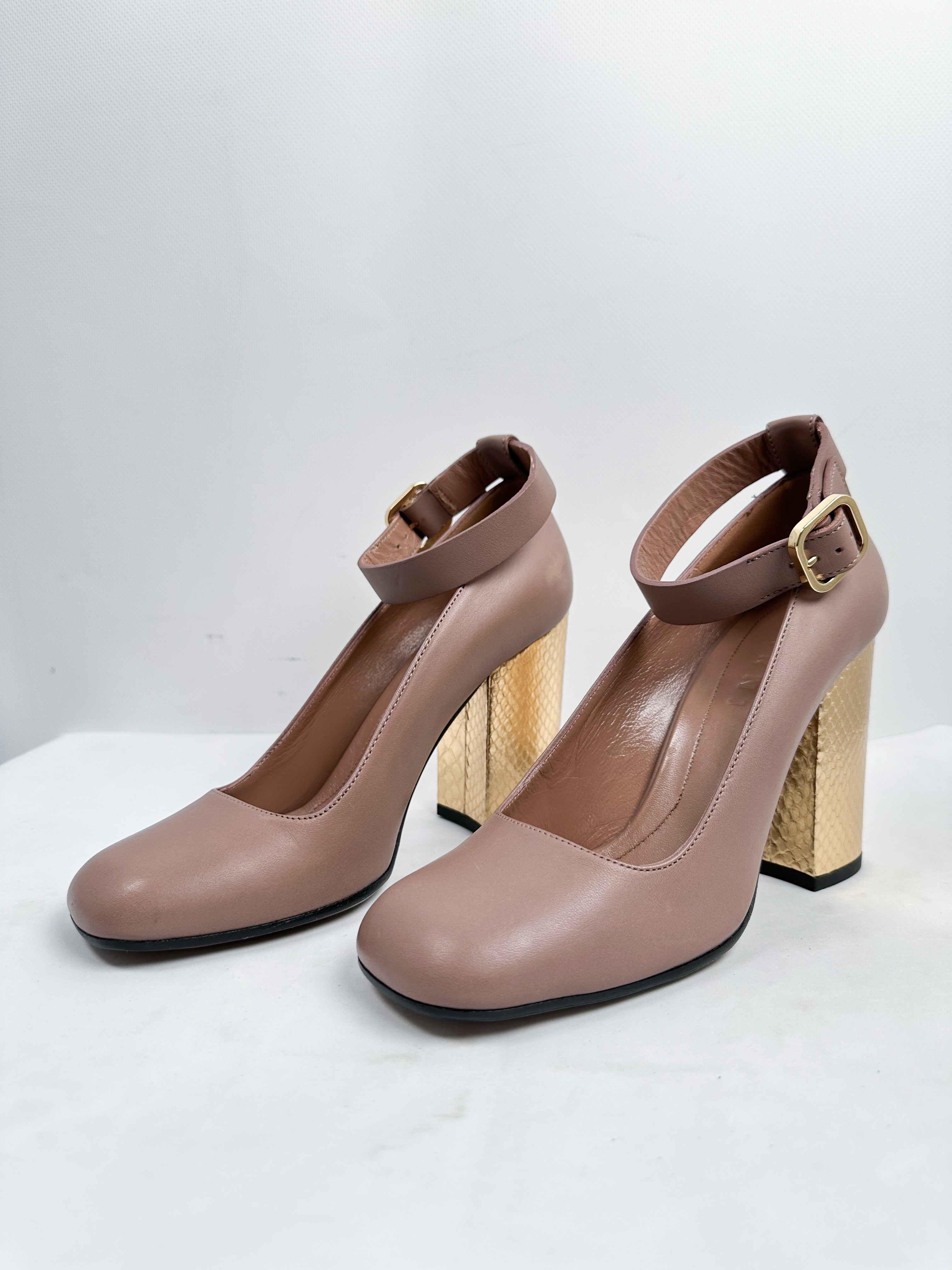 "Skórzane czółenka w kolorze brudnego różu na złotym błyszczącym obcasie o motywie zwierzęcym, obcas słupek, skórzany pasek wykończony złotą sprzączką wokół kostki, ścięte noski, w zestawie z pudełkiem, używane. Stan bardzo dobry, delikatnie przetarta skóra w kilku miejscach oraz podeszwa. Rozmiar 37."