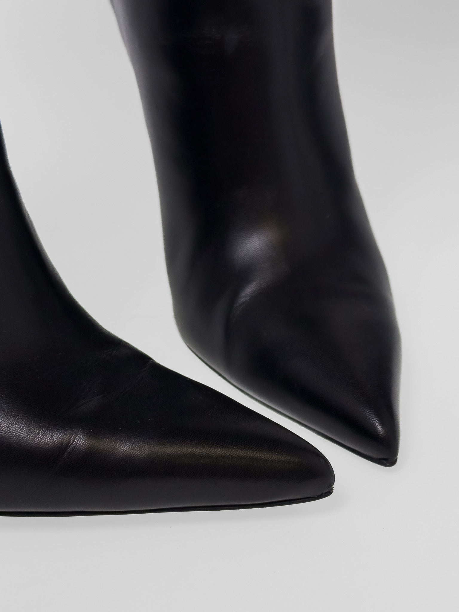 "Czarne skórzane kozaki na obcasie, nosek w szpic, wsuwane, miękka skóra, zakrzywiony obcas- szpilka, wykończone przeszyciami, w zestawie z pudełkiem, workami przeciwkurzowymi oraz dowodem zakupu, używane. Stan dobry, marszczenia na skórze, przetarcia na podeszwie. Rozmiar 38,5."