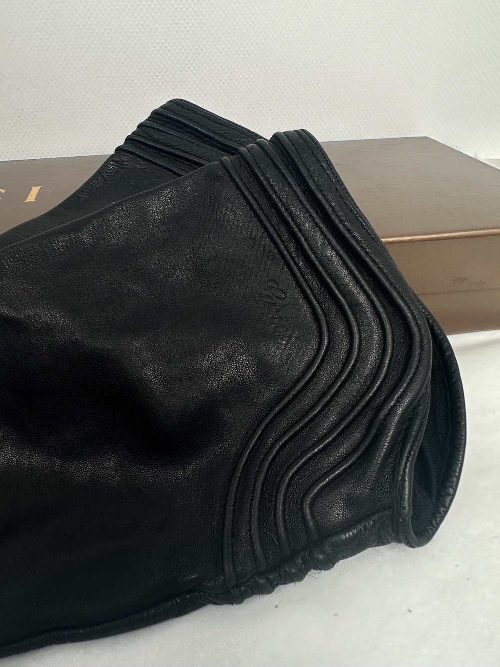 "Czarne skórzane rękawiczki, długie, miękka skóra, dekoracyjne poziome przeszycia na dłoni oraz na wykończeniu, ozdobione wytłaczanym logo marki, w zestawie z pudełkiem, używane. Stan bardzo dobry, delikatnie pomarszczona skóra na palcach. Rozmiar 7,5."