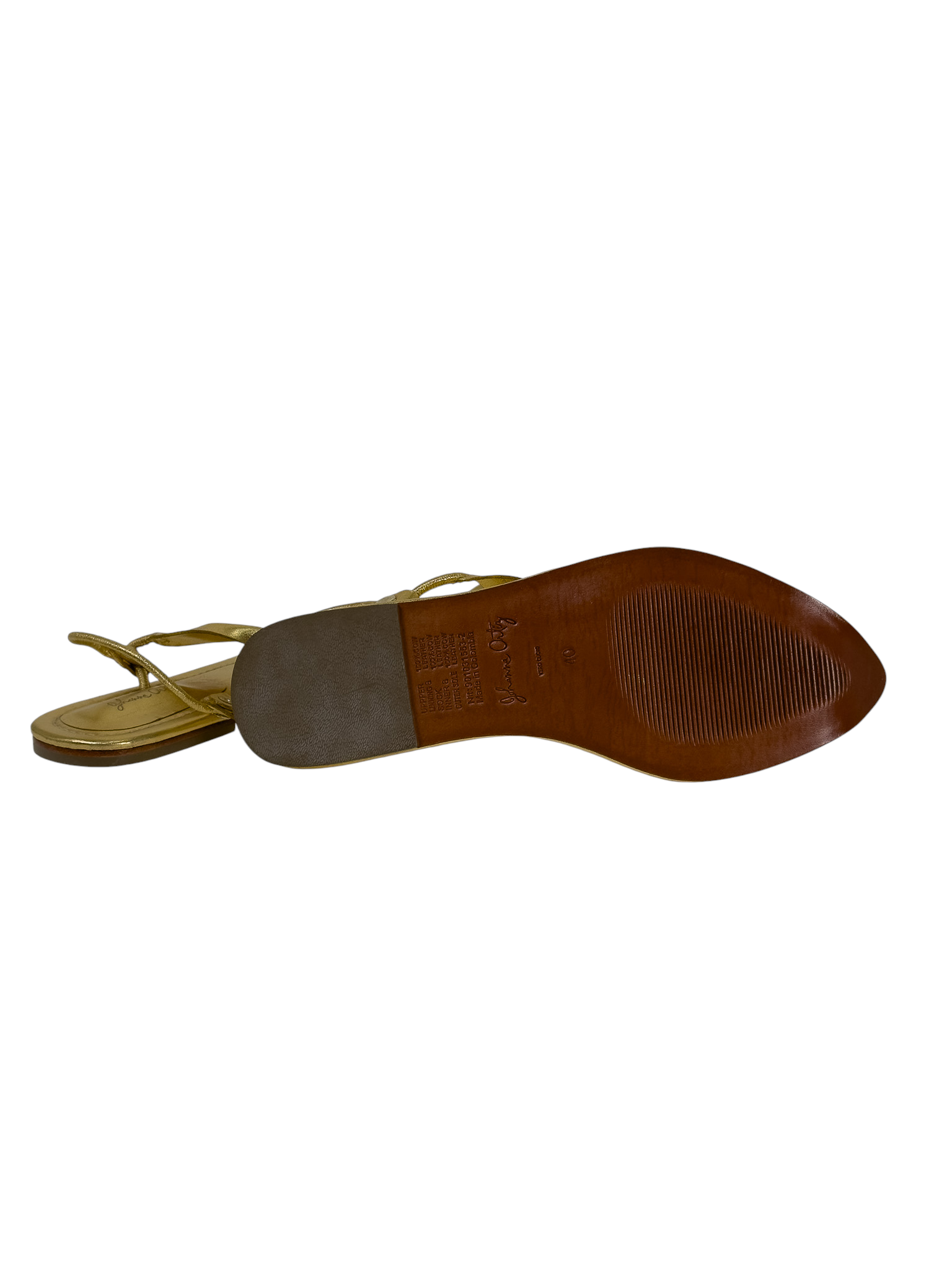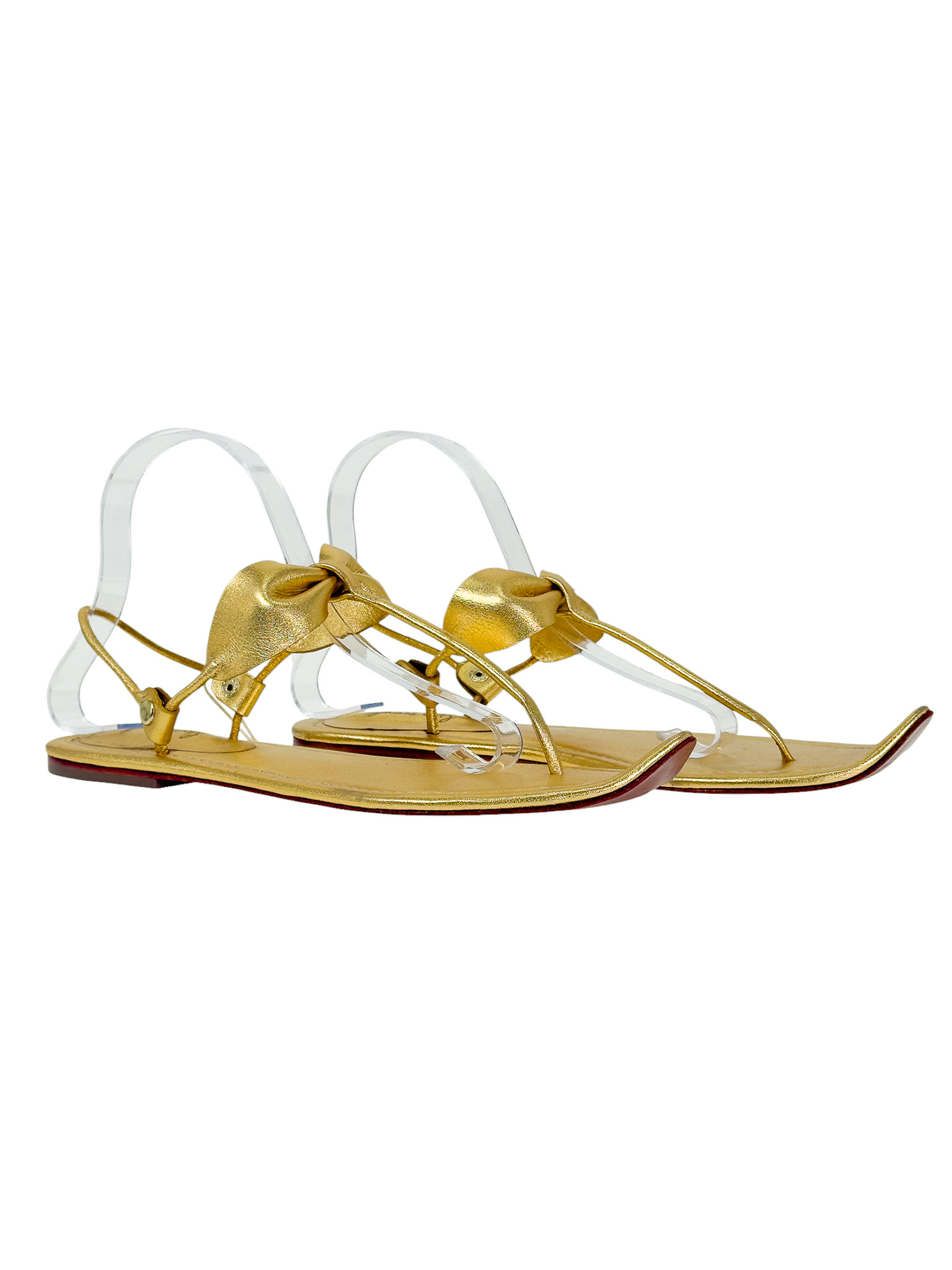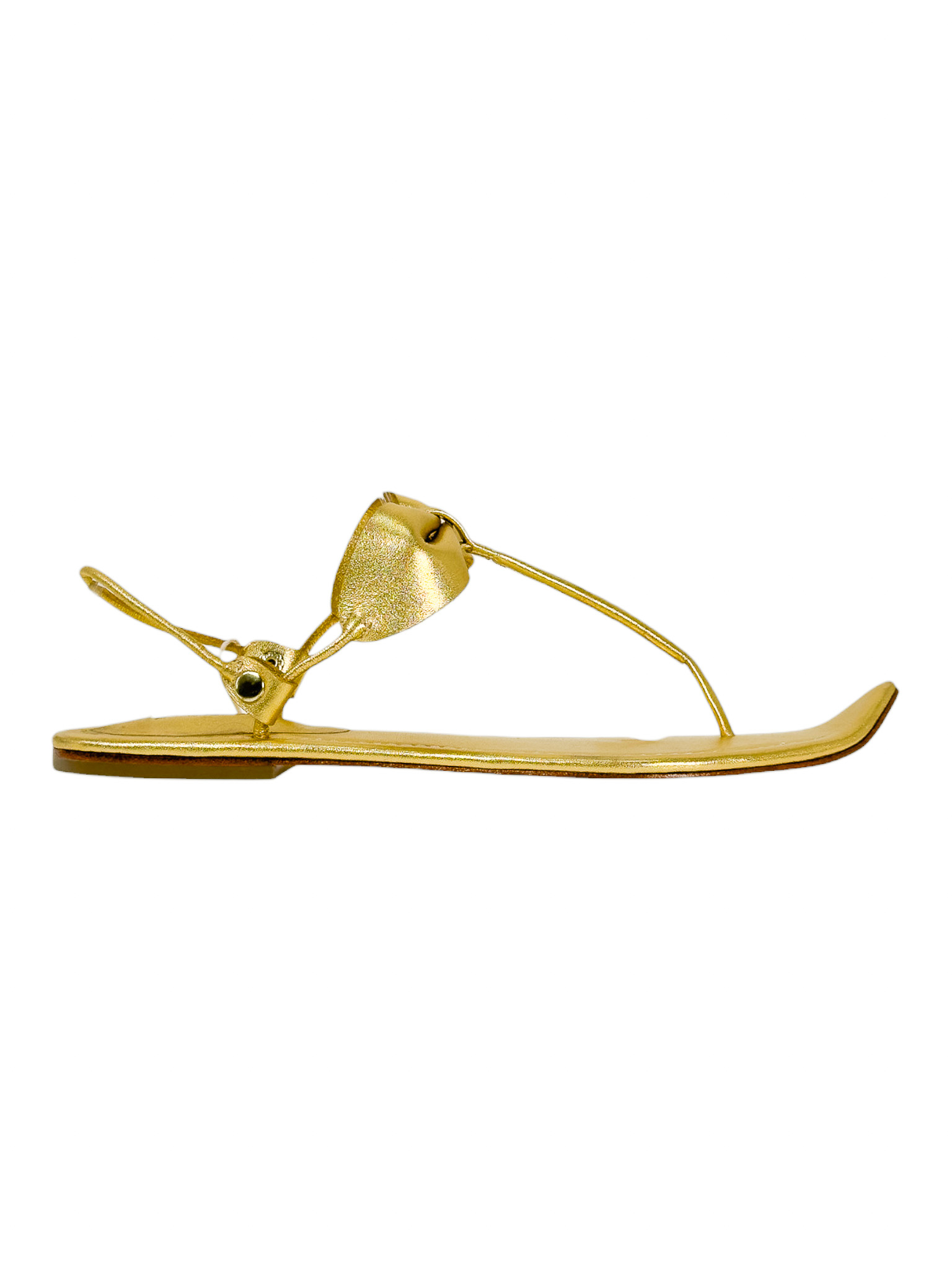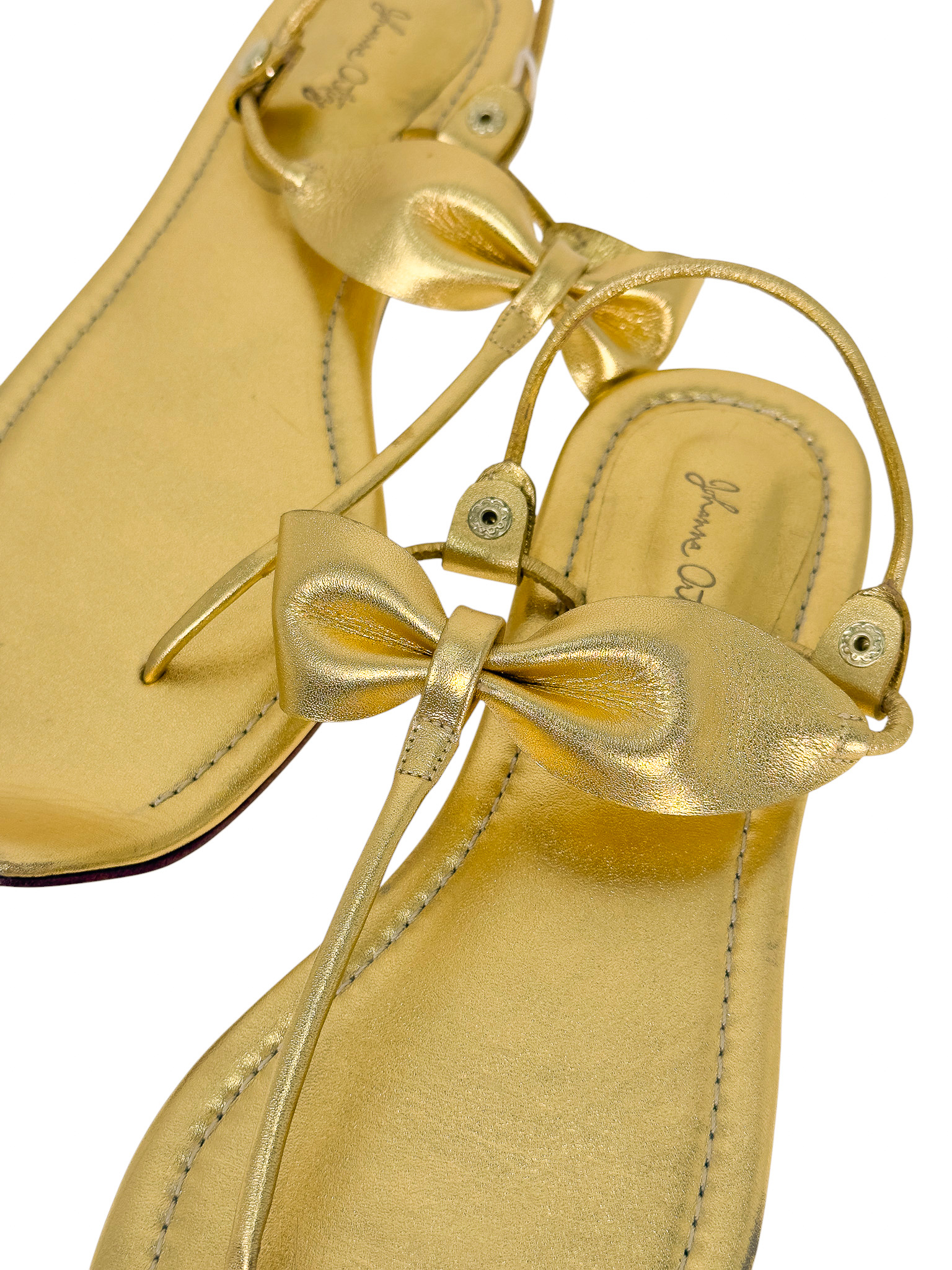 "Złote skórzane sandały, typu japonki, ozdobione kokardą na paskach, zakrzywione noski w szpic, odkryte palce oraz pięta, niski obcas, w zestawie z workiem przeciwkurzowym. Stan nowe. Rozmiar 40."