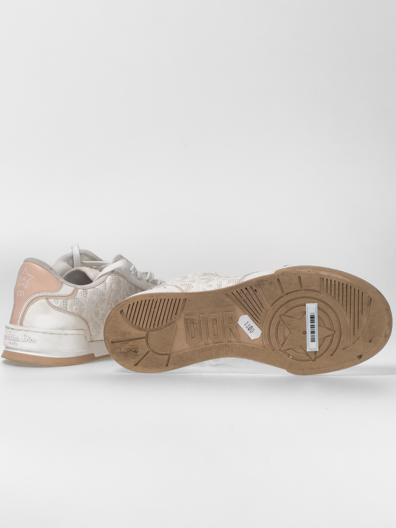 "Białe skórzane sneakersy ozdobione wytłaczanym logo marki, zaokrąglone noski, wykończone wstawkami w kolorze brudnego różu, sznurowane, białe sznurówki, naszywka z logo marki na języku oraz w tylnej części, używane. Stan dobry, marszczenia na skórze, zabrudzenia na podeszwie. Rozmiar 37."