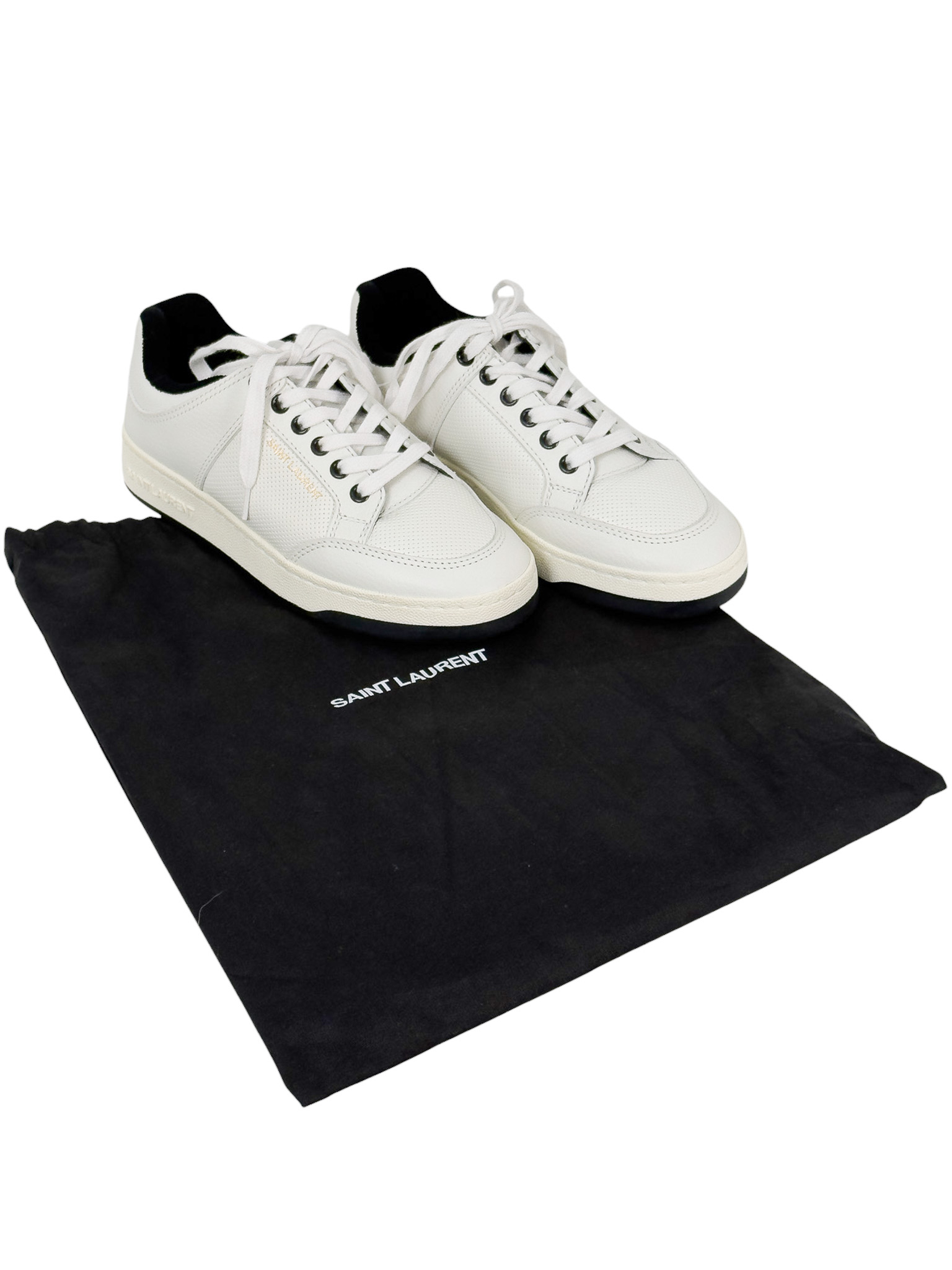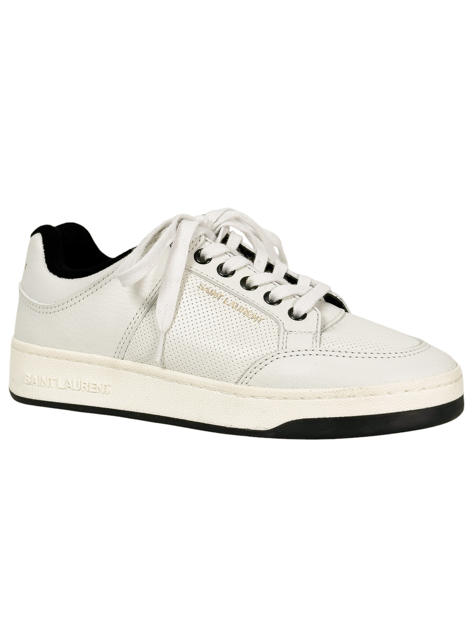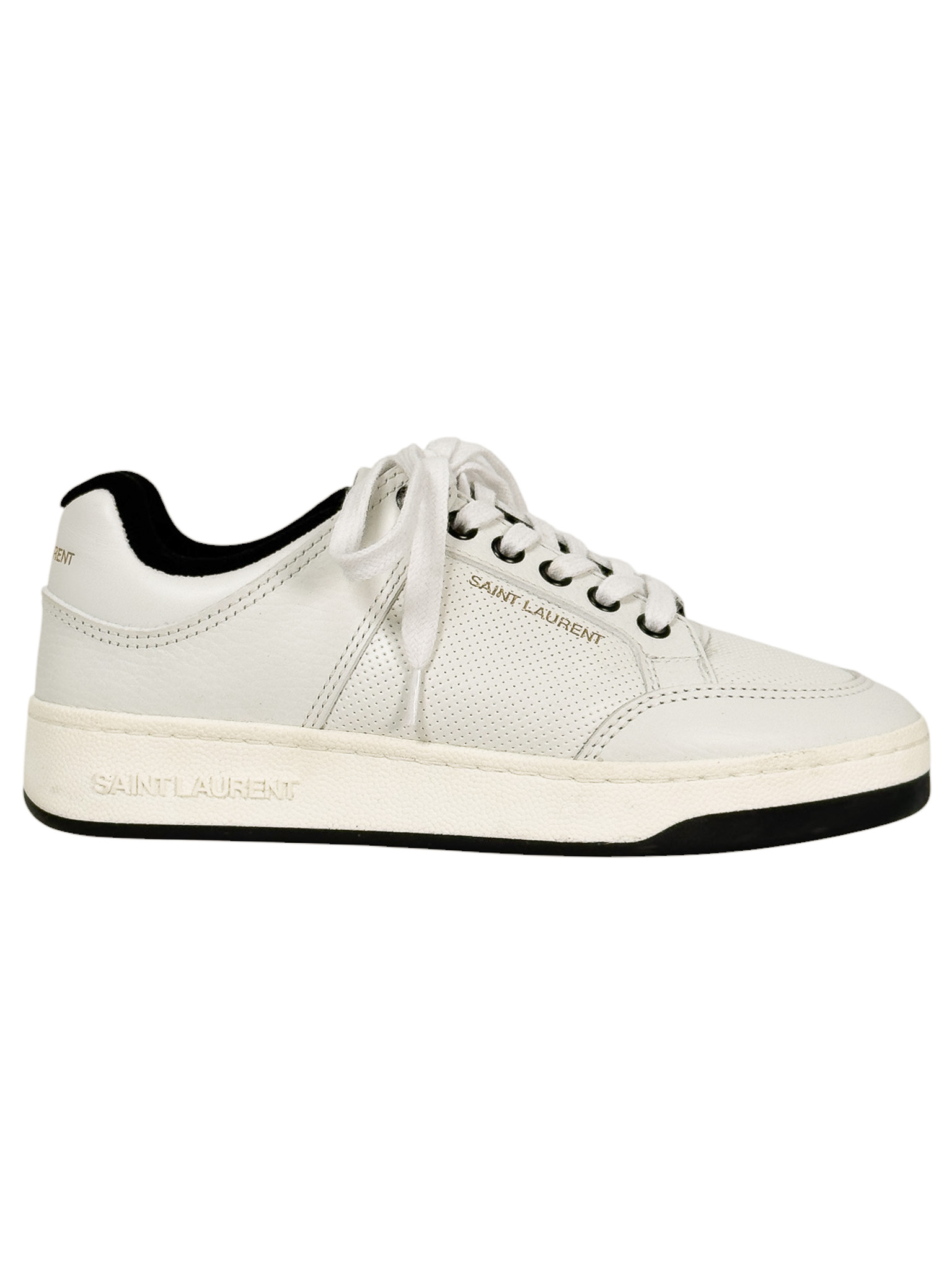 "Białe skórzane sneakersy, sznurowane, złote logo marki w bocznej części oraz na pięcie, częściowo wykończone dziurkami, zaokrąglone noski, czarne wnętrze. Stan bardzo dobry, posiadają delikatne ślady użytkowania, zabrudzenia na podeszwie, w zestawie z workiem przeciwkurzowym. Rozmiar 36."