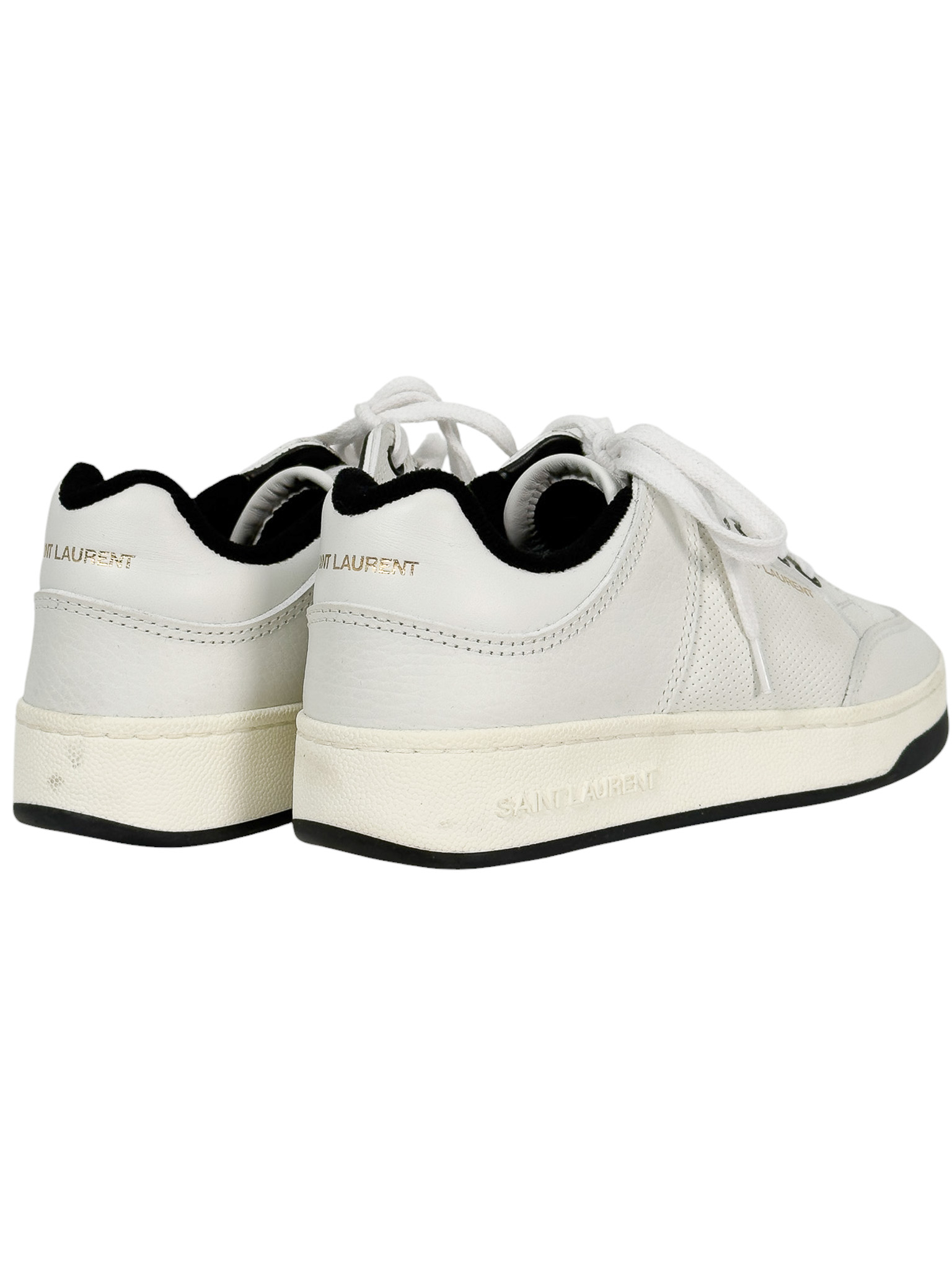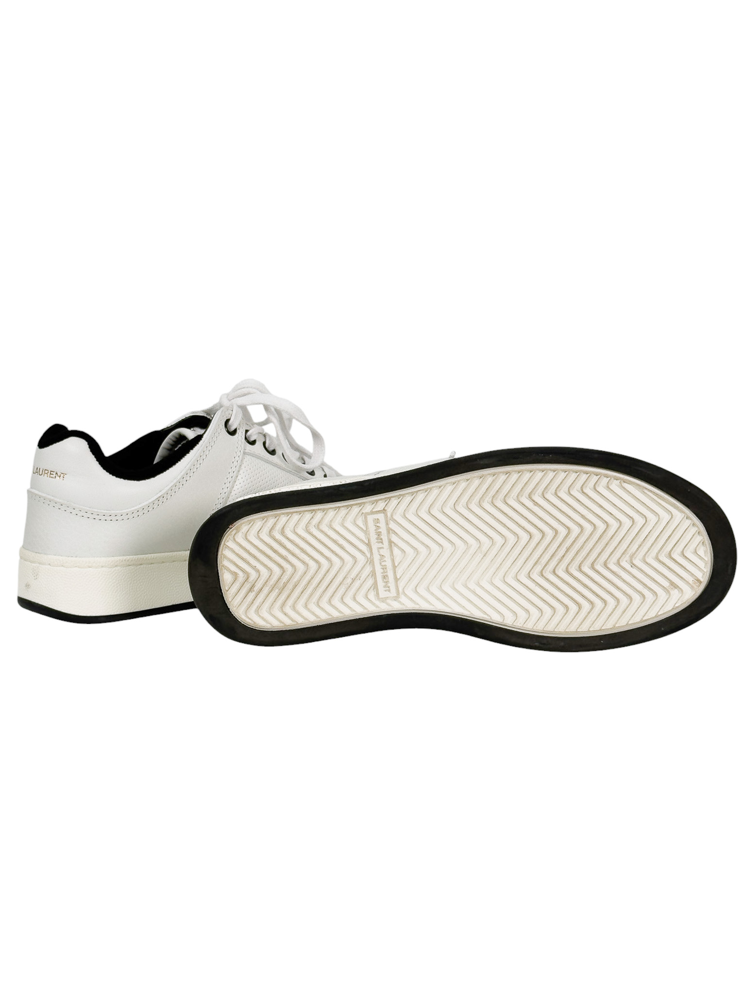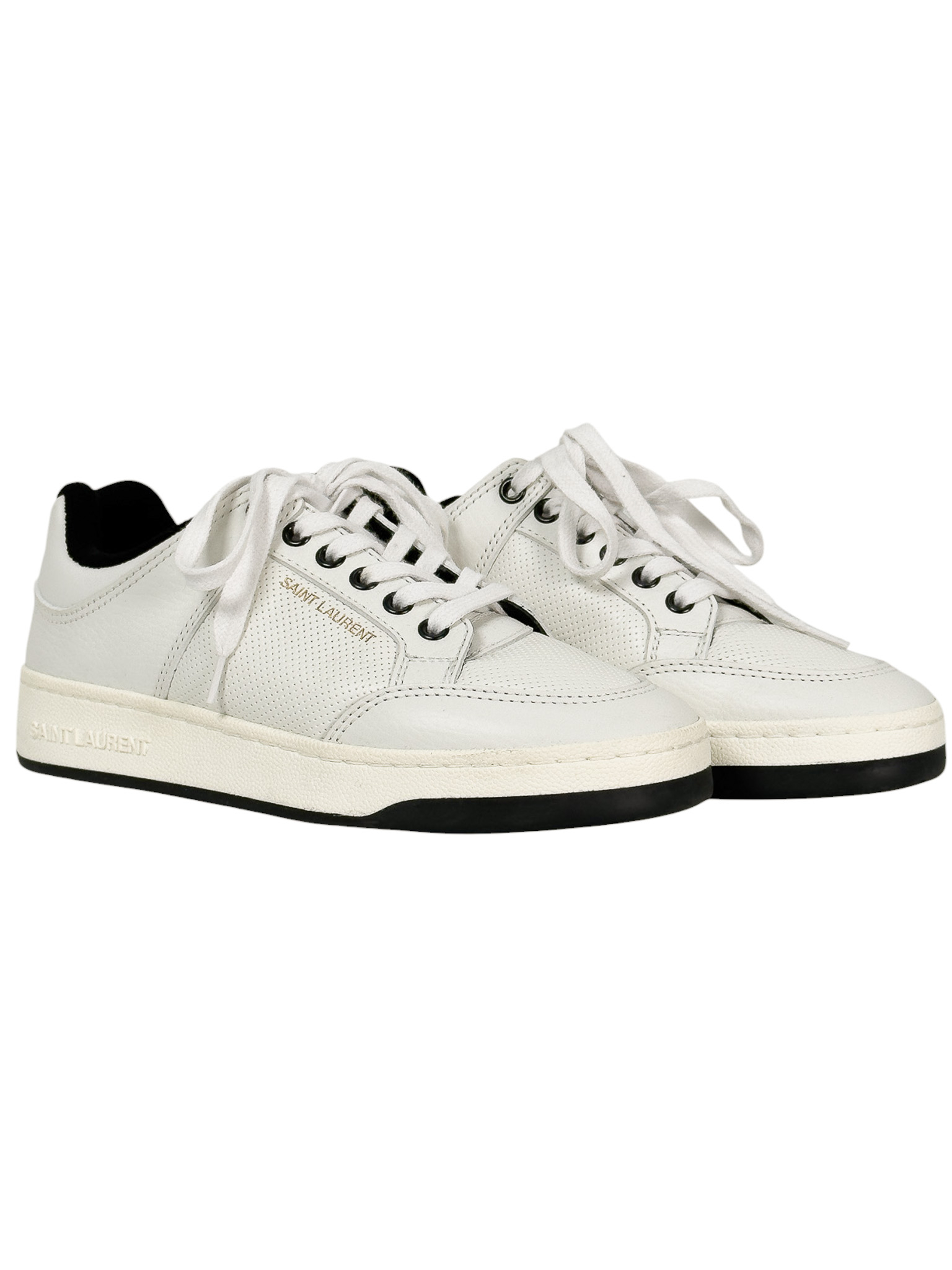 "Białe skórzane sneakersy, sznurowane, złote logo marki w bocznej części oraz na pięcie, częściowo wykończone dziurkami, zaokrąglone noski, czarne wnętrze. Stan bardzo dobry, posiadają delikatne ślady użytkowania, zabrudzenia na podeszwie, w zestawie z workiem przeciwkurzowym. Rozmiar 36."