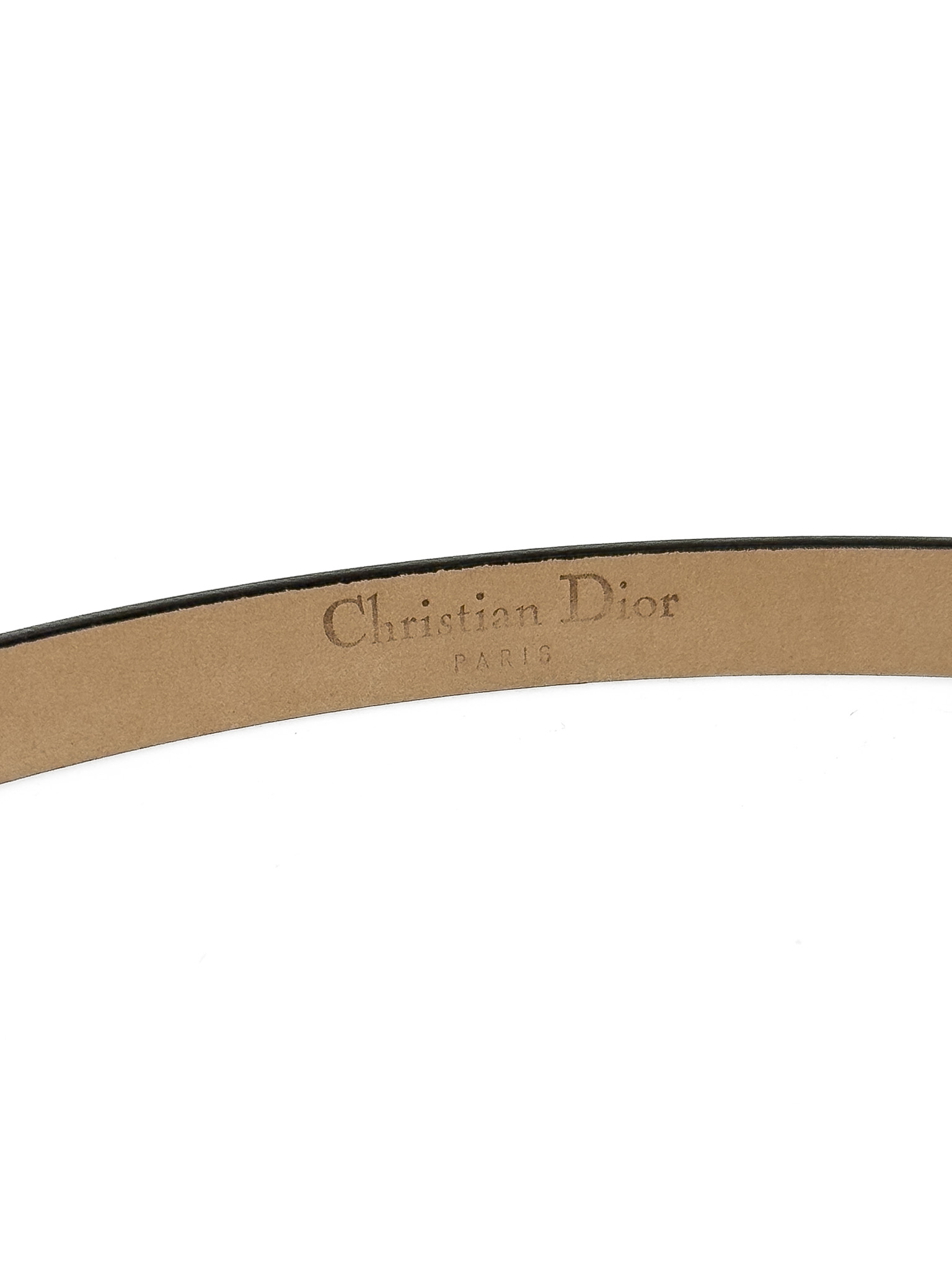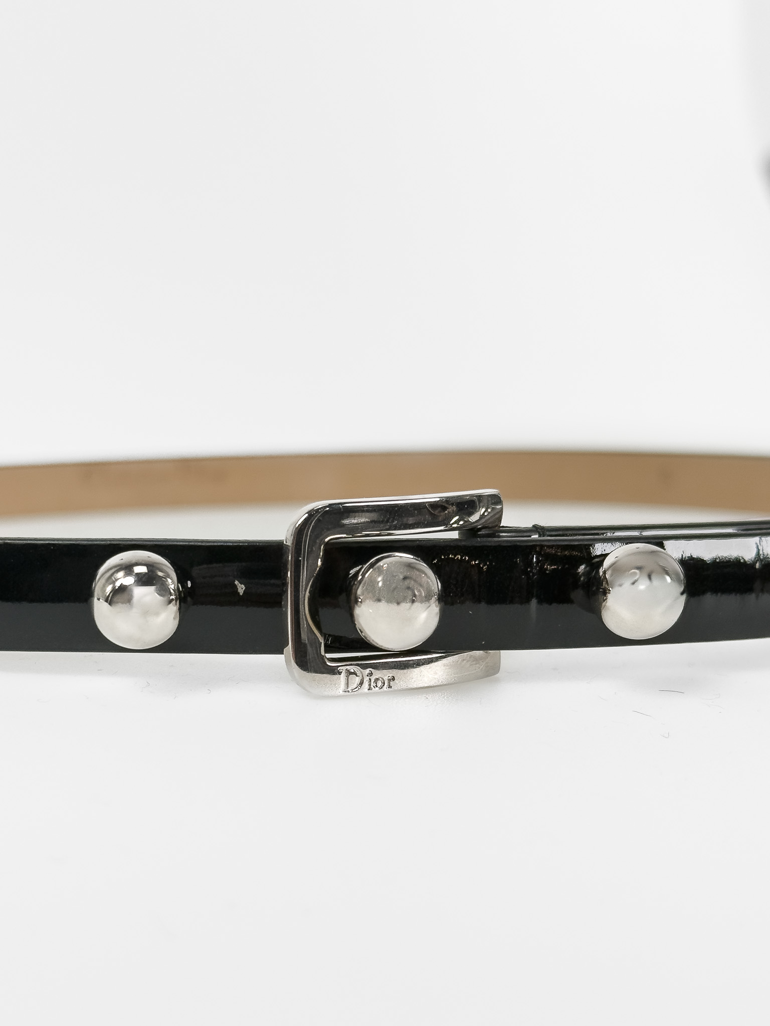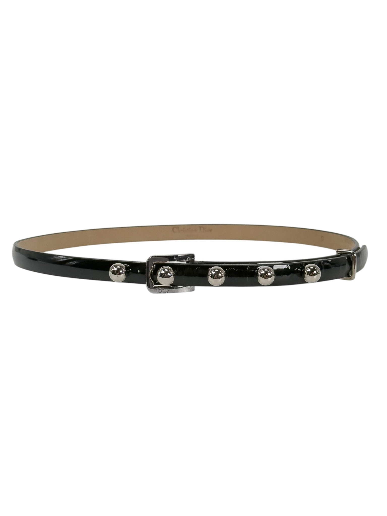"Czarny, lakierowany skórzany pasek, zapinany na srebrne kulki oraz logowaną klamrę. Stan bardzo dobry. Rozmiar S."