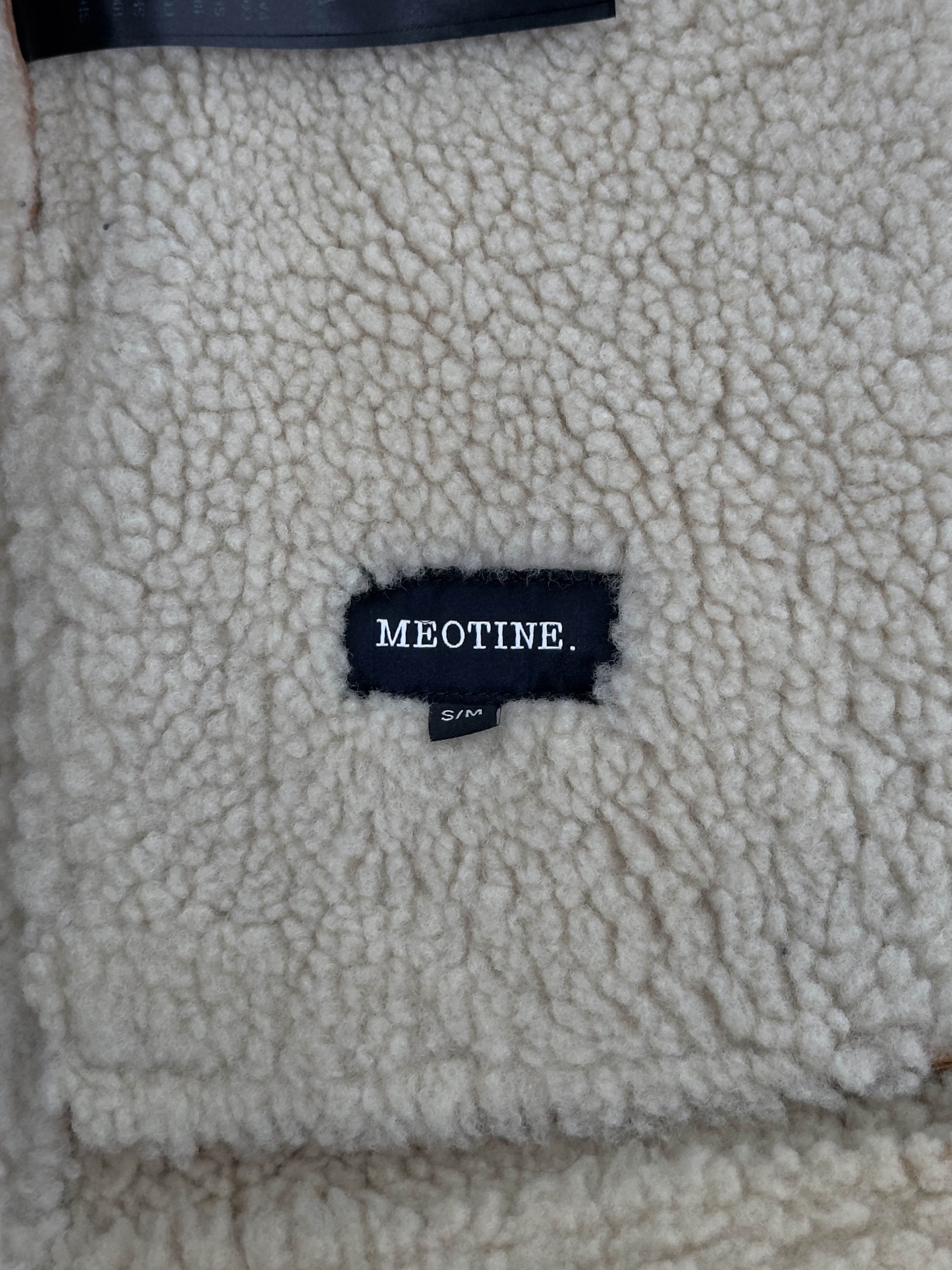 "Ciemnobrązowy skórzany płaszcz typu kożuch, wykończony kremowym barankiem od wewnętrznej strony, na mankietach oraz na kołnierzu, dwurzędowy, zapinany na skórzane guziki, długość midi, dwie kieszenie po bokach, marszczenie oraz rozporek z tyłu, patki na ramionach, wykończony skórzanymi wstawkami, dekoracyjne przeszycia. Rozmiar z metki S/M. Skład: 100% strzyżona owcza skóra. Wymiary: szerokość mierzona od pachy do pachy 50cm, długość całkowita 123cm."