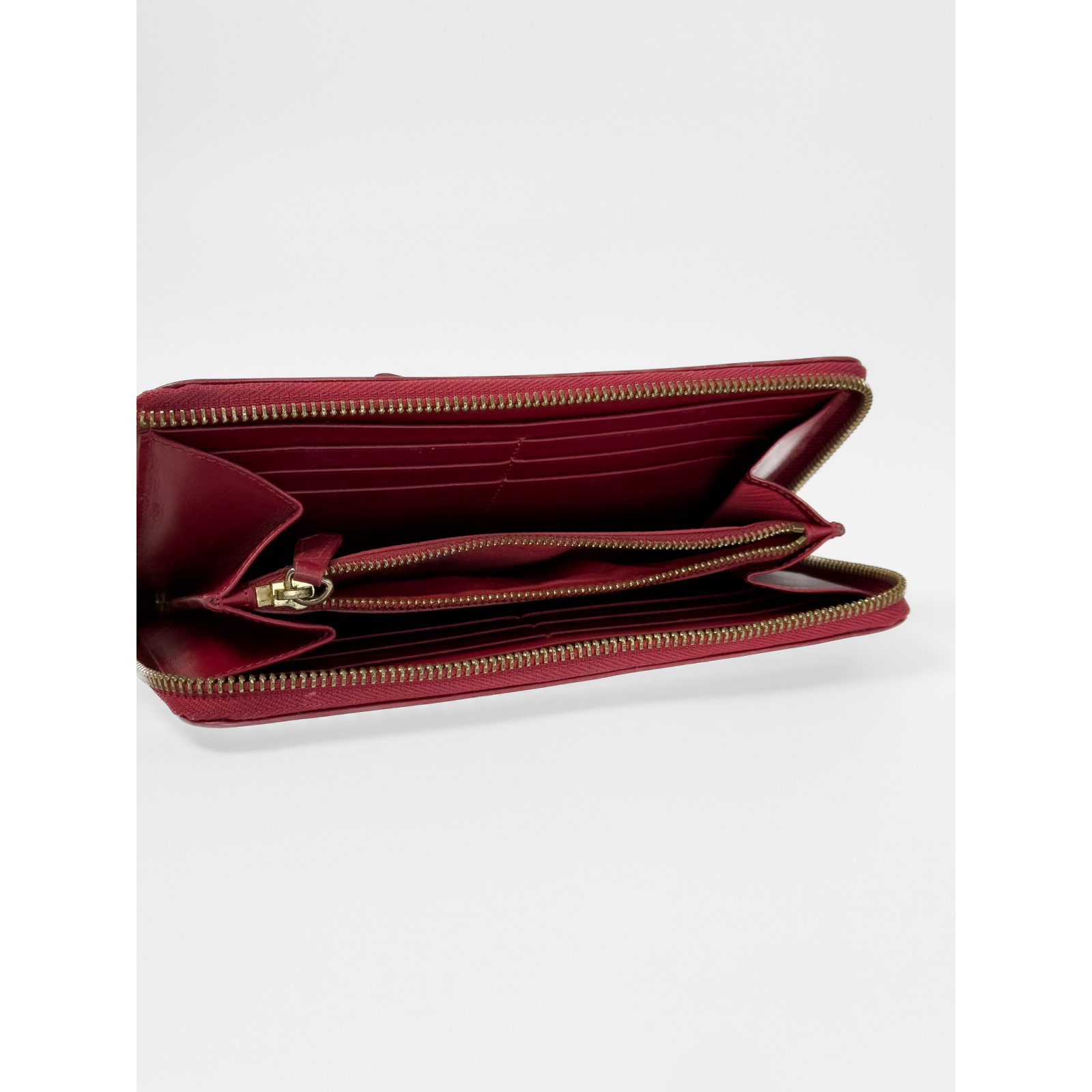 "Czerwony duży skórzany portfel ozdobiony kokardą oraz złotymi dżetami, prostokątny kształt, zapinany na złoty logowany suwak, wytłaczane logo marki w tylnej części, wewnątrz zasuwana kieszeń na monety, przegrody na karty oraz banknoty, używany. Stan dobry, delikatne rysy na skórze oram metalowych elementach, przetarcia na rogach. Wymiary: szerokość 19,5cm, wysokość 10,5cm."