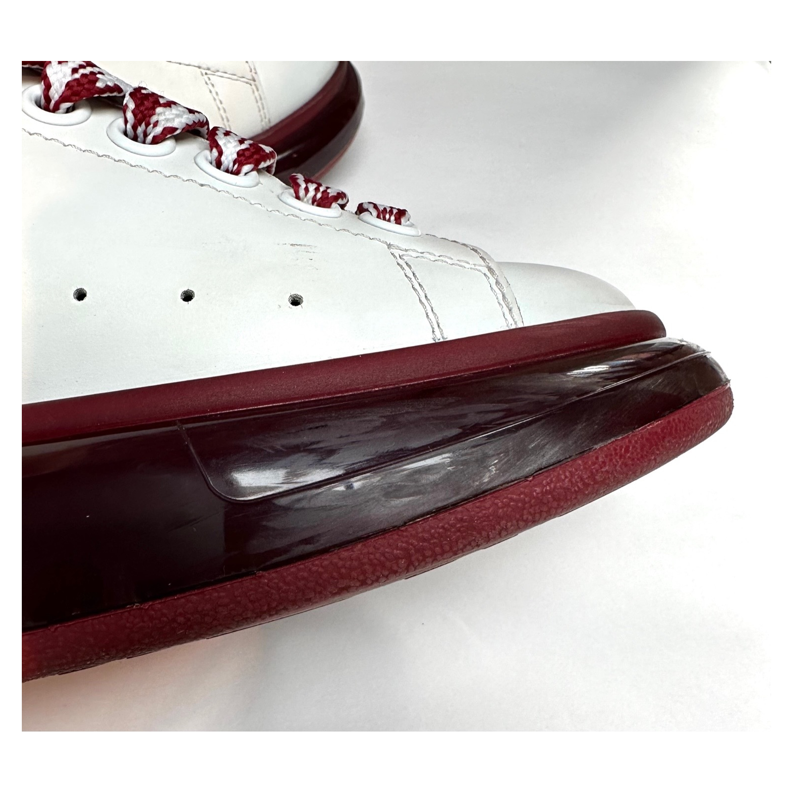 "biało bordowe sneakersy, sznurowane, masywna podeszwa, przód skórzany, zamszowa wstawka z logiem na pięcie, używane, stan bardzo dobry, widoczne rysy na podeszwie, pudełko w zestawie. Rozmiar 38,5."