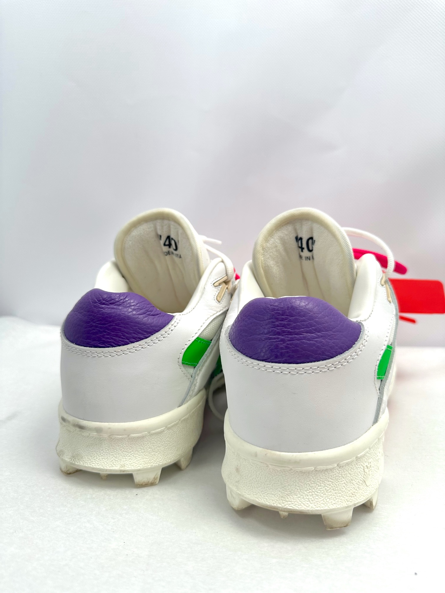 "białe sneakersy z kolorowymi wstawkami, zielony i fiolet, sznurówki w kolorze neonowego różu, antypoślizgowa podeszwa, stan dobry, widoczne drobne zabrudzenia. Rozmiar 40."