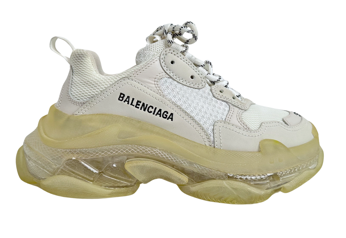 "Białe sneakersy z jasnożółtą transparentną podeszwą, sznurowane, ciężkie, wysoka, gumowa podeszwa, wykończone siateczką, czarny wyszyty rozmiar na przodzie, zaokrąglone noski, skórzane piaskowe wstawki, czarne logo z boku oraz transparentne na tylnej części, w zestawie z workiem przeciwkurzowym oraz pudełkiem, używane. Stan bardzo dobry, lekko wytarta podeszwa. Rozmiar 38. Model: Triple S."